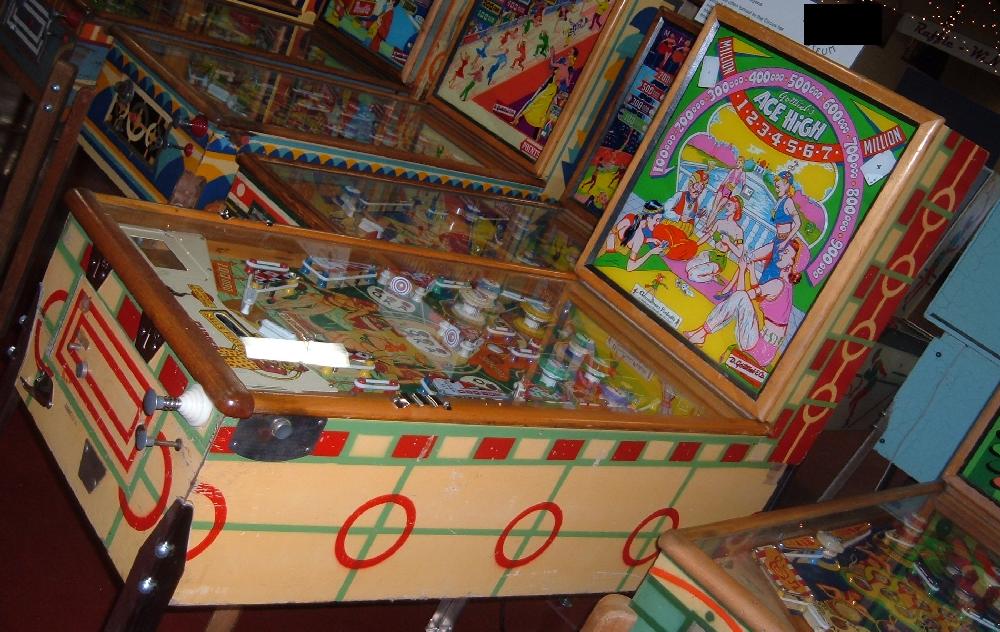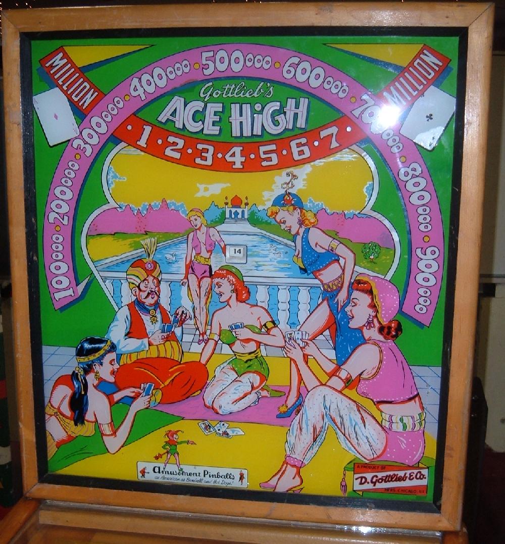 Description: Ace High, 2/57, 2100 produced, 2 gobble holes. Last single player game to have power to the flippers after the game is finished. woodrail pinball. Artwork by Roy Parker. If you have a Gottlieb Ace High pinball for sale please contact me at cfh@provide.net