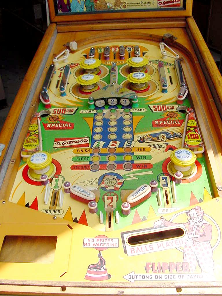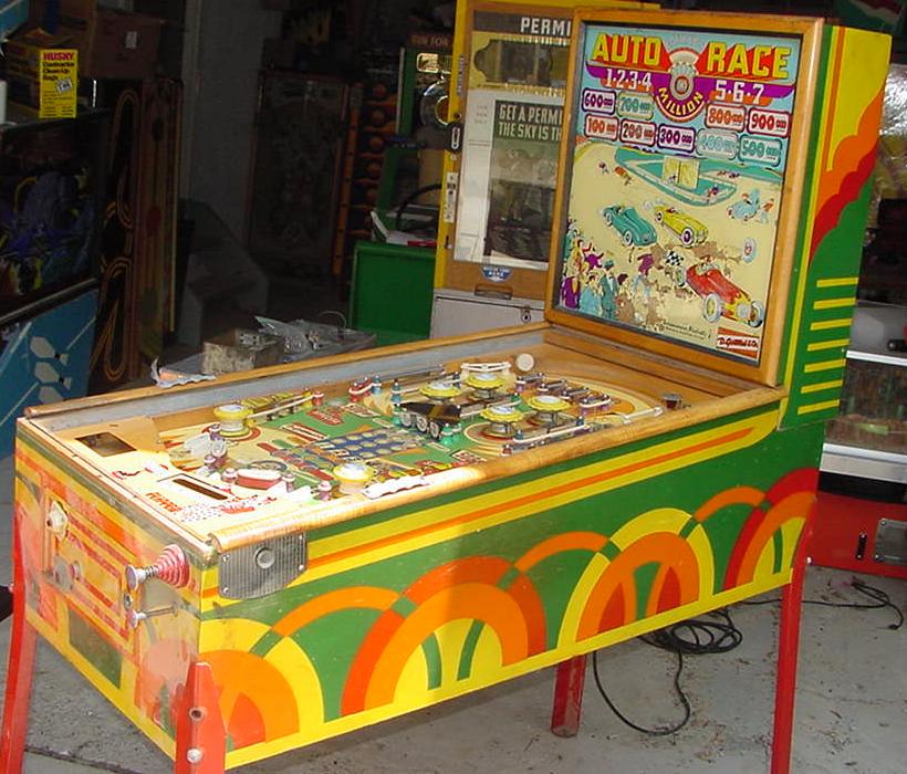 Description: Auto Race, 9/56, 1500 produced, 2 gobble holes, woodrail pinball. Backglass screened with "game over" and backbox panel is routed for a "game over" light bulb, but has no game over relay and no trough switches to sense the game is over, hence the "game over" backglass lighted area is not used. Artwork by Roy Parker. Can win up to 9 replays in a single game (not including high score replays). There are three center car targets labeled "one", "two" and "three". As the target is hit, it advances the car to the finish line. If a car reaches the finish line, it registers as a "first win". If a ball is put down the lit gobble hole, one replay is awarded for each car that has a "first win". If a numbered target is hit enough to advance the car again to the finish line, the car registers a "second win". Three replays are earned for each car that gets a second win, therefore giving up to 9 replays per game.