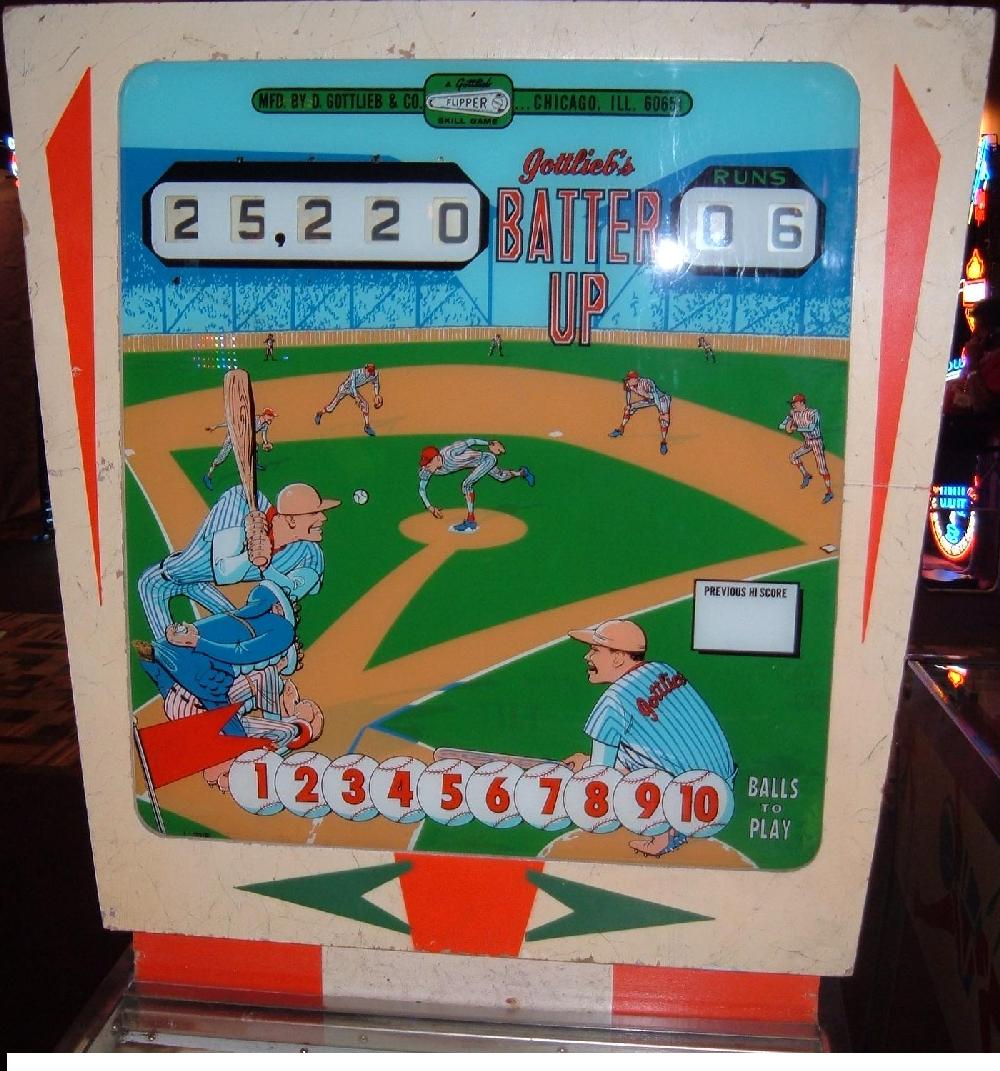 1971 Gottlieb Batter Up (1 player add-a-ball) Description: Gottlieb Baseball pinball, Gottlieb Batter Up pinball. Center turret shooter pinball, 2" flipper bats. They made 2350 Gottlieb Baseball pinballs in the replay version, and 560 Gottlieb Batter Up add-a-ball pinballs.