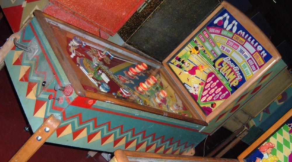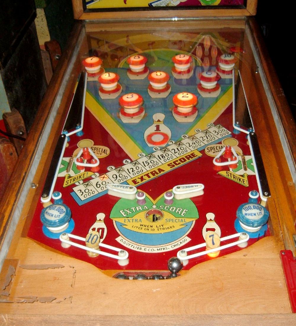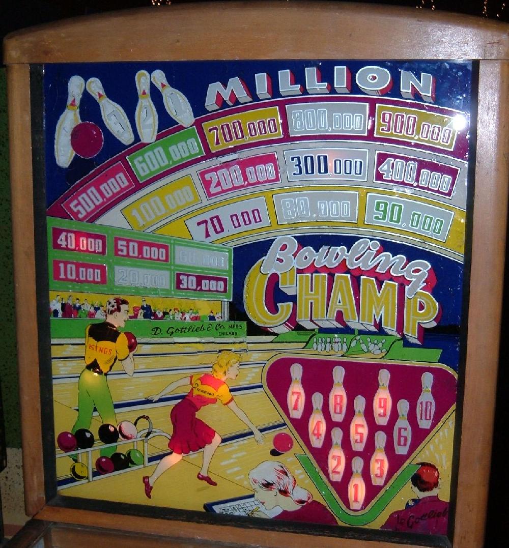 Description: Bowling Champ, 2/49, 2419 produced, 2 reverse flippers, 9 static bumpers and 2 pop bumpers. Roy Parker playfield and backglass woodrail pinball artwork. If you have this game for sale please contact me at cfh@provide.net