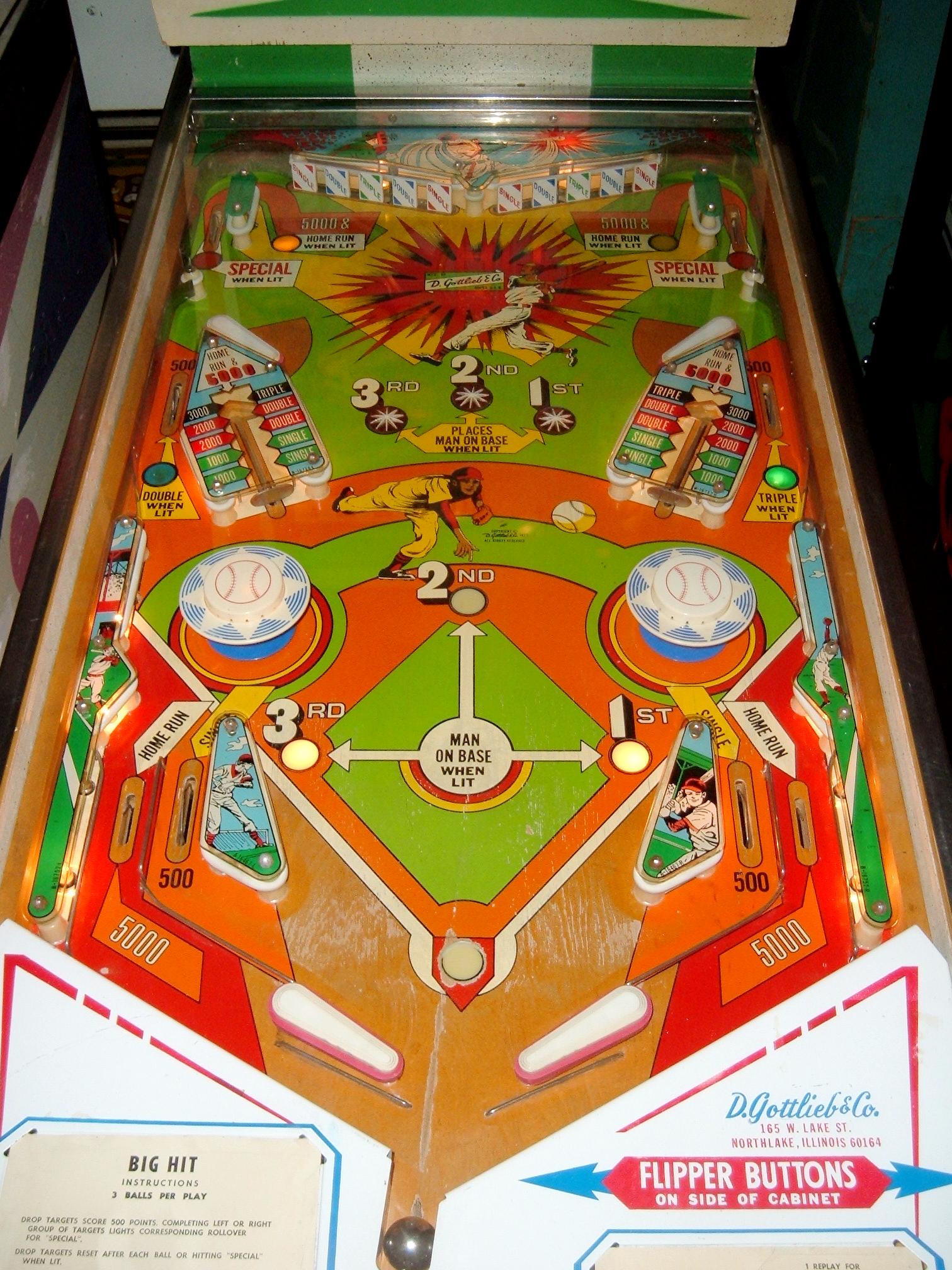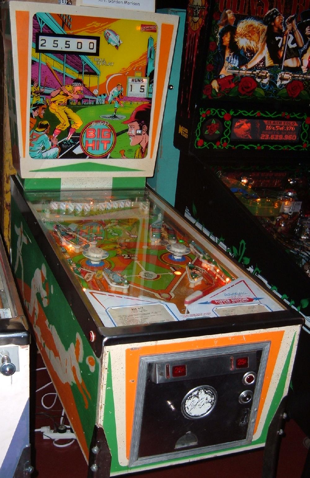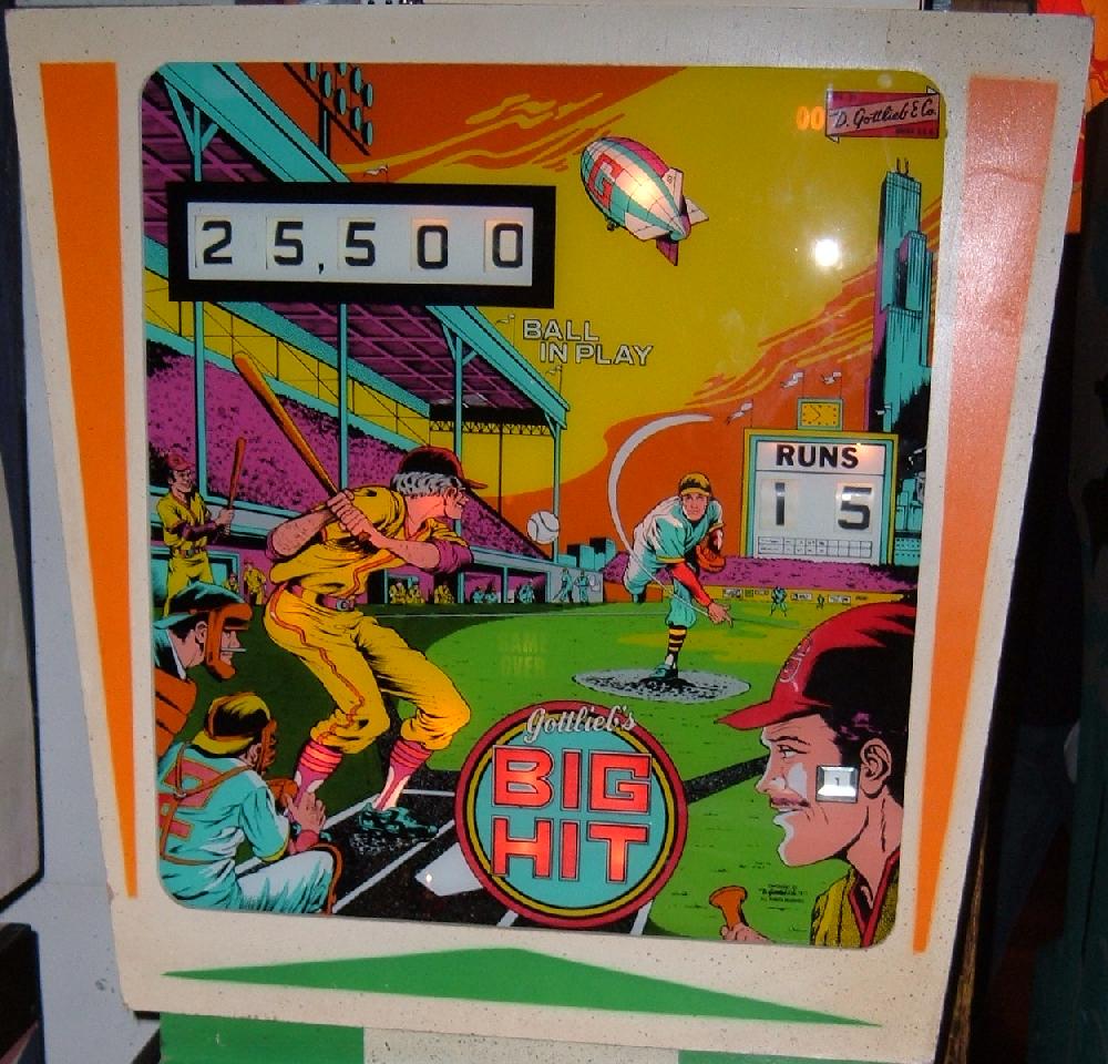 Description: Gottlieb Big Hit pinball. Single player wedgehead pinball design. Gottlieb Big Hit pinball has four 3" flippers (two upper, two lower), two vari-targets, two banks of 5 target drop targets, two pop bumpers, two slingshots. Ball is served from a center turret (no shooter lane). They made 2200 Gottlieb Big Hit pinballs. If you have a Gottlieb Big Hit pinball for sale, please contact me at cfh@provide.net
