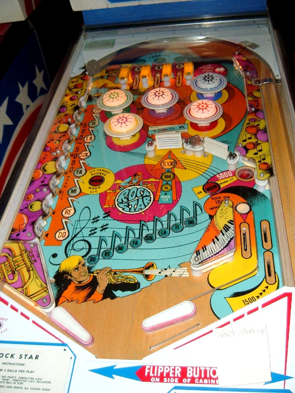 1978 Gottlieb Rock Star Pinball (1 player add-a-ball) Description: Gottlieb Blue Note (2/79) and Gottlieb Rock Star (12/78) pinball. One of the last Gottlieb EM games made. Made as Gottlieb Rock Star (268 made, add a ball) for export to Italy. They made 229 Gottlieb Blue Note pinballs in the replay version. If you have a Gottlieb Blue Note pinball or Gottlieb Rock Star pinball for sale, please contact me at cfh@provide.net