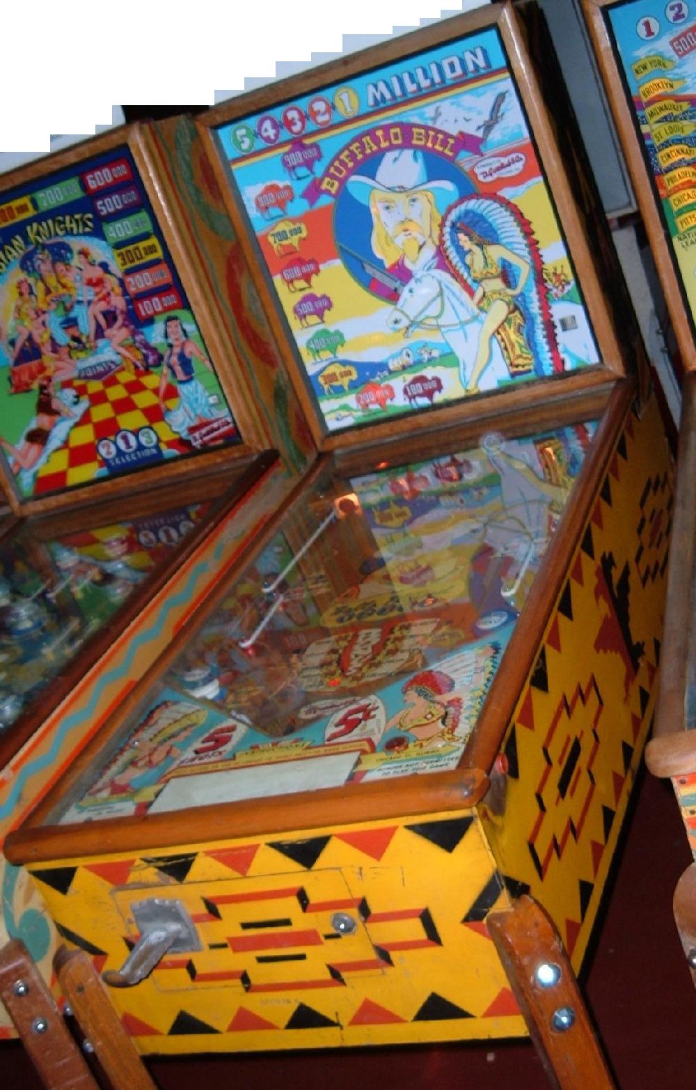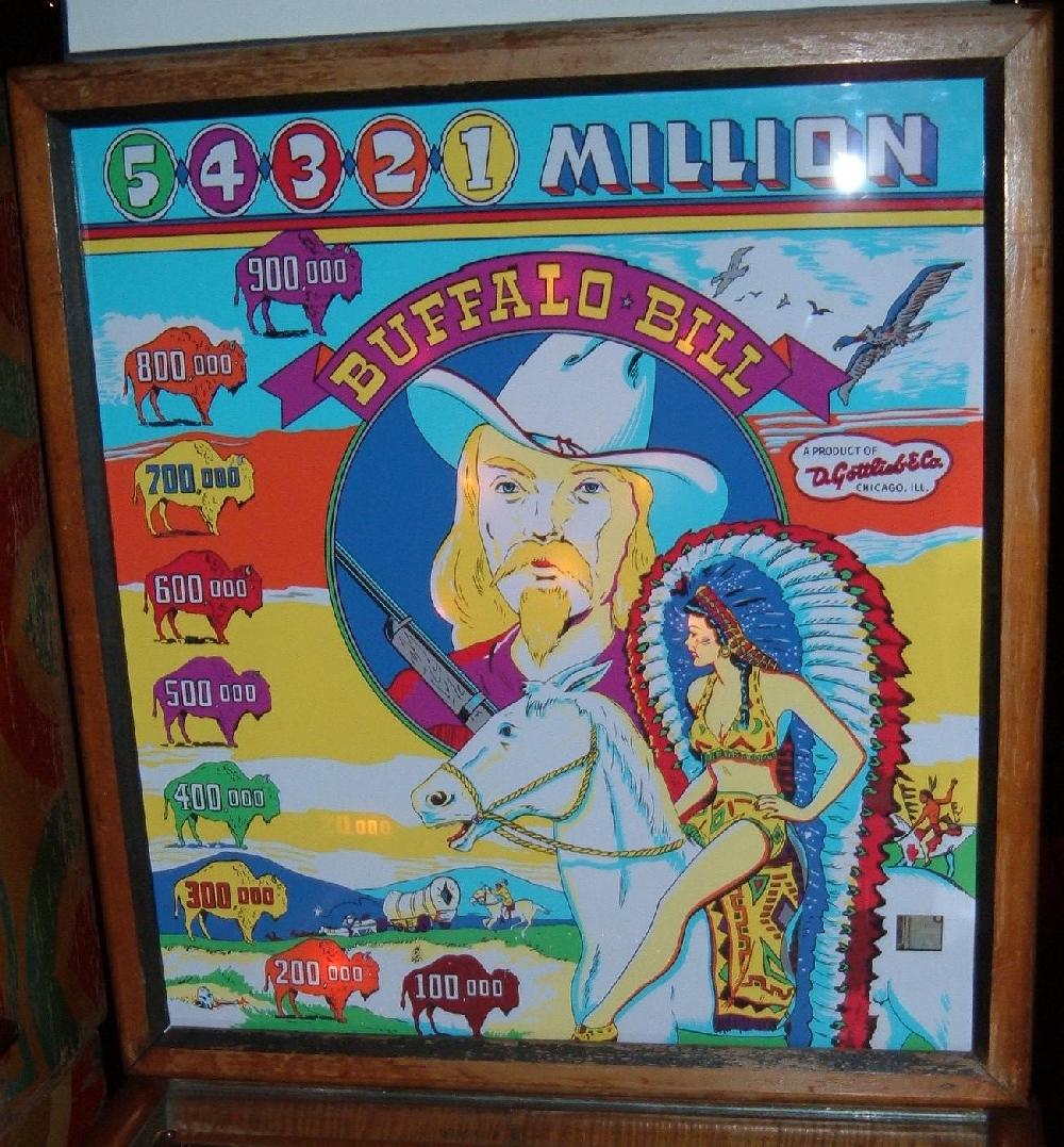 Description: Buffalo Bill, 5/50, 500 produced, turret game. Roy Parker playfield and backglass woodrail pinball artwork. If you have this game for sale please contact me at cfh@provide.net