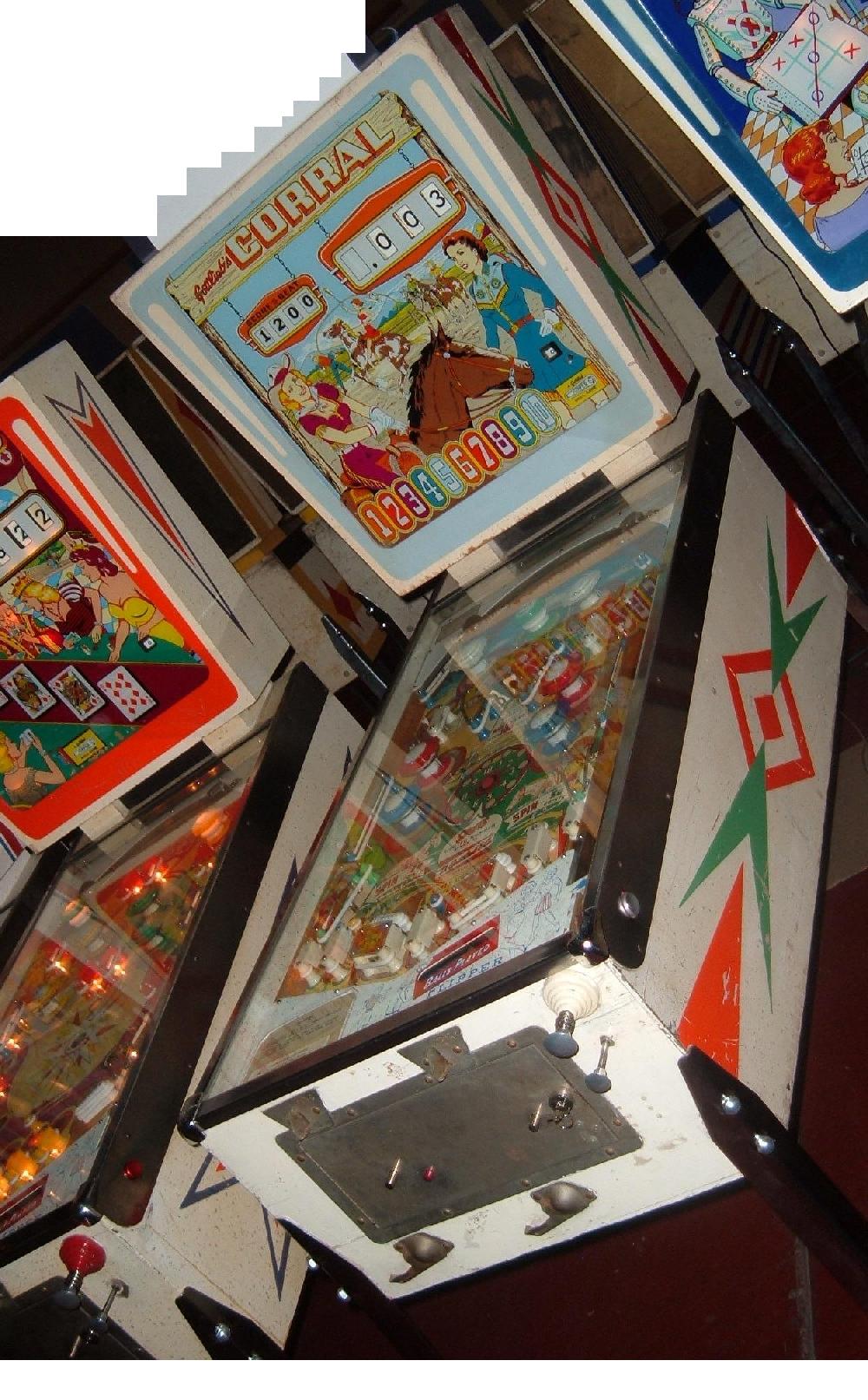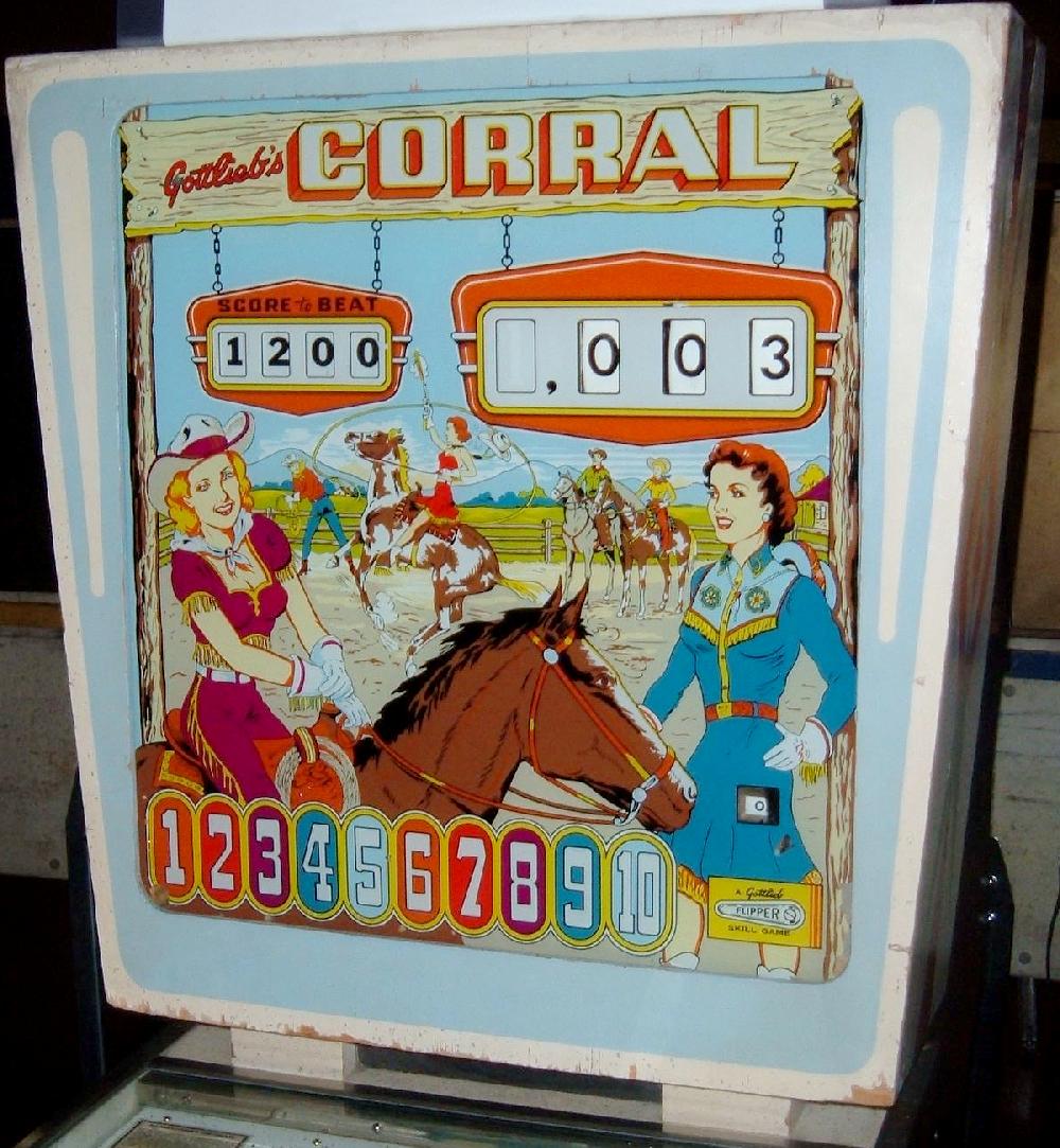 Description: Corral, 9/61, 2000 produced, NO GOBBLE HOLES, roto-target, last game with "score-to-beat", wedgehead pinball. Strange backglass that looks like an add-a-ball (1-10 at bottom), but it's really a replay game. If you have a Gottlieb Corral pinball for sale, please contact me at cfh@provide.net.