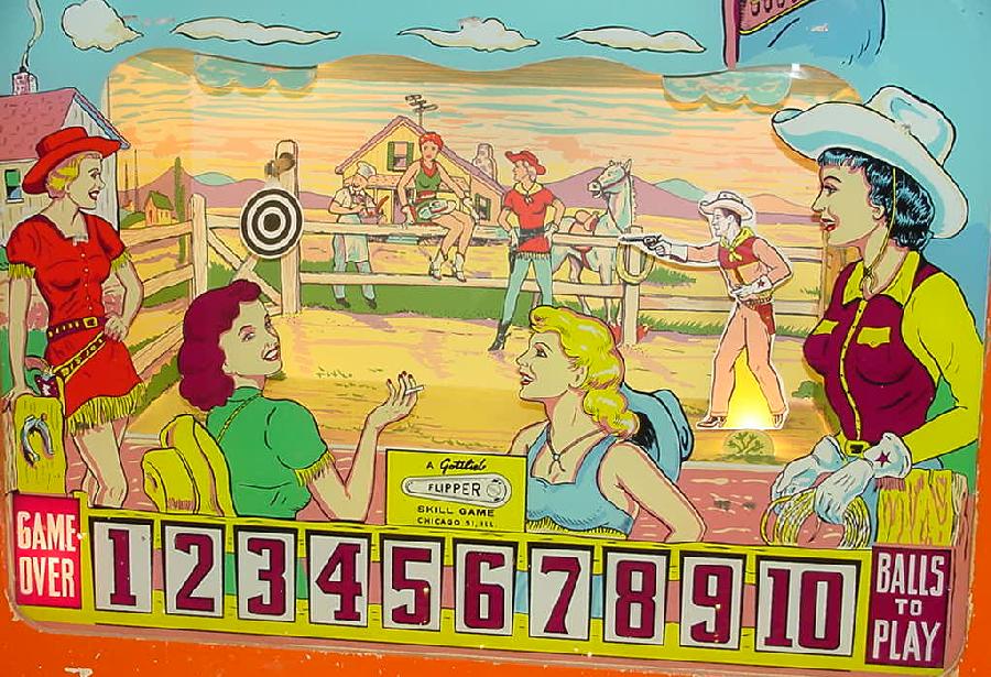 Description: Flipper Cowboy, 10/62, 1000 produced, NO GOBBLE HOLES, roto-target, mechanical backbox animation (cowboy shooting a target). Roy Parker playfield and backglass pinball artwork. Same playfield design and basic backbox animation as Gottlieb Buckaroo and Gottlieb Cowpoke, but instead of a horse kicking a cowboy, the cowboy in Flipper Cowboy shoots a target. As the cowboy shoots he recoils back, and the target spins around. A very unique mechanical animation. Note the cowboy shoots when ever the 100 point score reel advances (so the top center rollover, which score 100 points). Game rules are pretty straight forward. Complete 5 of the roto-target numbers in a row to award a ball. As the roto-target numbers are hit, they light up in a row on the playfield. Also the top A-B-C-D lights can be hit, lighting the top center rollover for a ball. There is also a red-dot roto target that will award a free ball. If you have a Gottlieb Flipper Cowboy pinball for sale, please contact me at cfh@provide.net