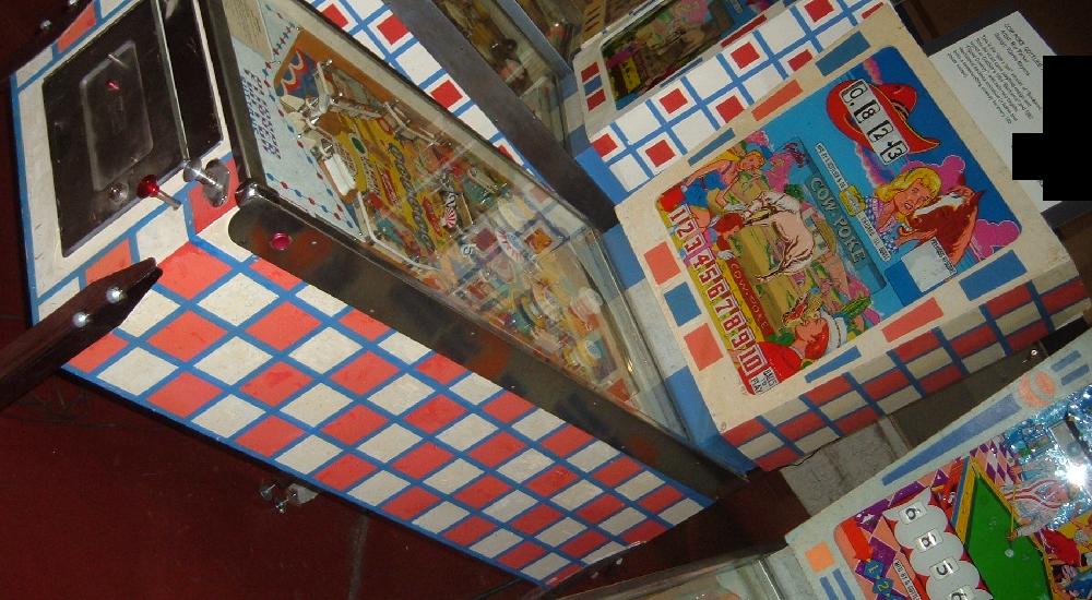 Description: Cowpoke, 6/65, 1256 produced, Add-a-Ball version of Buckaroo (5/65), roto-target, mechanical animation in backbox (horse kicking a cowboy). Roy Parker playfield and backglass pinball artwork. Gottlieb Cowpoke also has a sister game called Gottlieb Buckaroo. Gottlieb Buckaroo and Gottlieb Cowpoke are the exact same game, except Buckaroo awards free games, and Cowpoke awards extra balls. Note the horse kicks the cowboy when ever the 100 point score reel advances (so the top center rollover, which score 100 points, will kick the cowboy). Related game: Gottlieb Flipper Cowboy. Game rules are pretty straight forward. Complete 5 of the roto-target numbers in a row to award a ball. As the roto-target numbers are hit, they light up in a row on the playfield. Also the top A-B-C-D lights can be hit, lighting the top center rollover for a ball. There is also a red-dot roto target that will award a free ball. If you have a Gottlieb Buckaroo or Gottlieb Cow Poke pinball for sale, please contact me at cfh@provide.net