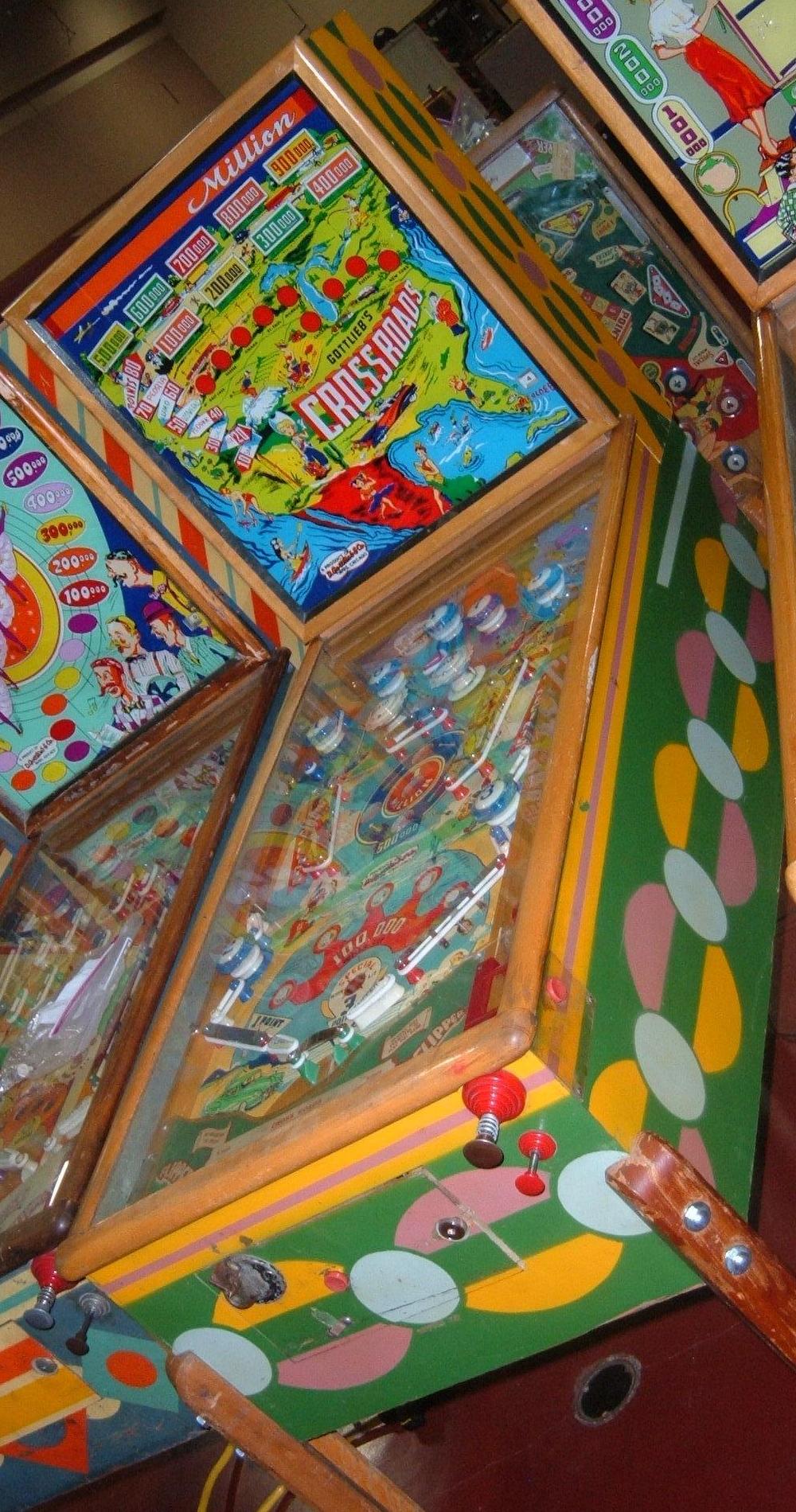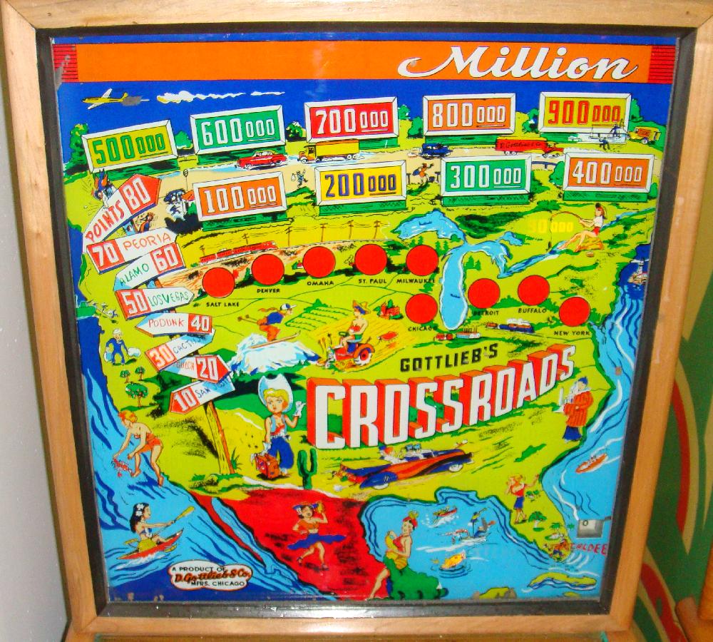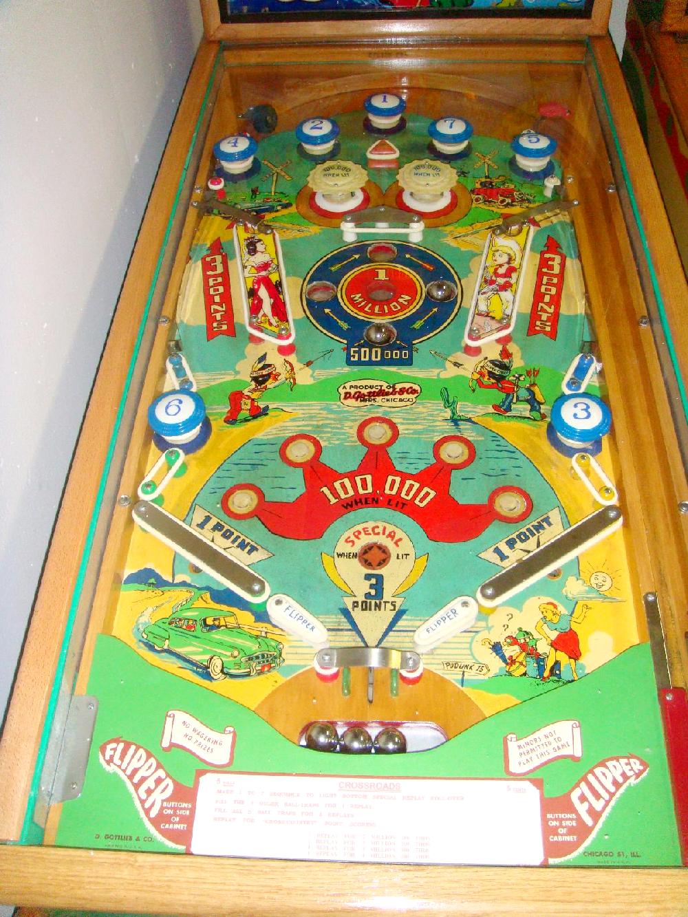 Description: Crossroads, 5/52, 1300 produced, 4 trap holes, Woodrail pinball, artwork by Roy Parker. Please contact me if you have a Gottlieb Cross roads woodrail pinball for sale at cfh@provide.net