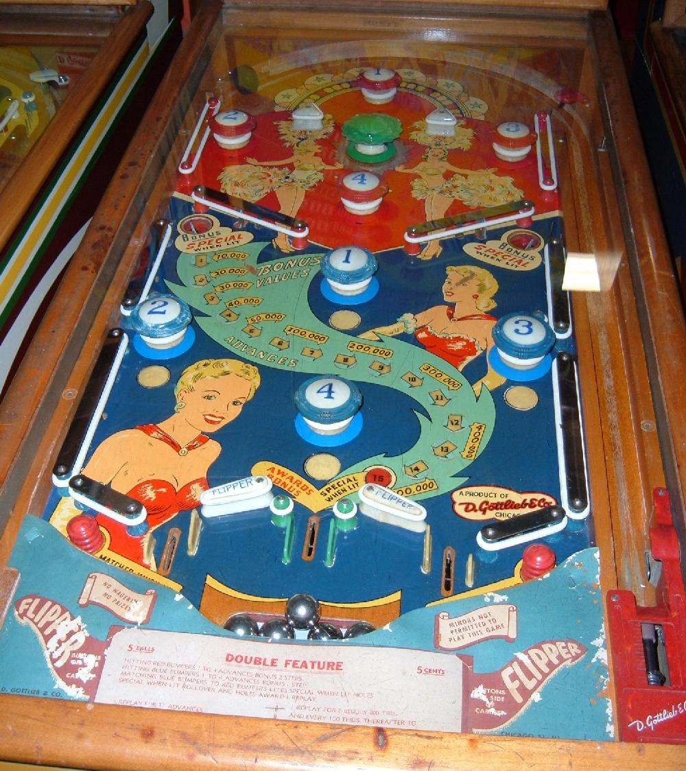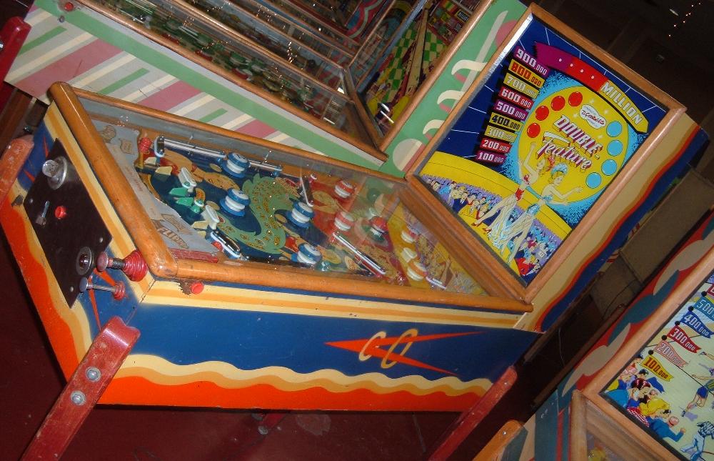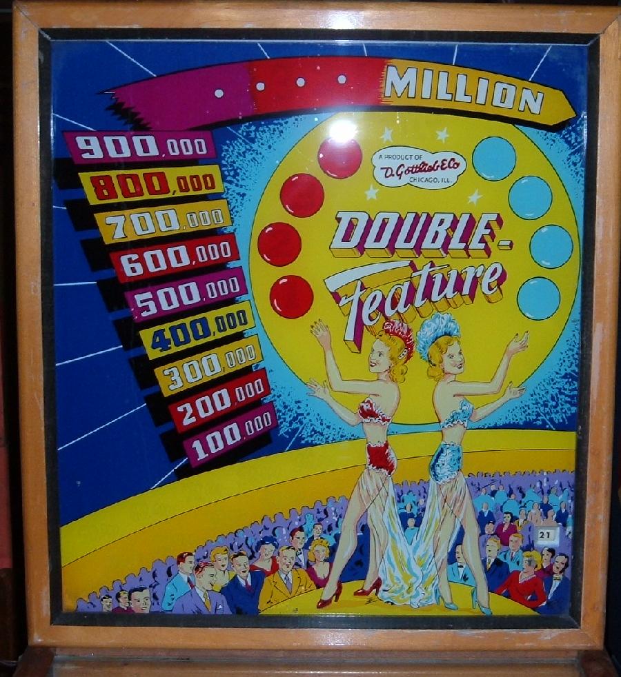 Description: Double-Feature, 12/50, 550 produced, reverse flippers. Roy Parker playfield and backglass woodrail pinball artwork. Please contact me at cfh@provide.net if you have this game for sale.