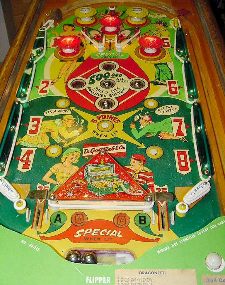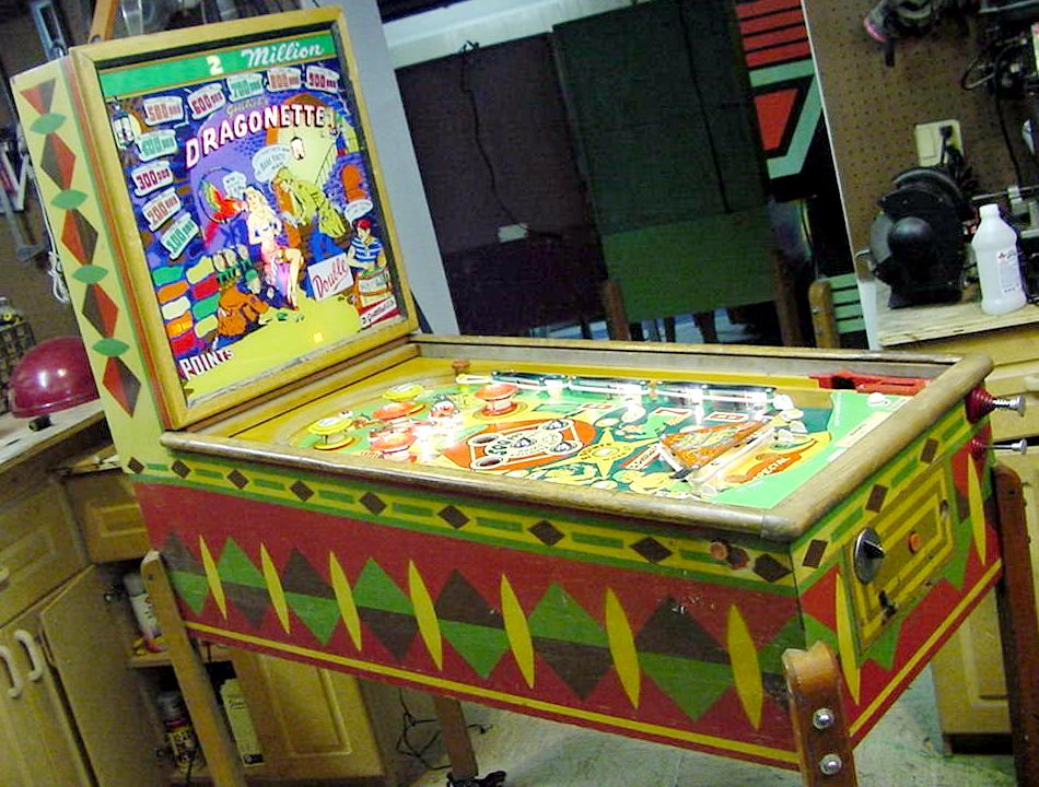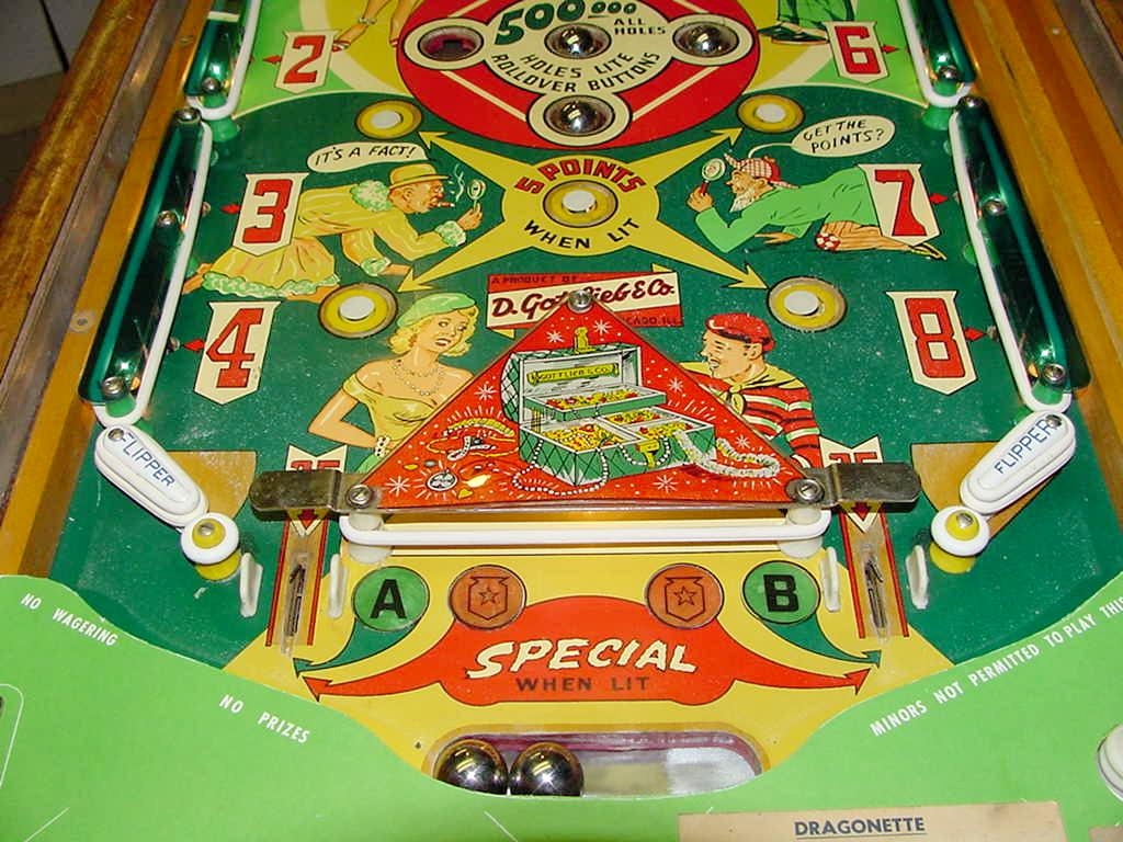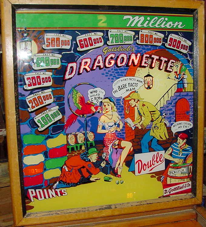 Description: Dragonette, Gottlieb, 6/54, 950 produced, 5 trap holes, double award, BALL COLLECT TRAY, complete side bumpers 1 to 8 in order to light playfield replays, outstanding Roy Parker backglass and playfield art, woodrail pinball. Dragonette came out first, but was so popular Gottlieb released 4 Belles, which is a copy of Dragonette. Gottlieb Dragonette has several ways to win a replay (or if game played as Double award, two replays). First is to complete the 1-8 side bumper sequence (in order). If this is done, the red "ding dong" bottom rollovers (A/B lanes next to the flipper) lights for a replay. These two left/right side rollovers alternate with the 10,000 unit. Next is to complete both the A and B rollovers next to the flippers, as this awards a Replay. It also lights the center rollover between the red pop bumpers for a Replay. The next way is to put a ball in each of the four outside trap holes. This also awards a Replay. Putting a ball into the fifth center trap hole gives another replay. Please contact me if you have a Gottlieb Dragonette woodrail pinball for sale at cfh@provide.net