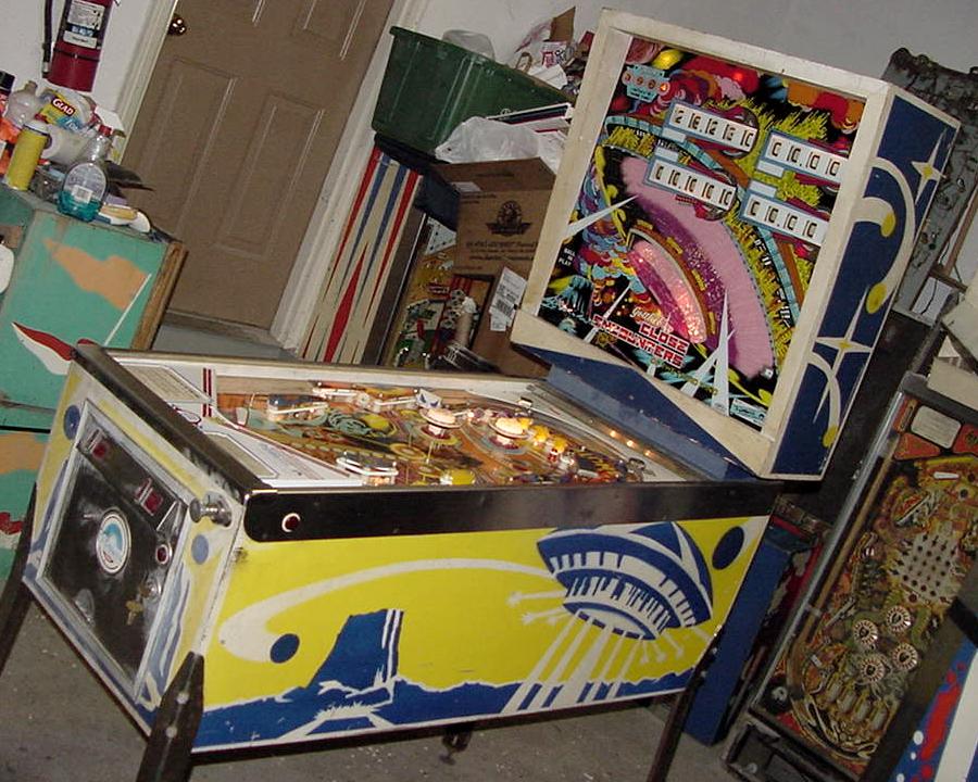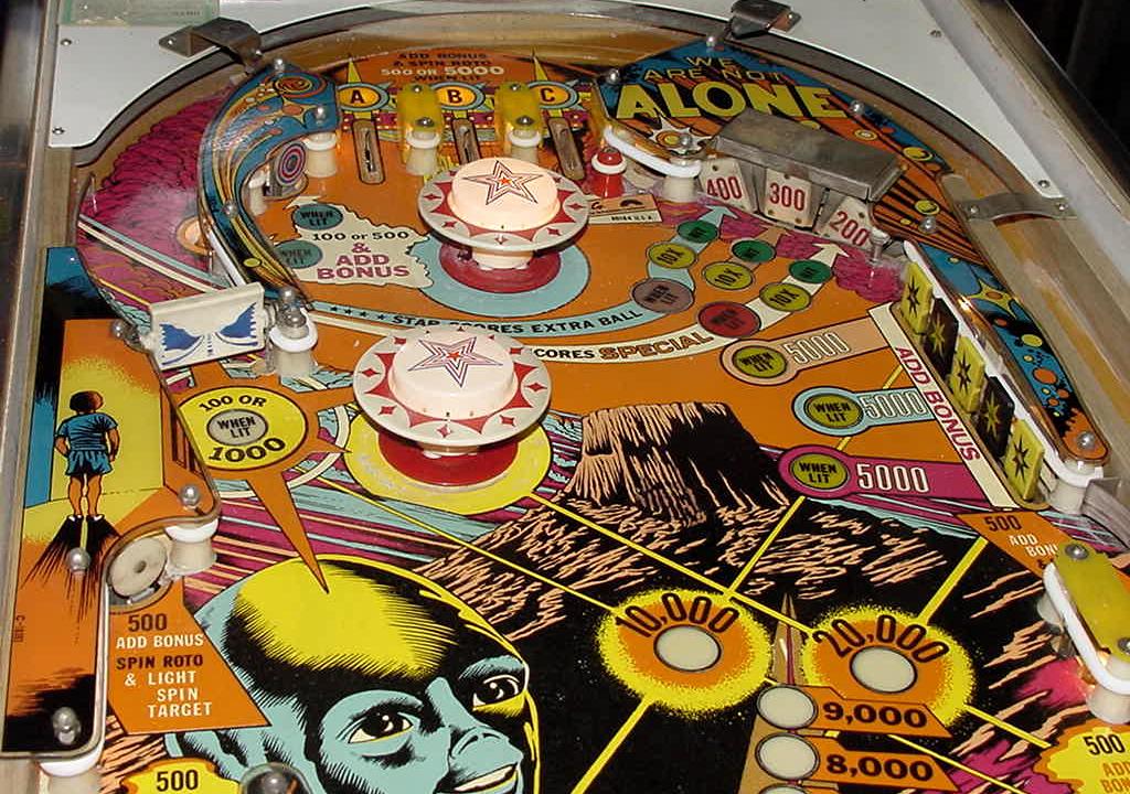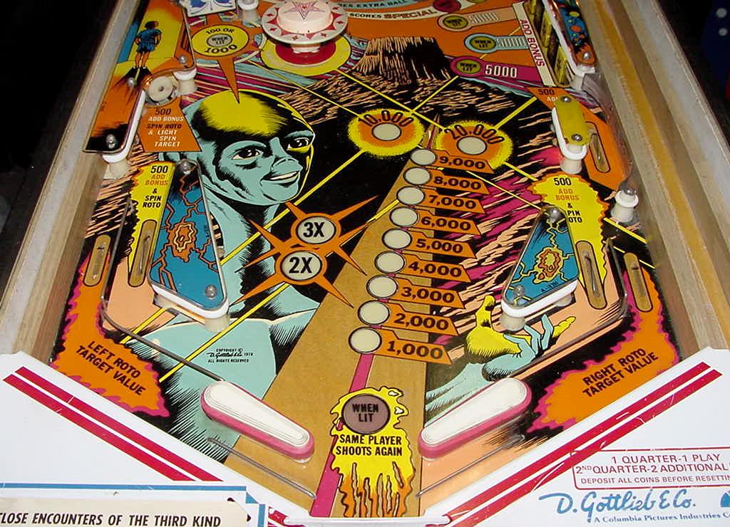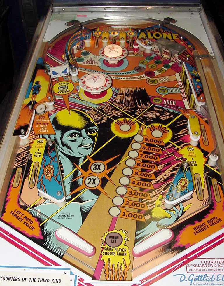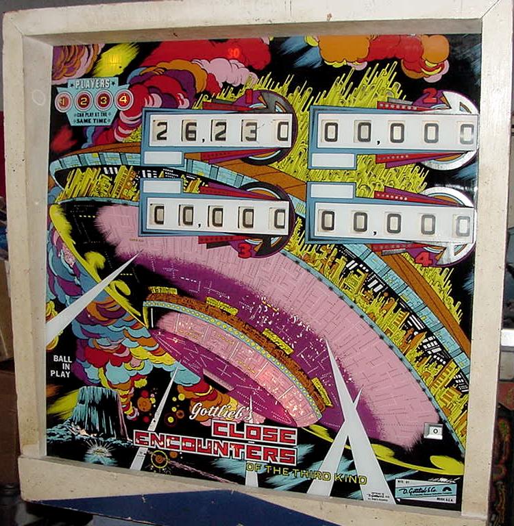 Description: Gottlieb Close Encounters of the Third Kind pinball. They made 470 Gottlieb EM Close Encounters pinballs and 9950 solidstate versions. Close Encounters was made in both EM and SS (solidstate) versions. Roto-target, bank of 5 drop targets, two pop bumpers, one slingshot, one spinner, two 3" flippers. Interestingly the EM version uses an electronic sound board instead of a chime unit (though there is a plug to use chimes instead). Backbox is really tall and big, larger than maybe any other Gottlieb EM pinball. Personally I like the EM pinball version, but the SS version does have slightly different rules and bonus scoring that goes up to 5x (where the EM version only goes to 3x). If you have a Gottlieb Close Encounters EM pinball for sale, please contact me at cfh@provide.net