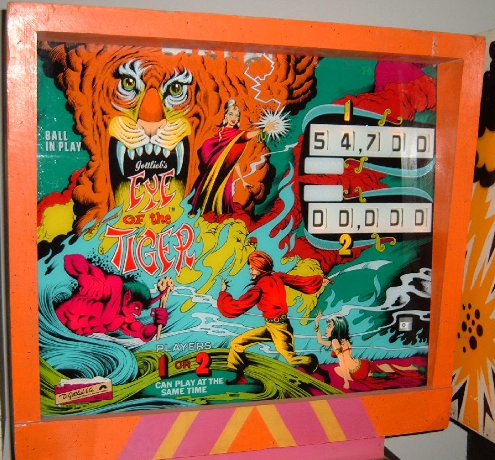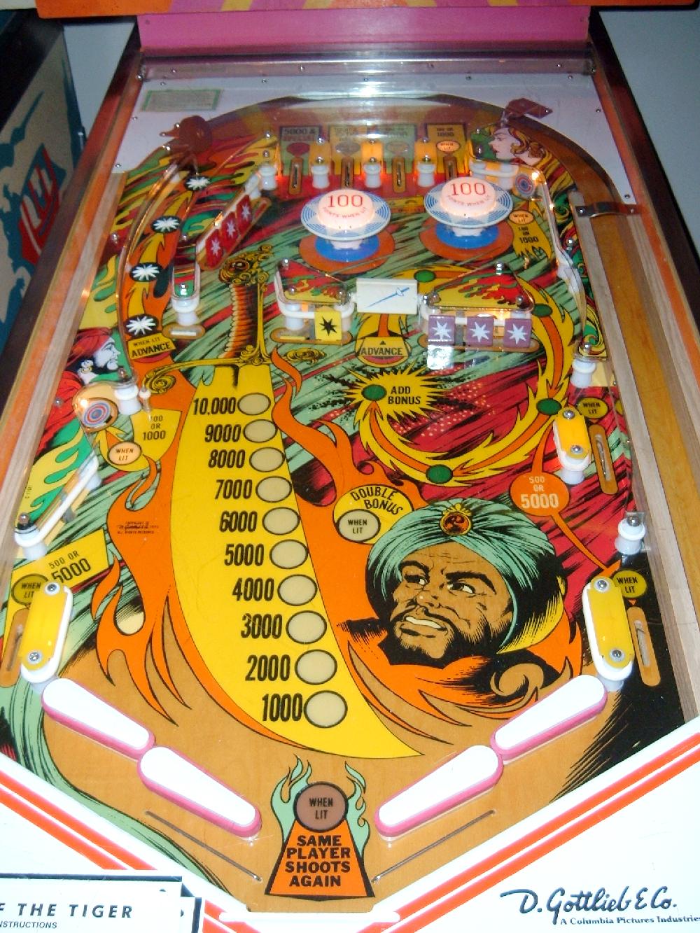 1978 Gottlieb Eye of the Tiger Pinball (2 player) Description: Gottlieb Sinbad pinball, Gottlieb Eye of the Tiger pinball. Same game, just different number of players (4 players versus 2 players). Gottlieb sold this game design in the two flavors, though they are essentially the exact same game (with slight artwork differences). The 2 player version (Eye of the Tiger) had a lower price than the 4 player (Sinbad), and was marketed to game operators with less money to spend. Sinbad was made in both EM and SS (solidstate) versions. They made 950 Gottlieb EM Sinbad pinballs, and 730 Gottlieb Eye of the Tiger EM pinball machines. If you have a Gottlieb EM Sinbad or Gottlieb Eye of the Tiger pinball for sale, please contact me at cfh@provide.net