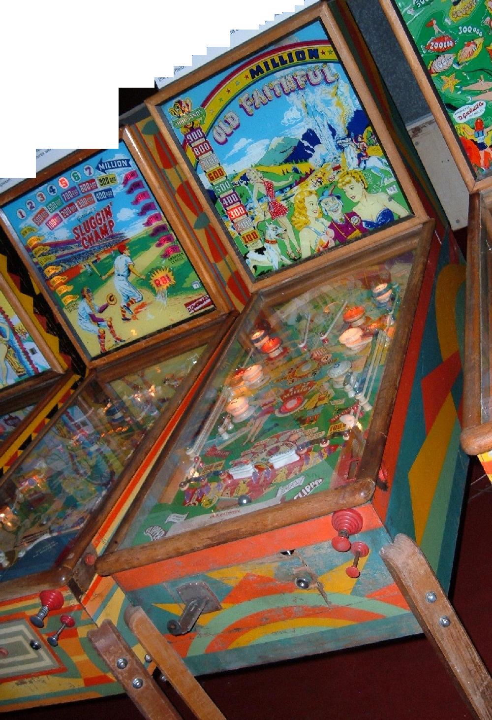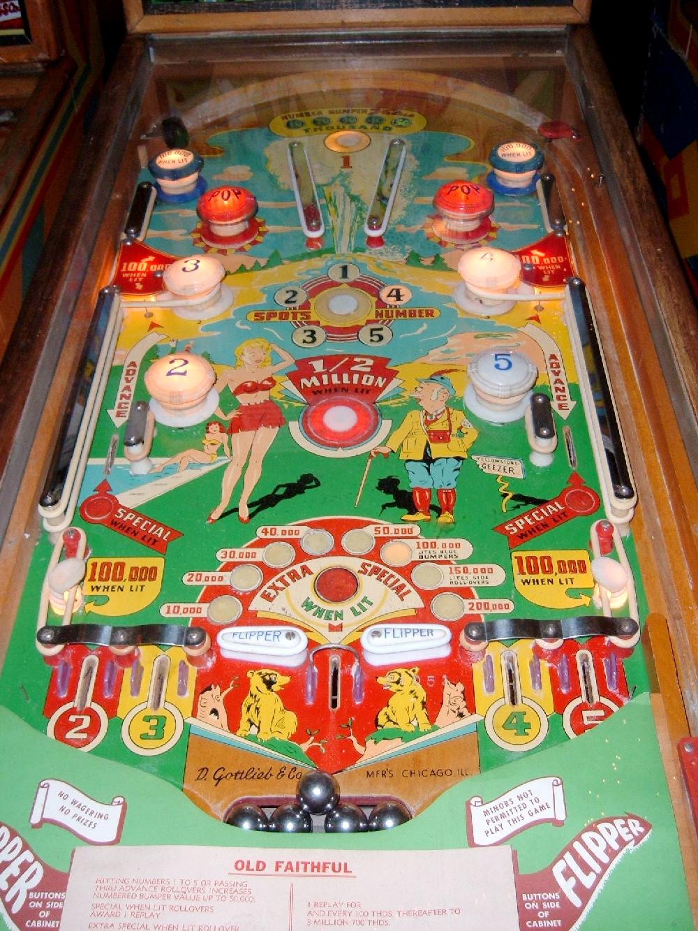 Description: Old Faithful, 12/49, 810 produced. Roy Parker playfield and backglass woodrail pinball artwork. If you have this game for sale please contact me at cfh@provide.net