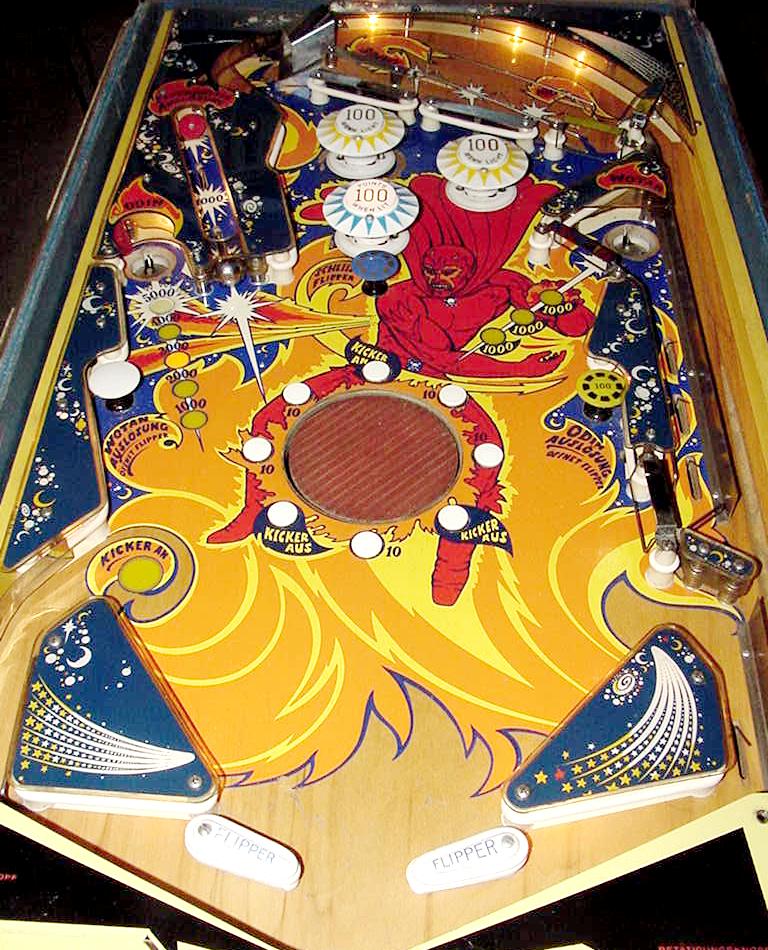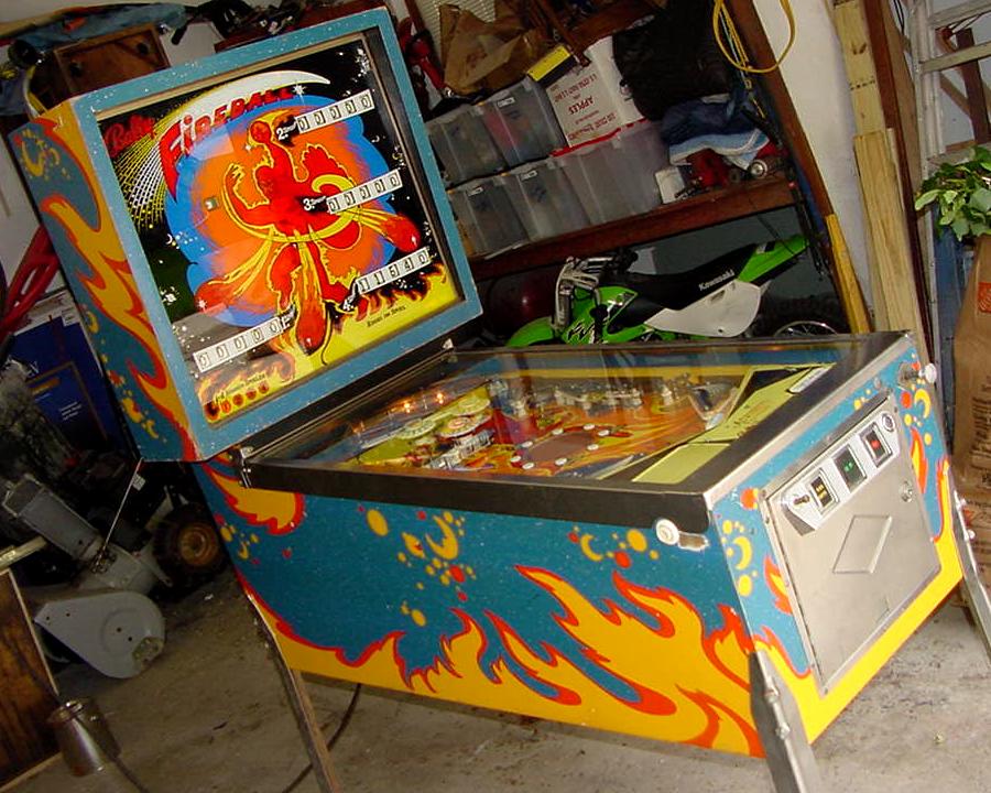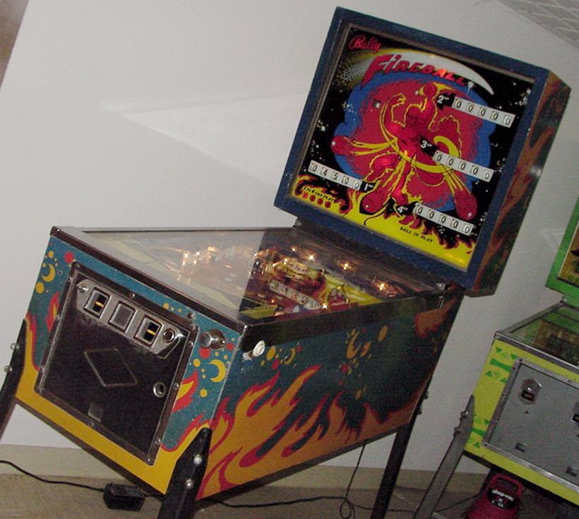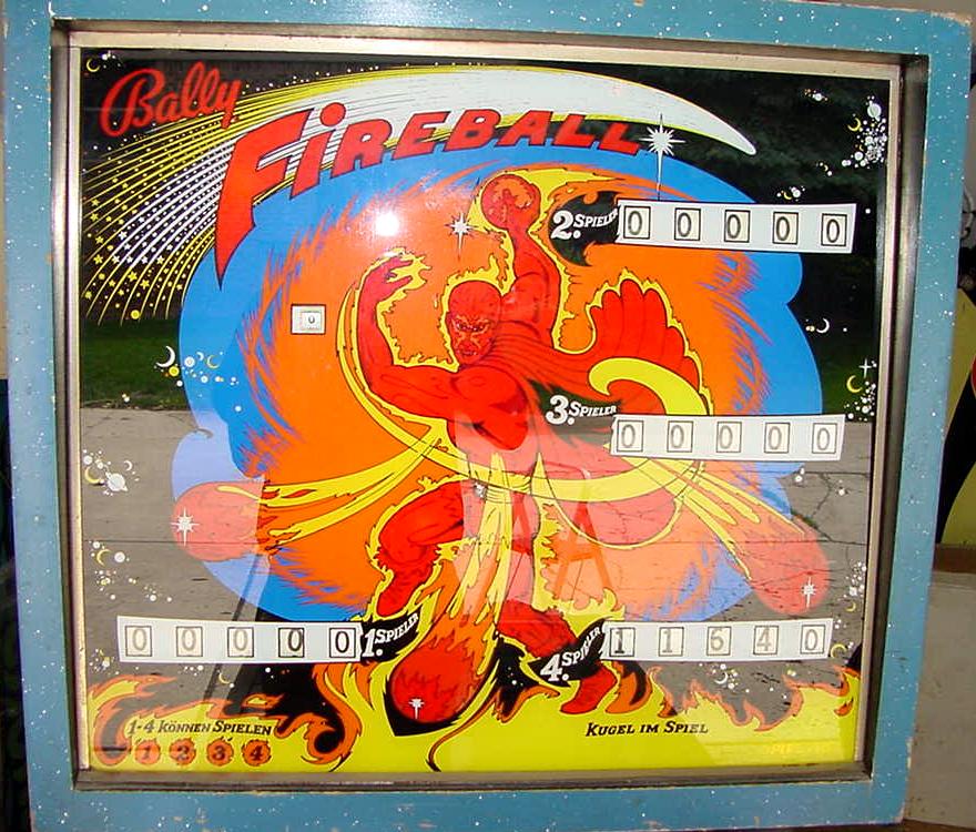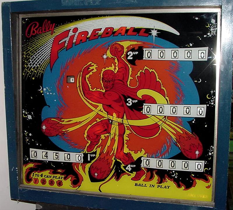 Description: Bally Fireball pinball, 2/72, 4 players. Has up to 3 ball multi-ball and zipper flippers (mehcanical flippers that move inward to block the balls from draining). Fireball also had three pop bumpers, two slingshots, two 2" zipper flippers, a cliff-hanger skill shot, three mushroom targets, and a rubber 6" spining disk in the middle of the playfield. Two kickout holes would capture the pinballs for multi-ball. When the two outside mushroom bumper targets were hit, this will release the corresponding ball. Unfortunately Fireball only has high score specials with no bonus, no extra ball and no playfield specials. They made 3815 Bally Fireball pinballs. They also made Bally Fireball in a German version with german text on the backglass, plastics and playfield. If you have a Bally Fireball pinball for sale, please contact me at cfh@provide.net