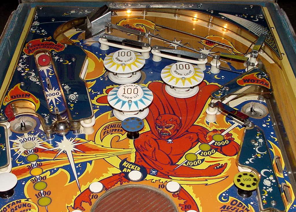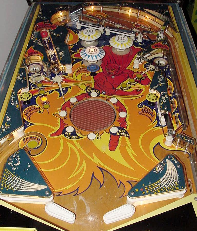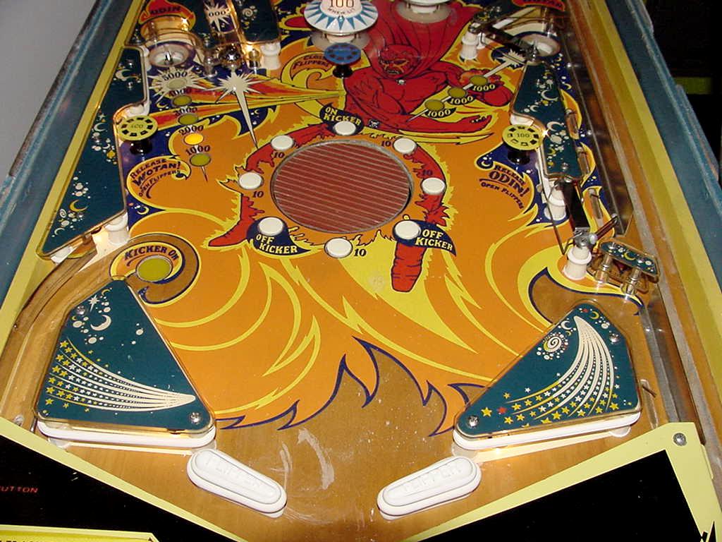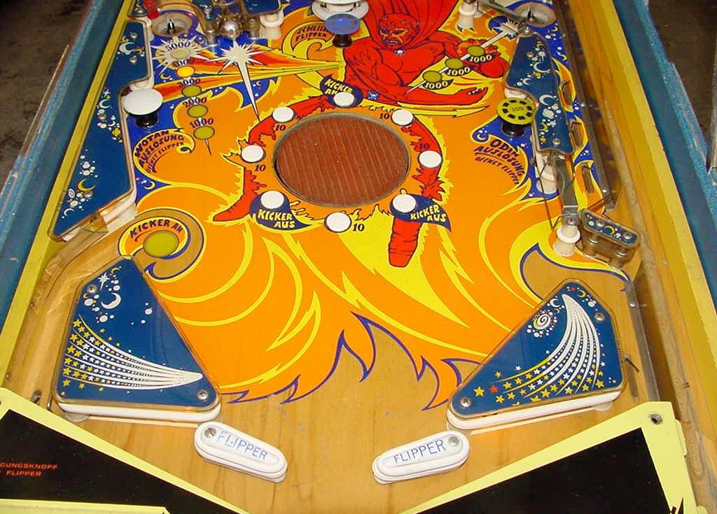 Description: Bally Fireball pinball, 2/72, 4 players. Has up to 3 ball multi-ball and zipper flippers (mehcanical flippers that move inward to block the balls from draining). Fireball also had three pop bumpers, two slingshots, two 2" zipper flippers, a cliff-hanger skill shot, three mushroom targets, and a rubber 6" spining disk in the middle of the playfield. Two kickout holes would capture the pinballs for multi-ball. When the two outside mushroom bumper targets were hit, this will release the corresponding ball. Unfortunately Fireball only has high score specials with no bonus, no extra ball and no playfield specials. They made 3815 Bally Fireball pinballs. They also made Bally Fireball in a German version with german text on the backglass, plastics and playfield. If you have a Bally Fireball pinball for sale, please contact me at cfh@provide.net