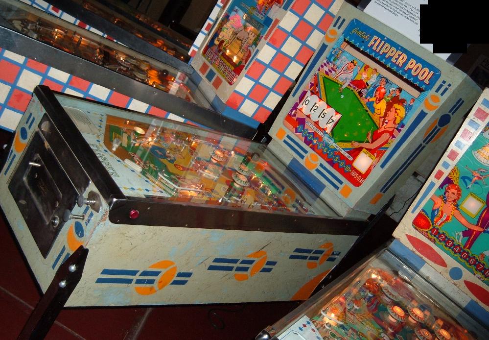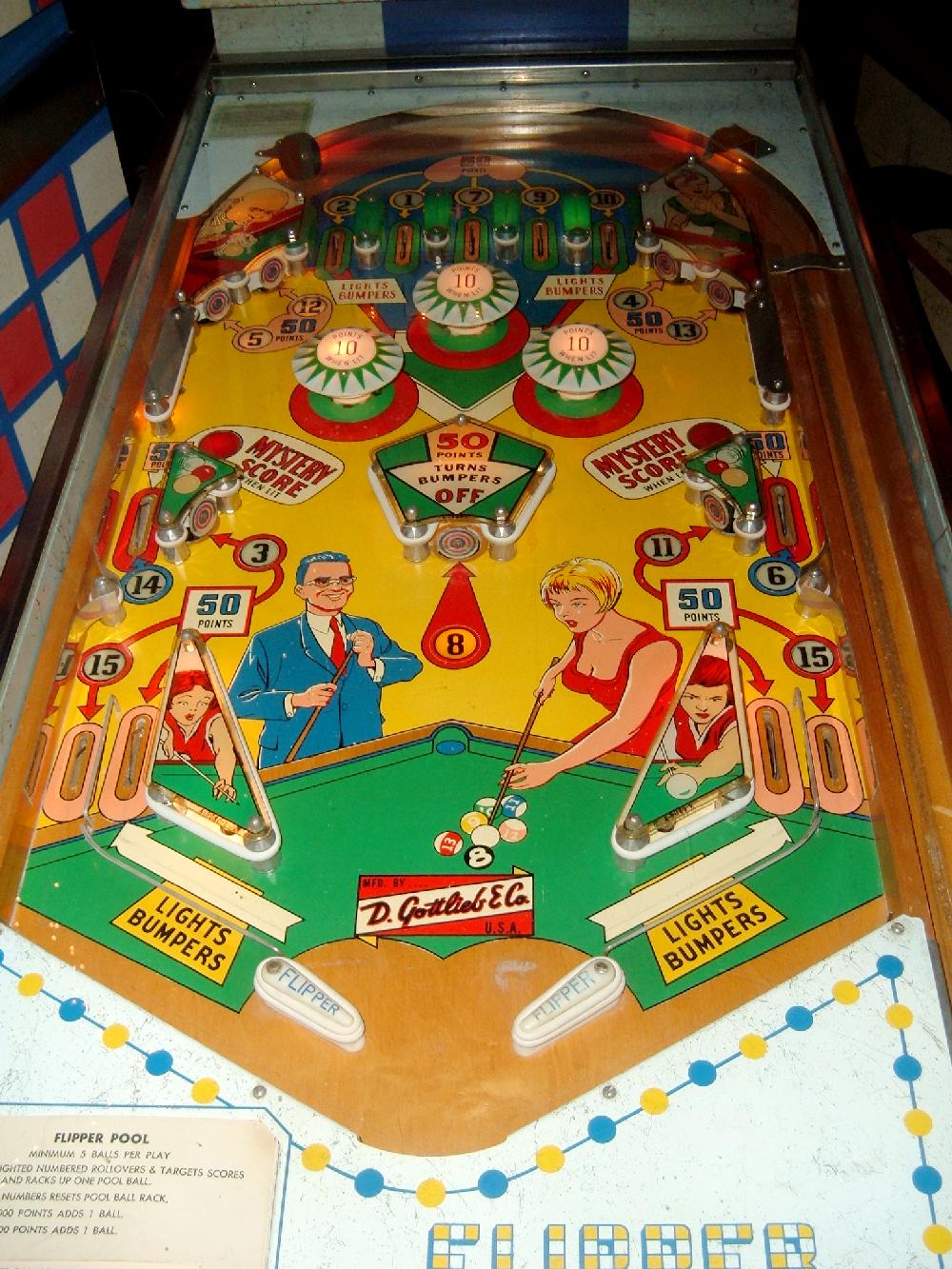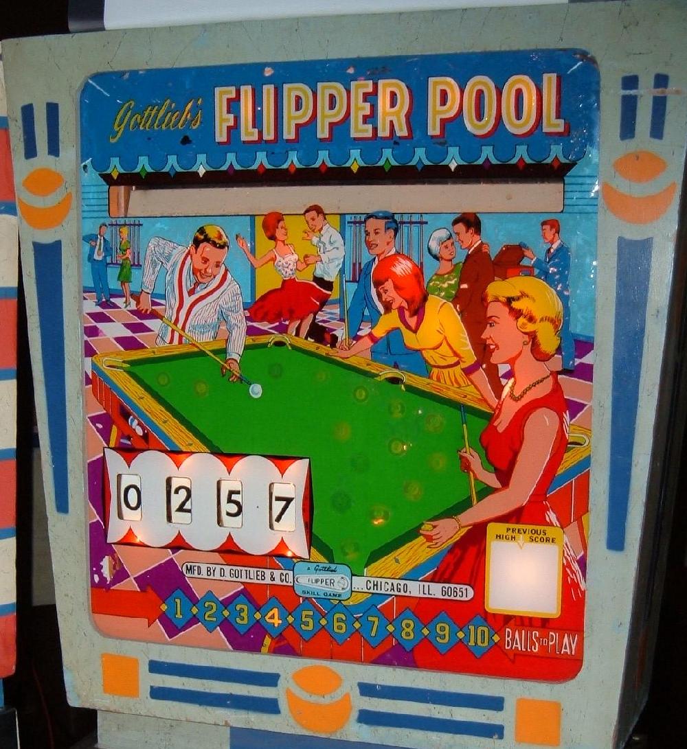 Description: Flipper Pool, 10/65, 700 produced, animated pool balls in backbox, second game with return lanes to the flippers, wedgehead pinball. Bankaball is the replay, and Flipper Pool (it's sister) is the add-a-ball version. Gottlieb Bank a Ball and Gottlieb Flipper Pool are the exact same game, except Bank a Ball awards free games, and Flipper Pool awards extra balls. Note a common problem with this game are the plastic balls in the backbox. often they break from the shock transmitted by the two reset coils (which resets the ball assembly in the backbox). The balls at the ends (1,2,14,15) break the most, as they are closest to these two reset coils. Also the backglass (score glass) on this game often has peeling artwork. If you have a Gottlieb Bank-a-Ball or Gottlieb Flipper Pool pinball for sale, please contact me at cfh@provide.net