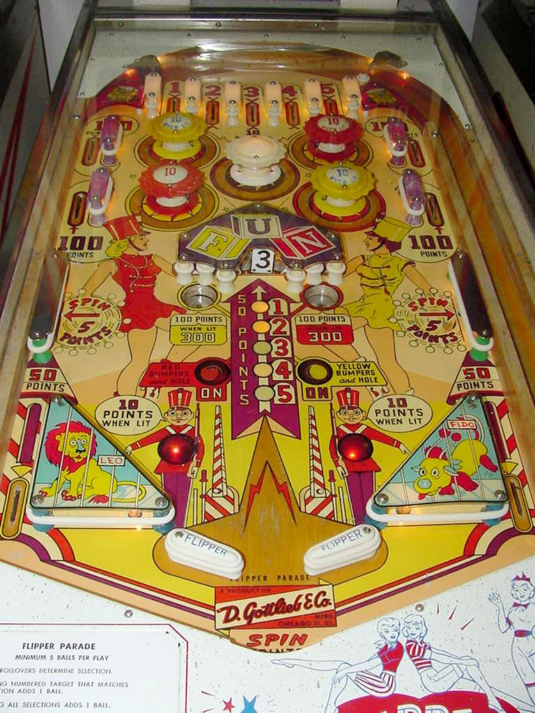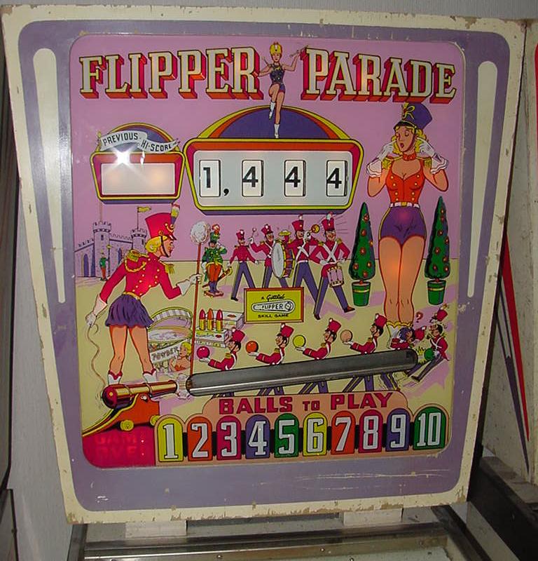 Description: Gottlieb Flipper Parade, 5/61, 1500 produced, 2 gobble holes, Add-a-Ball, roto-target, mechanical backbox animation (cannon that fires a metal ball). If you have a Gottlieb Flipper Parade pinball for sale, please contact me at cfh@provide.net.