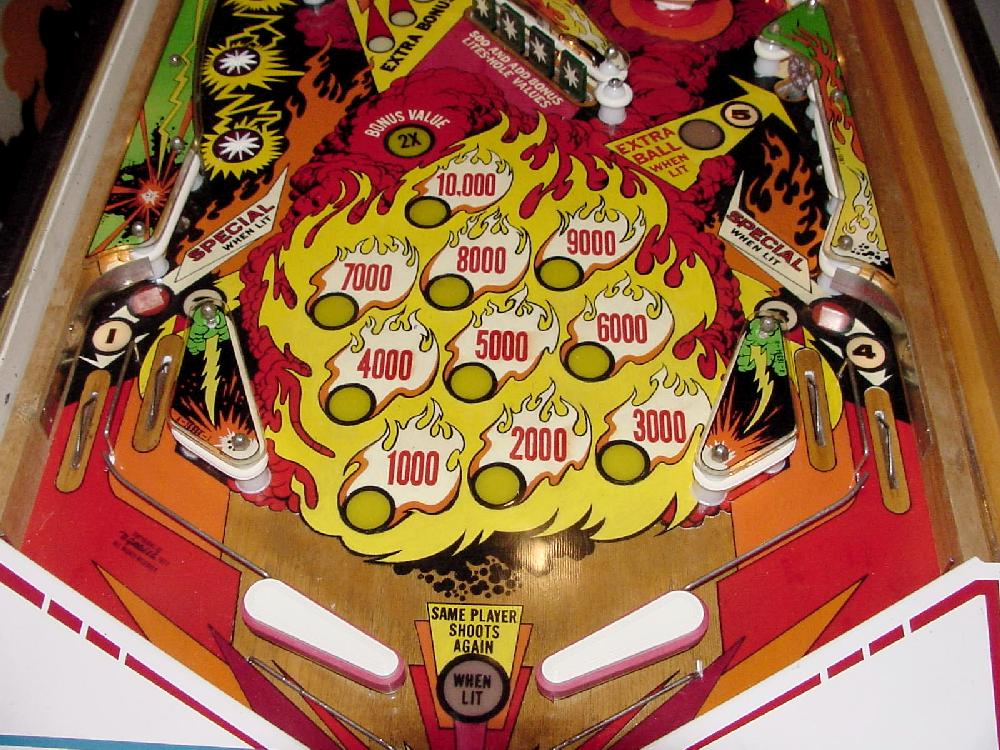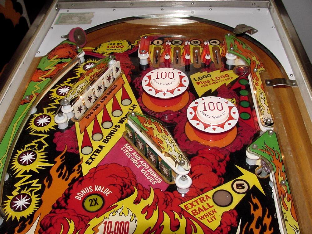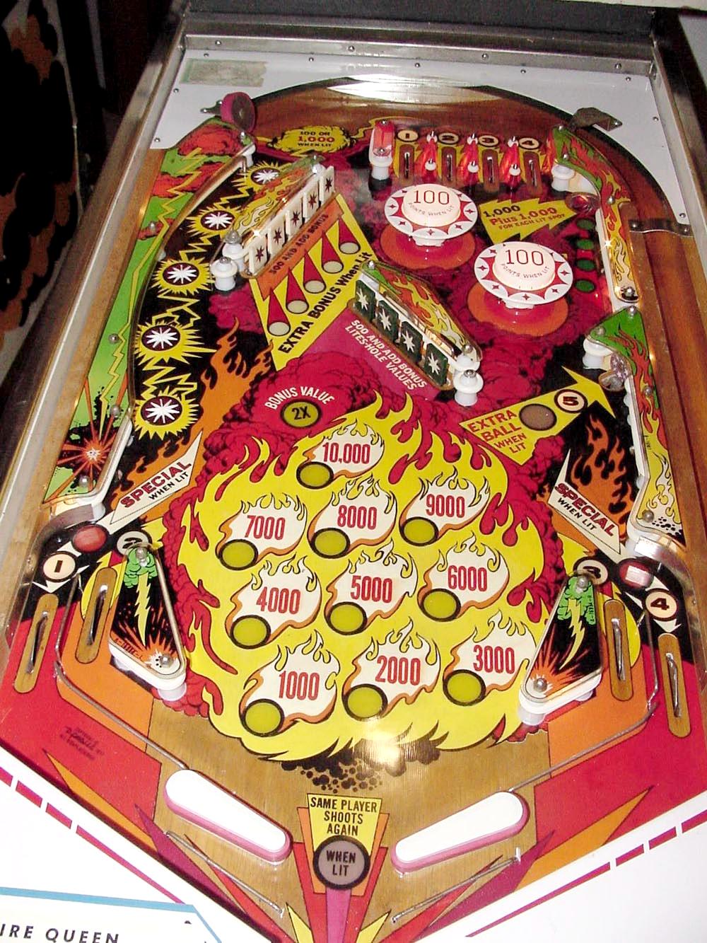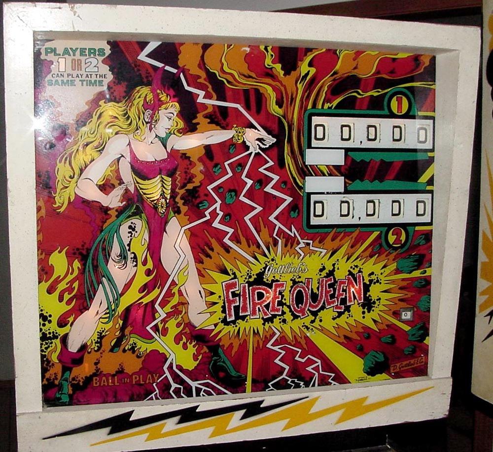 Description: Gottlieb Fire Queen pinball, which is the 2 player version of Gottlieb Vulcan pinball. Same game, just different number of players (4 players versus 2 players). Gottlieb sold this game design in the two flavors, though they are essentially the exact same game (with artwork differences). The 2 player version (Fire Queen) had a lower price than the 4 player (Vulcan), and was marketed to game operators with less money to spend. Two banks of drop targets, one with 5 white targets the other with 4 green targets. Two pop bumpers, two slingshots, two 3" flippers, one kickout hole. Completing the five numbered targets lights the side lanes for special. Also each numbered target has a corresponding left side rollover that changes from 100 to 1000 points. If all white drop targets are downed, bonus 2x is activated, and the white drop targets reset. If the player gets all the green drop targets down, the number "5" standup target on the right lights for extra ball (same player shoots again), and the green drop targets stay down (allowing only one extra ball per ball in play.) Once the player gets the extra ball and drains, all targets reset except for the 1 to 5 numbered targets which do no change. Note the "5" target is adjustable to make it harder or easier to hit for the extra ball. An interesting pinball playfield design. I like the two player Fire Queen pinball artwork better than Vulcan personally. They made 3575 Gottlieb Vulcan pinballs, and 970 Gottlieb Fire Queen pinball machines. If you have a Gottlieb Fire Queen pinball for sale, please contact me at cfh@provide.net
