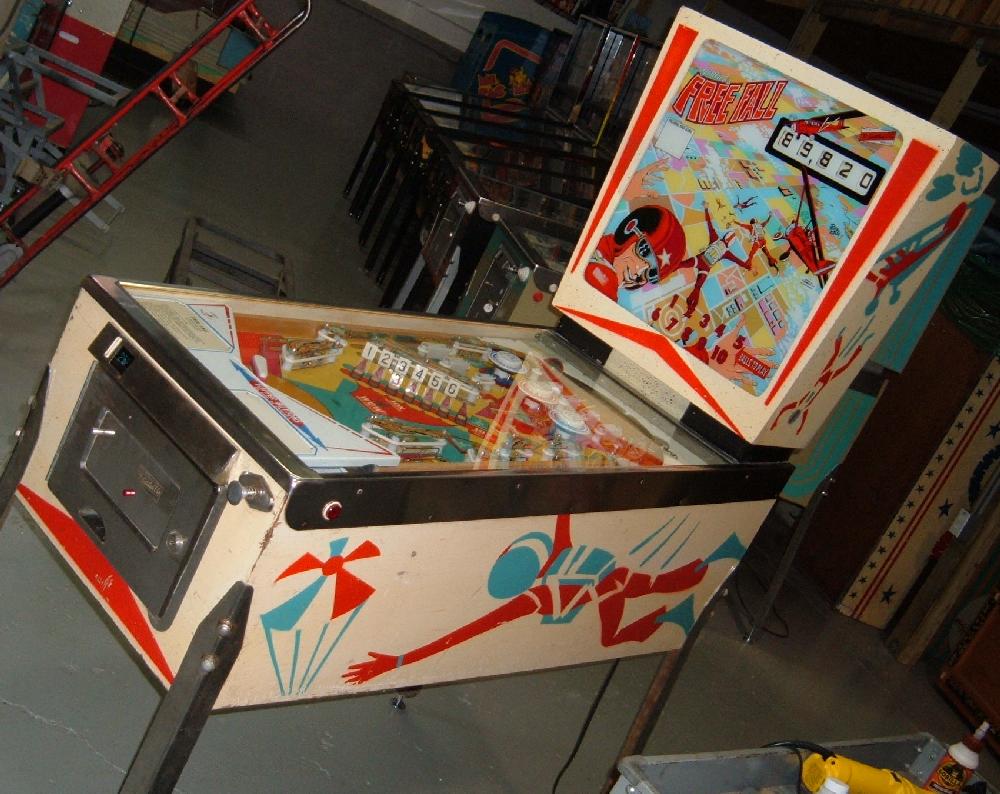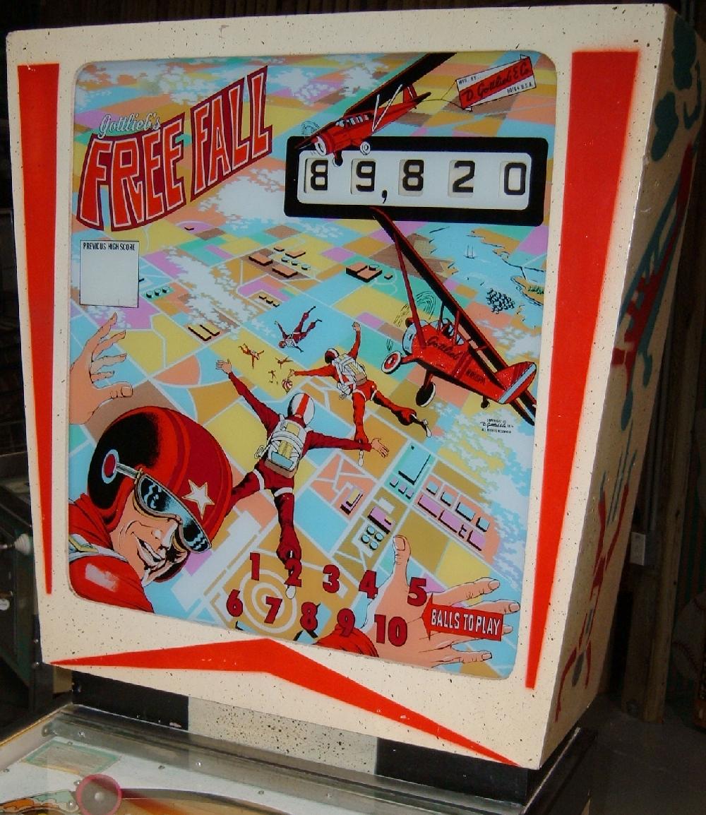 Description: Gottlieb FreeFall pinball. Same game as Gottlieb Sky Jump pinball but Freefall is the Add-a-ball version. Bank of 7 drop targets, 3 pop bumpers, 2 slingshots, two 3" flippers. Single player wedgehead cabinet design. They made 4200 Gottlieb Sky Jump pinballs in the replay version, and 3450 Gottlieb Free Fall add-a-ball pinballs. They also made an Italian version of this game called Gottlieb Sky Dive (2260 made). If player scores all 7 rollovers, the drop targets light for add-a-ball. But the AAB only lasts for the current ball (once the ball drains, all the rollovers reset and the player must score them again to get WOW back.) During WOW the drop target bank alternates which set of 3 outside drop targets light for AAB. (This alternames with the 10 point scoring, and the center drop target is always lit for AAB during this time.) If you have a Gottlieb Free Fall for sale, please contact me at cfh@provide.net