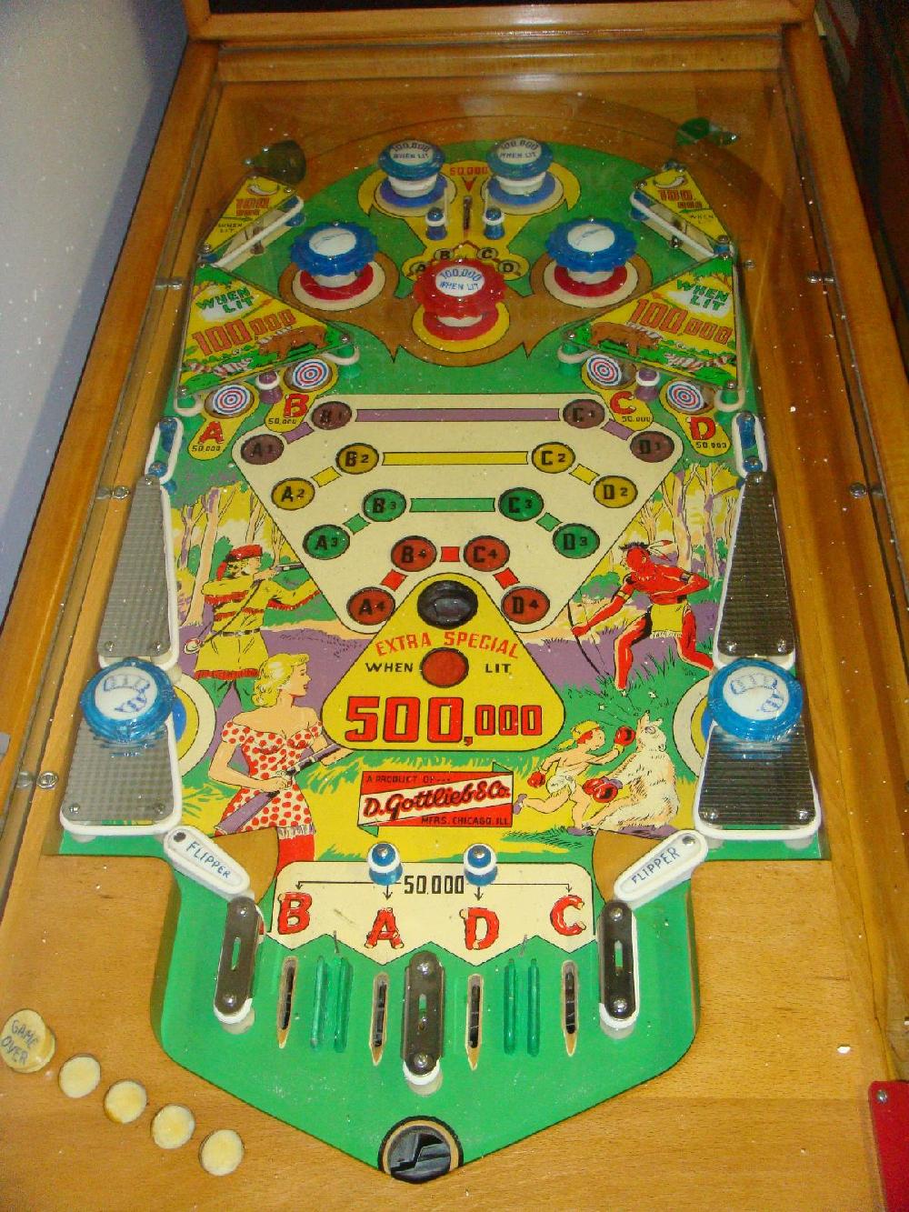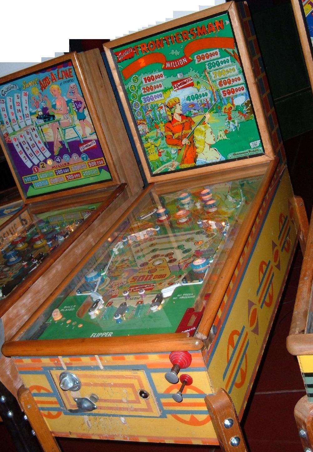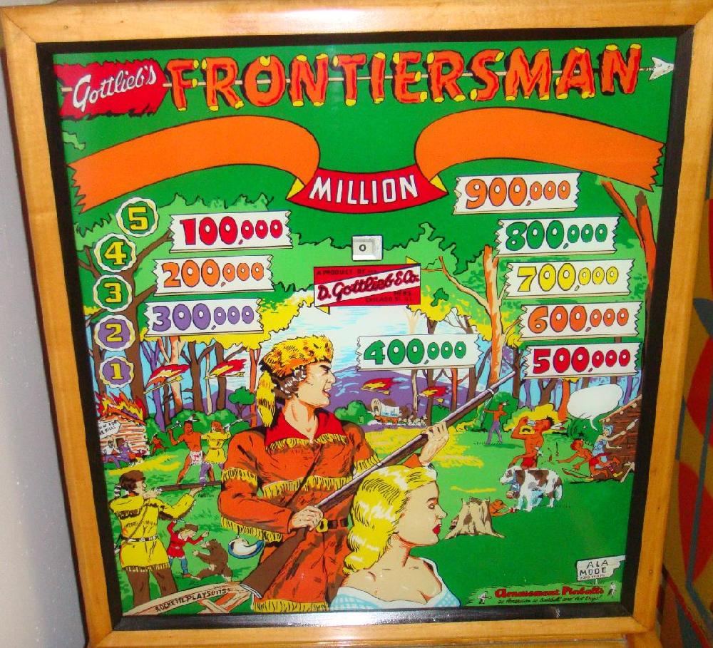 Description: Frontiersman, 11/55, 1000 produced, 1 gobble hole, the last Gottlieb with wooden legs, carry over replay feature, can win up to 10 credits, woodrail pinball. Artwork by Roy Parker. If you have this game for sale please contact me at cfh@provide.net