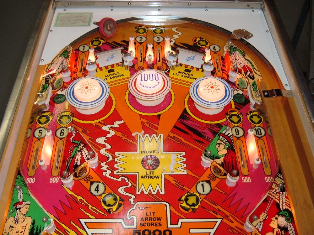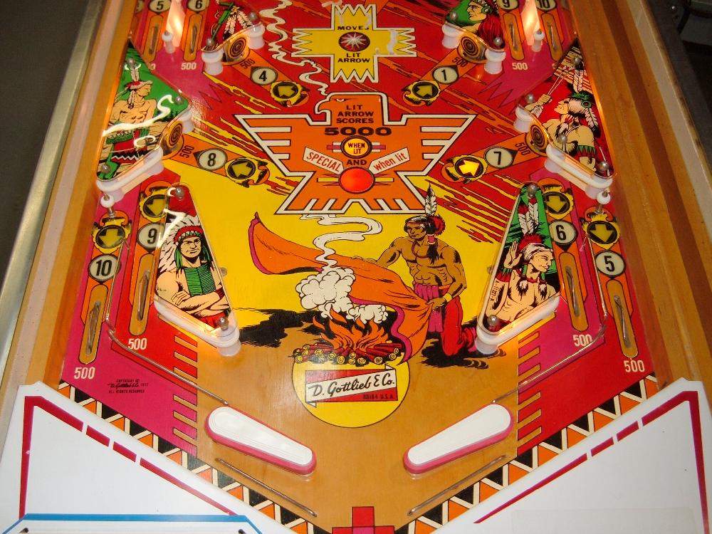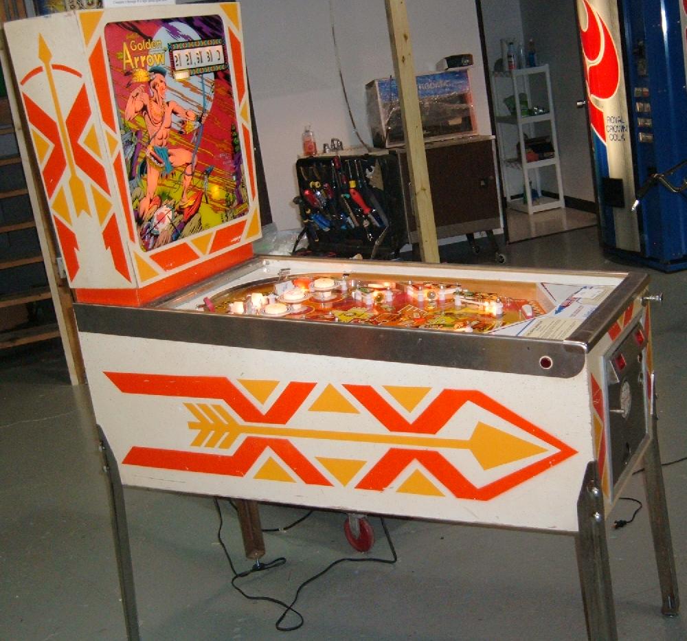 Description: Gottlieb Golden Arrow pinball. They made 1530 Gottlieb Golden Arrow pinballs in the replay version. (There was not Add-a-ball version made of this game.) Neat game play. The object is to get all 10 rollovers (though 2 of the 10 numbers are standup targets.) There's also two spinners, three pop bumper, two slingshots. There's a moving arrow that changes target when ever the center rollover button is scored. If the player gets a lit target that has a lit arrow, they are awarded 10,000 points (and a large 4" bell rings.) Only 5000 points are awarded if the arrow is pointing to an unlit target. It's a fun game as it's hard to get all 10 rollovers. If you have a Gottlieb Golden Arrow pinball for sale please contact me at cfh@provide.net