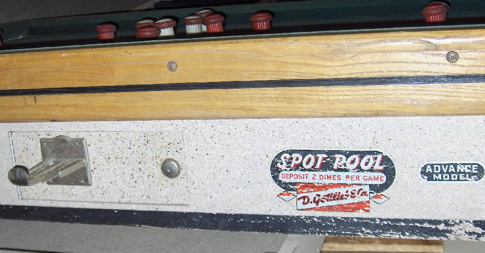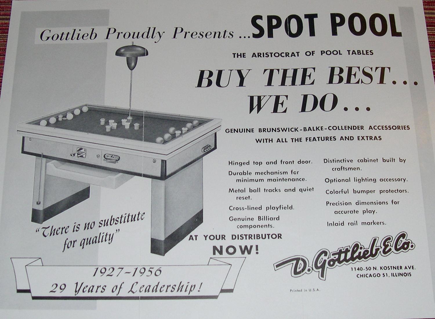 Description: Spot Pool, Gottlieb, 1956. I don't have a lot of info on this game, but apparently Gottlieb Spot-Pool was Gottlieb's attempt at another style of coin operated game.