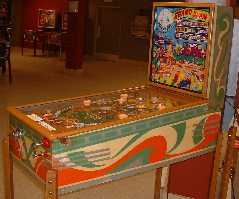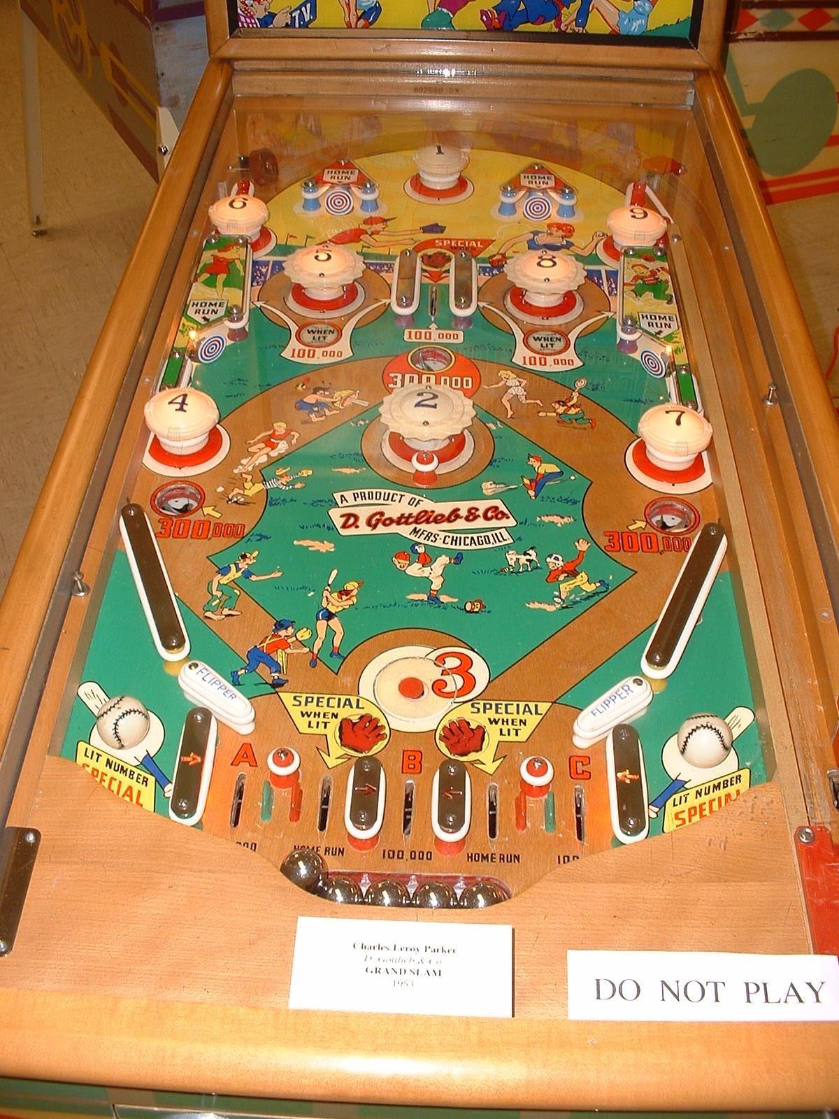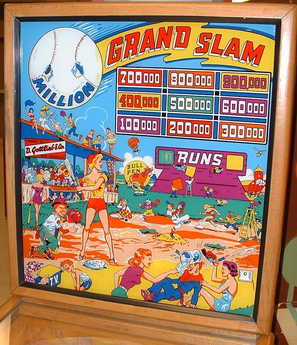 Description: Grand Slam, 4/53, 1800 produced, 3 kickout hole. woodrail pinball. Blue tray liner. Artwork by Roy Parker. If you have a Gottlieb Grand Slam for sale please contact me at cfh@provide.net