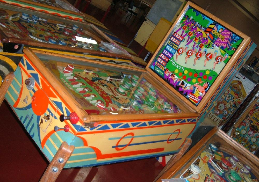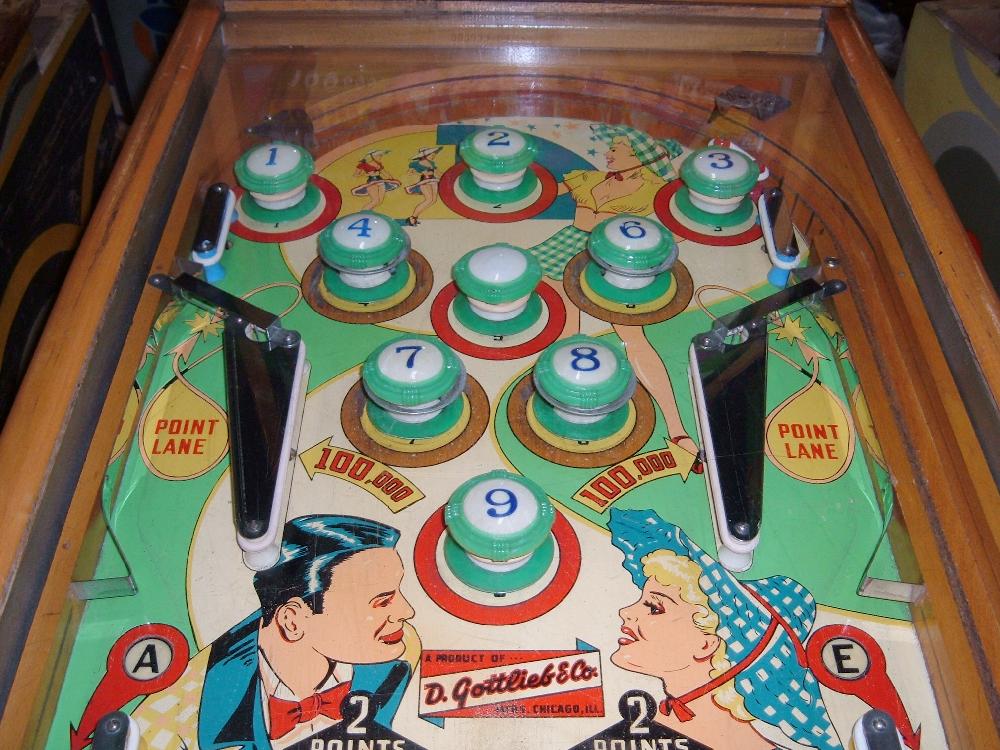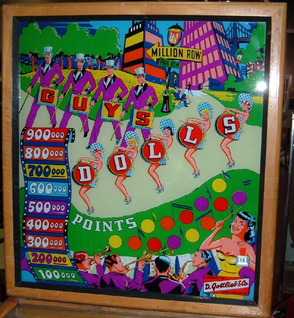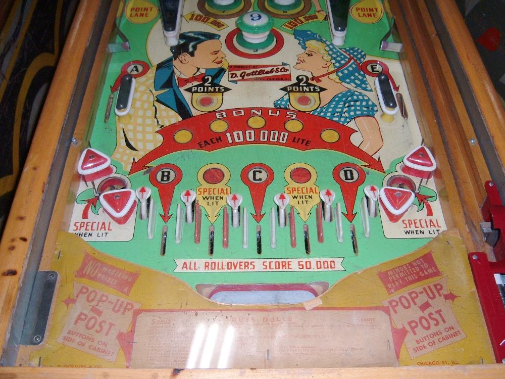Description: Guys Dolls, 5/53, 1500 produced, NO FLIPPERS but six moving posts (with arrows on them, move back to front) by the lower lanes which are player controlled with the flipper buttons. These posts can kick the ball, but don't allow much ball control (conpared to flippers). woodrail pinball. Artwork by Roy Parker.
