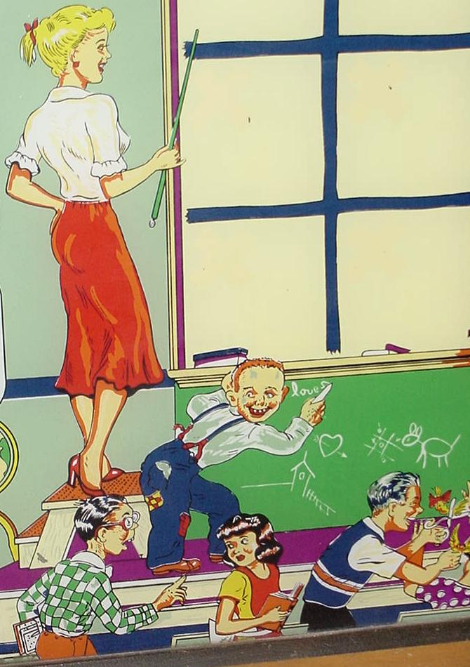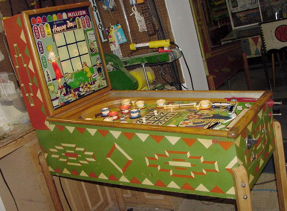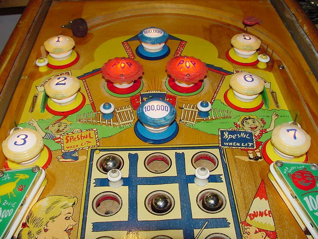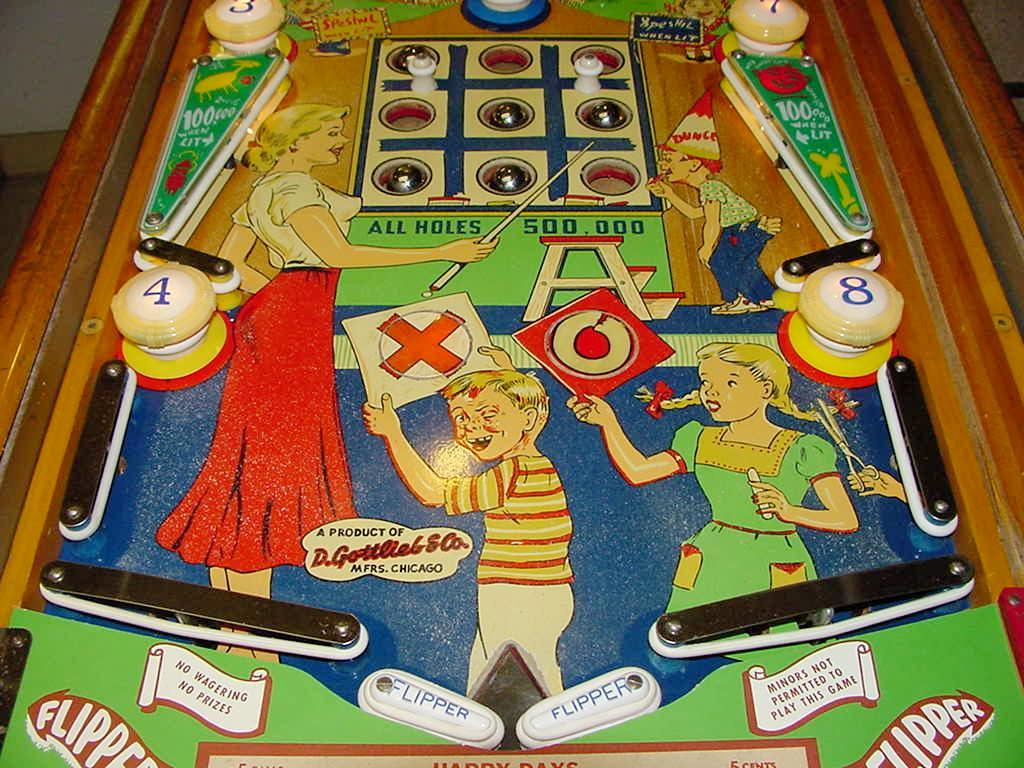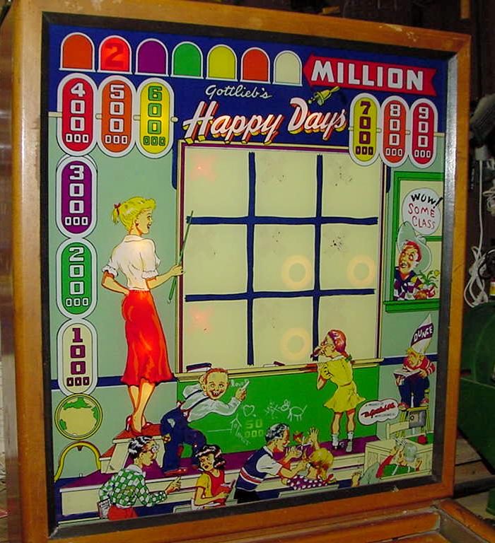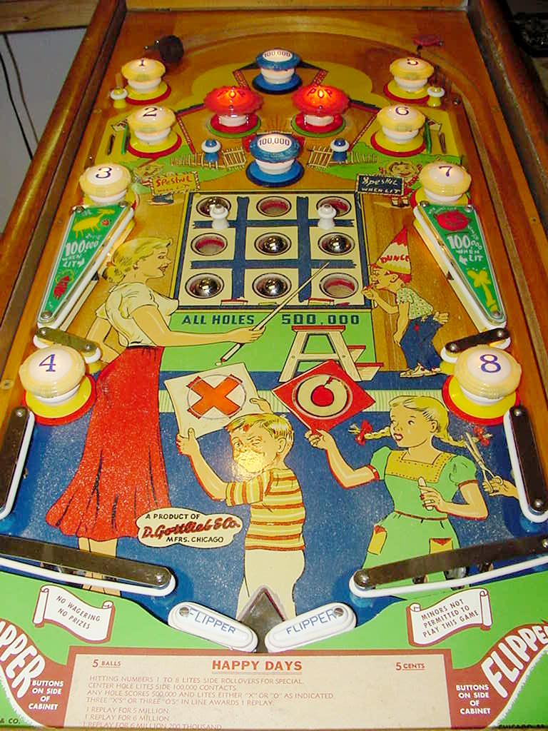 Description: Happy Days, 7/52, 1150 produced, 9 trap holes, Woodrail pinball, artwork by Roy Parker. This game is unique in a couple way. First, there are no drain holes. That is, the only way to lose the ball is in one of the nine trap holes. (The drain by the flippers is in case the game is tilted, balls will have a place to reset.) The next interesting fact about this game is the artwork. Of course it was done by Roy Parker, but the girl is a blond version of the famous 1940s actor Hedy Lamarr. And the kids in the artwork are supposed to be the Gottlieb family. Finally the Dunce is Roy Parker himself! Hitting any 10,000 point switch will toggle the trap hole indicator from "O" to "X" (or vice versa). The object is to complete a tic-tac-toe like line in the trap holes. Getting three balls in a line in the trap holes (all "O" or all "X") will award a replay. Getting a ball in the center trap hole will light the side bumpers for 100,000 points. Completing the number sequence bumpers 1-8 (does not have to be in order) will light the two side rollover lanes for replay. Please contact me if you have a Gottlieb Happy Days woodrail pinball for sale at cfh@provide.net