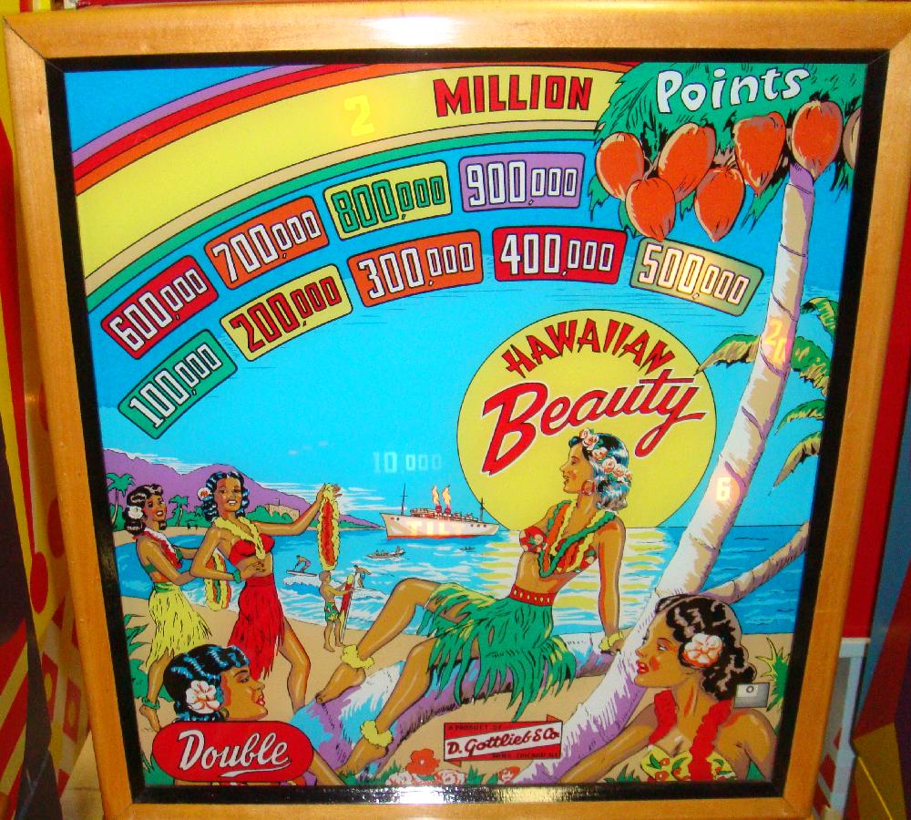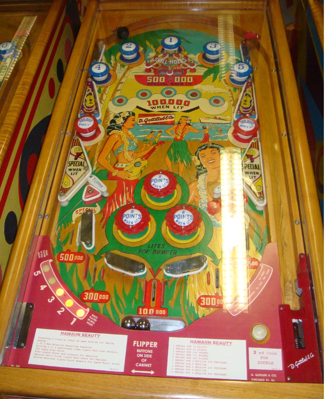 Description: Hawaiian Beauty, Gottlieb, 5/54, 900 produced, 2 gobble holes, double award, 3 pop bumpers below the flippers at bottom of playfield, balls played lights on lower ball arch. woodrail pinball. Artwork by Roy Parker. Often the playfield plastics on this game are curled and shrunken. You can make your own plastics using this file. If you have a Gottlieb Hawaiian Beauty woodrail pinball for sale please contact me at cfh@provide.net