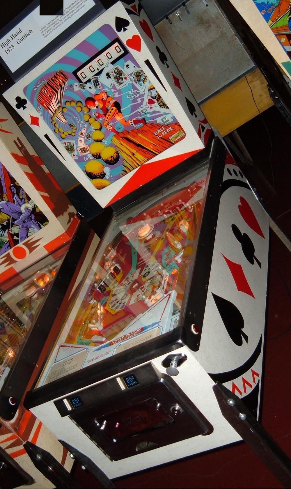Description: Gottlieb High Hand pinball. Same game as Gottlieb Capt Card pinball. Lots of drop targets and a center kick out hole, two 3" flippers. Single player wedgehead cabinet design. Four banks of 4 drop target (one bank for each card suit). Card theme pinballs were very popular and easy to understand the game play, and this is no exception. They made 4950 Gottlieb High Hand pinballs in the replay version, and 675 Gottlieb Captain Card add-a-ball pinballs. They also made an Italian version of this game called Gottlieb Top Hand (2889 made). If you have a Gottlieb High Hand pinball for sale, please contact me at cfh@provide.net