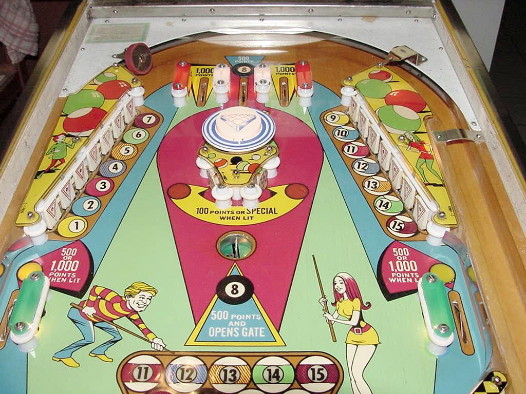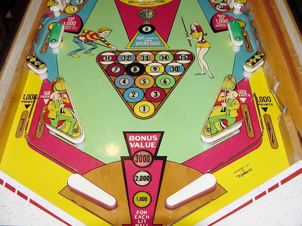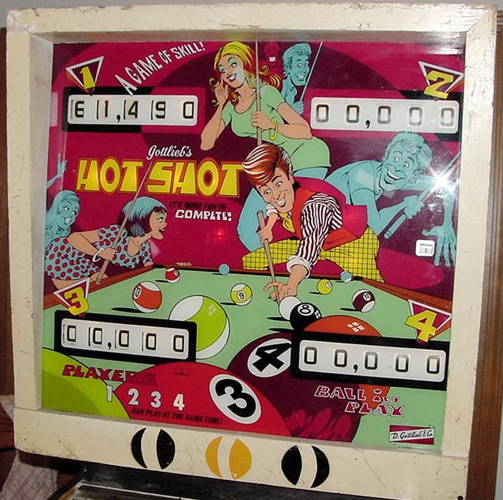 Description: Gottlieb Hot Shot pinball, Gottlieb Big Shot pinball. Same game as Gottlieb Big Shot, just different number of players (4 players versus 2 players). Gottlieb sold this game design in the two flavors, though they are essentially the exact same game (with slight artwork differences). The 2 player version (BigShot) had a lower price than the 4 player (HotShot), and was marketed to game operators with less money to spend. There are two banks of 7 drop targets, a single pop bumper, two 3" flippers, two slingshots, one kickout hole, and an outlane return gate. Putting the ball in the 8-ball kickout hole opens the outlane return gate. Knocking down all the drop targets on one side or the other (solids or strips) lights one of the center standup targets for Replay (the two center targets alternates as Special with a 100 point unit in the backbox). The score card for this game is available in Photoshop format here. They made 9000 Gottlieb Hot Shot pinballs, and 2900 Gottlieb Big Shot pinball machines. They also made a single player AAB version of this game called Pro Pool (800 units made).