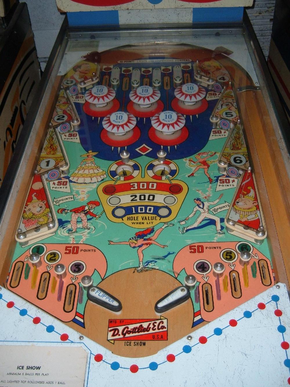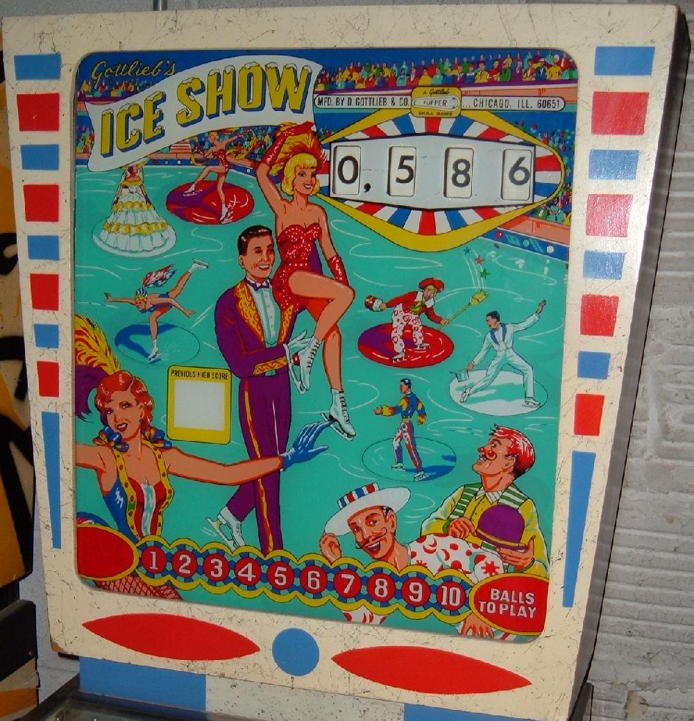 Description: Gottlieb Ice Show pinball, 1/66, 2000 produced, Add-a-Ball version of Ice Revue (12/65 replay), 2 kick-out holes, light animatation in backbox. Uses five pop bumpers instead of Ice Revue's three pop bumpers. If you have a Gottlieb Ice Show pinball for sale please contact me at cfh@provide.net