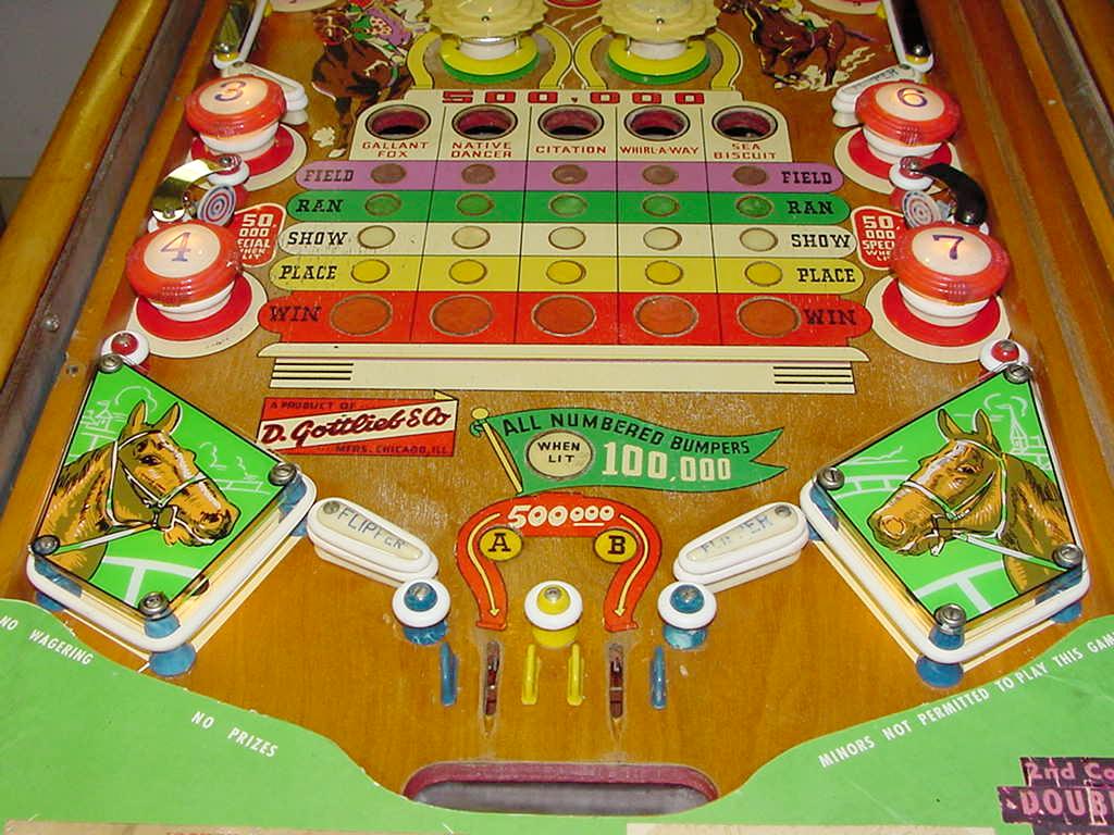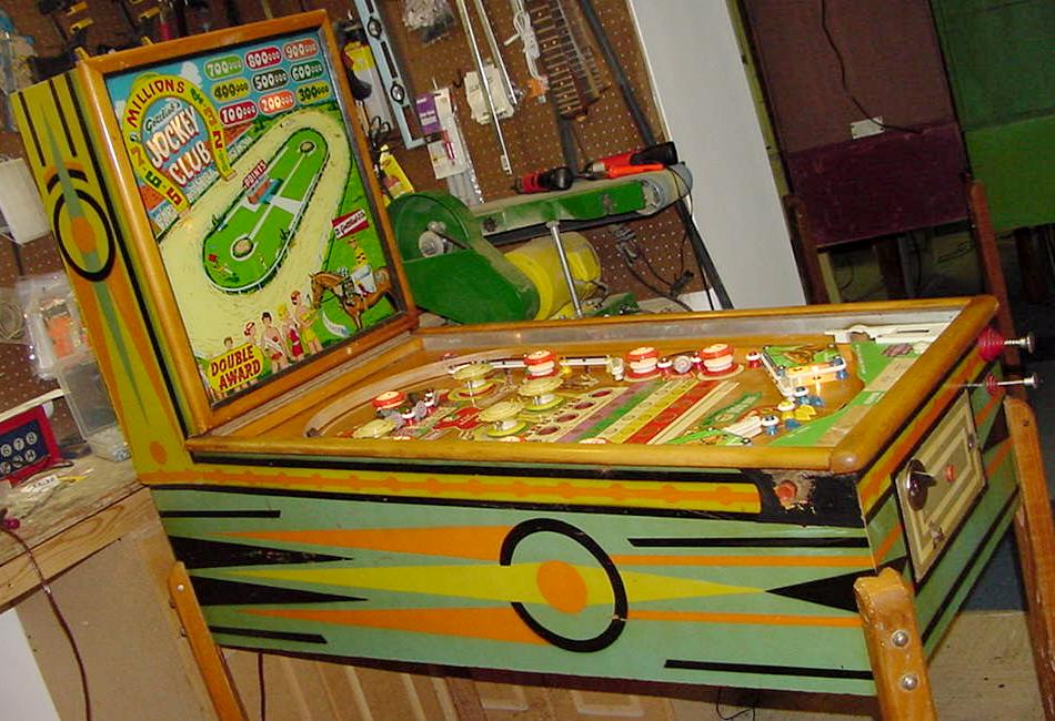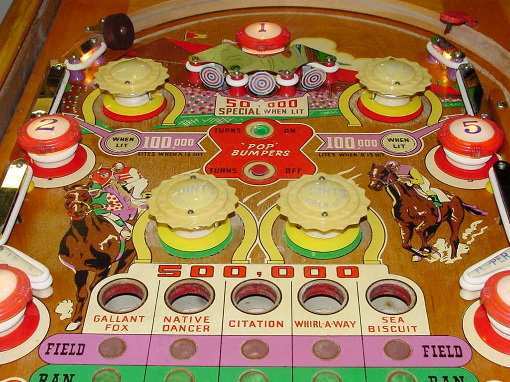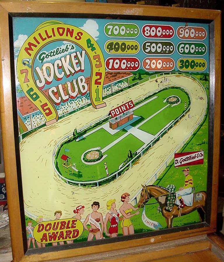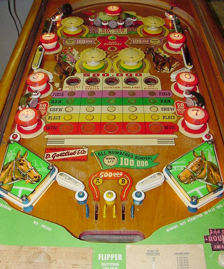 Description: Jockey Club, 4/54, 1150 produced, 5 gobble holes, double award game, woodrail pinball. Artwork by Roy Parker. To play for double award, insert a second coin after the machine has reset, but before shooting the first ball. Playing the second coin will double all awards. Replays are won multiple ways. Hitting the static bumper 1 to 7 (in order) will light the standup targets for replay (lower standups alternate via the 10k stepper, upper three standups have one lit target that rotates via 10k stepper). Interestingly, after the standups are lit for replay, the unlit standups score no points. Also the slingshots by the flippers give no points! The gobble holes also award replays. One ball in each of the five gobble holes will award one replay. Three balls in one hole (show) awards one replay. Four balls in one hole (place) awards 3 replays. Five balls in one hole awards 8 replays. Unlighting the lower A and B rollovers will make all the numbered 1-7 static bumpers worth 100k (instead of 10k), and two side bumpers worth 100k. Replays also awarded based on points (adjustable). If you have this game for sale please contact me at cfh@provide.net