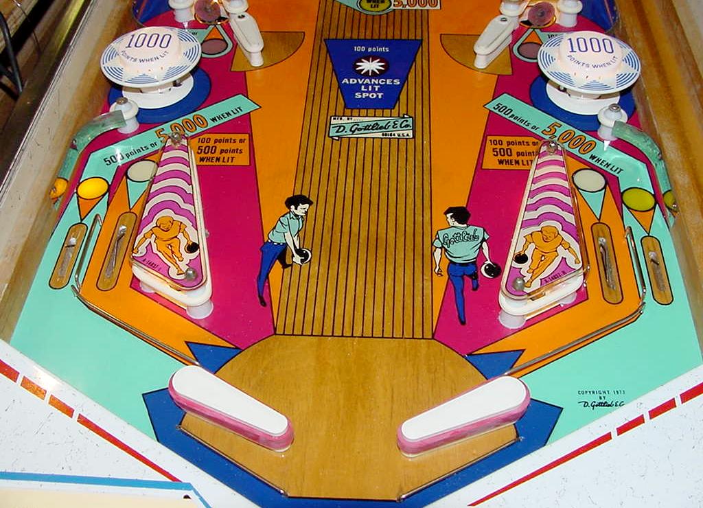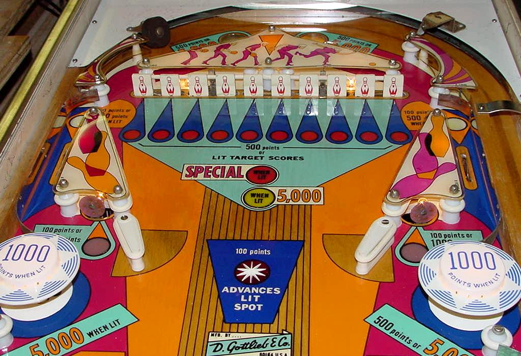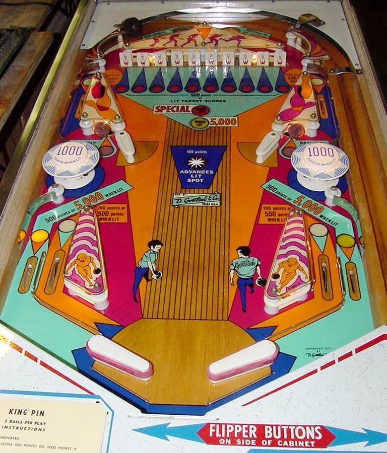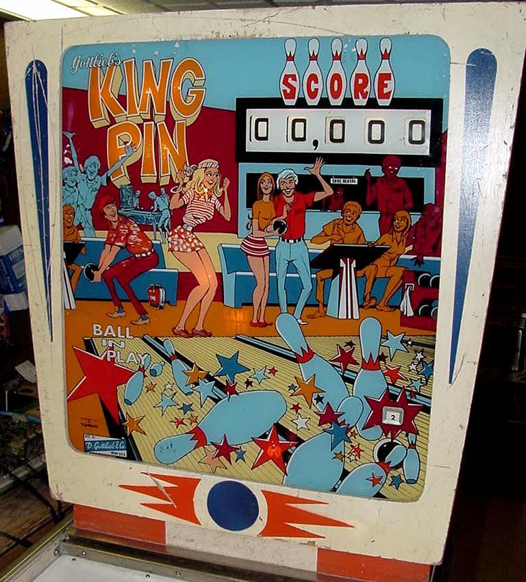 Description: Gottlieb King Pin pinball. Same game as Gottlieb Pin-Up (add-a-ball version) pinball. Ten drop targets in a straight bank. Single player wedgehead cabinet design. The horizontal bank of 10 drop targets (one for each bowling pin) have a set of two kickout holes above them. Two pop bumpers and two slingshots. A pair of 2" flippers towards the top of the playfield, and a pair of 3" flipper at the bottom. This pinball design is a modification of Gottlieb's Jack in the Box design. Personally I like this format better, as there's better player control and the pop bumpers don't tend to kick the pinball down the drain. They made 4350 Gottlieb King Pin pinballs in the replay version, and 715 Gottlieb Pin Up add-a-ball pinballs. Score cards ZIP'ed and in Photoshop format can be downloaded here (2meg). The rules for Gottlieb King Pin pinball are fairly straight forward - knock down all the drop targets! The drop targets score 500 points, except for the one lit drop target that scores 5000 ponts (on 3 balls this happens from game start, on 5 balls this happens after knocking down all drop targets one time). After knocking down all the drop targets (once for 3 ball, twice for 5 ball), one light in front of the drop targets will signify that target as "Special" (replay). This light can move, if the ball hits the center rollover star. On a 3 ball game, the lit drop target turns on and off with the match stepper unit (on a five ball game this light is always on after knocking down all drop targets two times) The kickout holes across the top of the playfield and the lower outlanes alternate for 500 or 5000 points. The inlanes and top side rollovers light for 100 or 500 points (on a 3 ball game they are lit for 500 points from game start, on a 5 ball game they light after all drop targets are knocked down once). Other than that, there isn't much to this game other than to knock down all the drop targets, then rinse and repeat. You can read about the restoration of this game here. If you have a Gottlieb King Pin pinball for sale, please contact me at cfh@provide.net