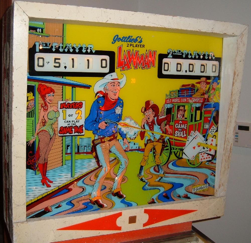 Description: Gottlieb Lawman pinball. Same game as Gottlieb Sheriff, just different number of players (4 players versus 2 players). Gottlieb sold this game design in the two flavors, though they are essentially the exact same game (with slight artwork differences). The 2 player version (Lawman) had a lower price, and was marketed to game operators with less money to spend. The single player version of Sheriff/Lawman is the 1975 Gottlieb Atlantis pinball. Uses a bank of 10 drop targets along the left side of the playing field. Two pop bumpers, two slingshots, and two 3" flippers. On the right side of the playing field there are two vertical lanes of rollovers. A good pinball design with lots of drop targets. They made 2900 Gottlieb Sheriff pinballs, and 1750 Gottlieb Lawman pinball machines. The score cards for Lawman are available here. If you have a Gottlieb Sheriff pinball or Gotltieb Lawman pinball for sale, please contact me at cfh@provide.net