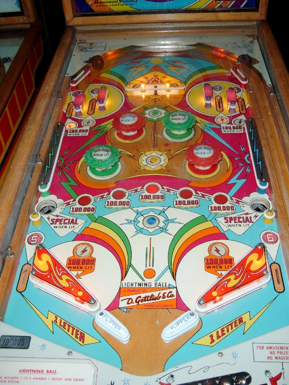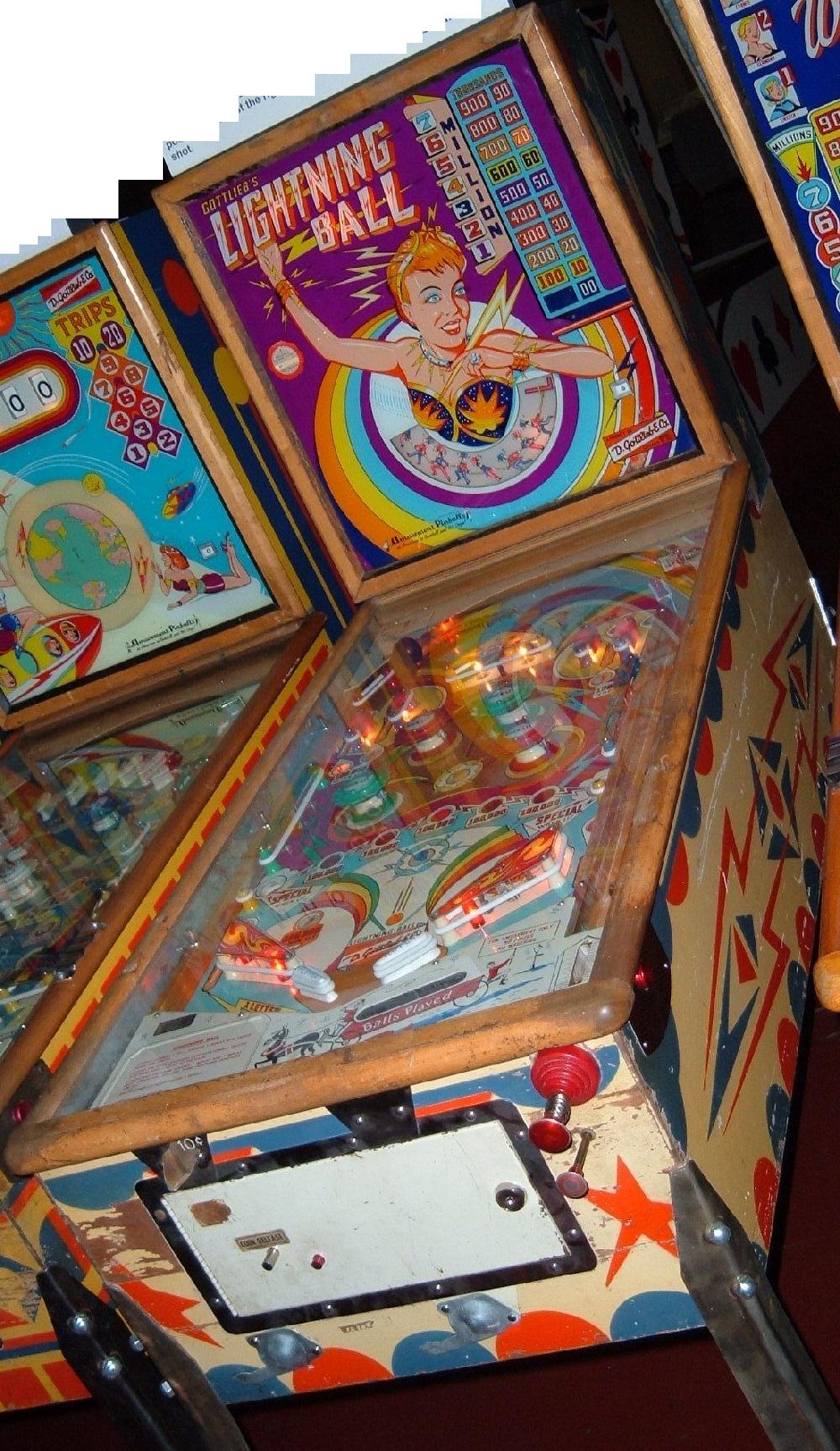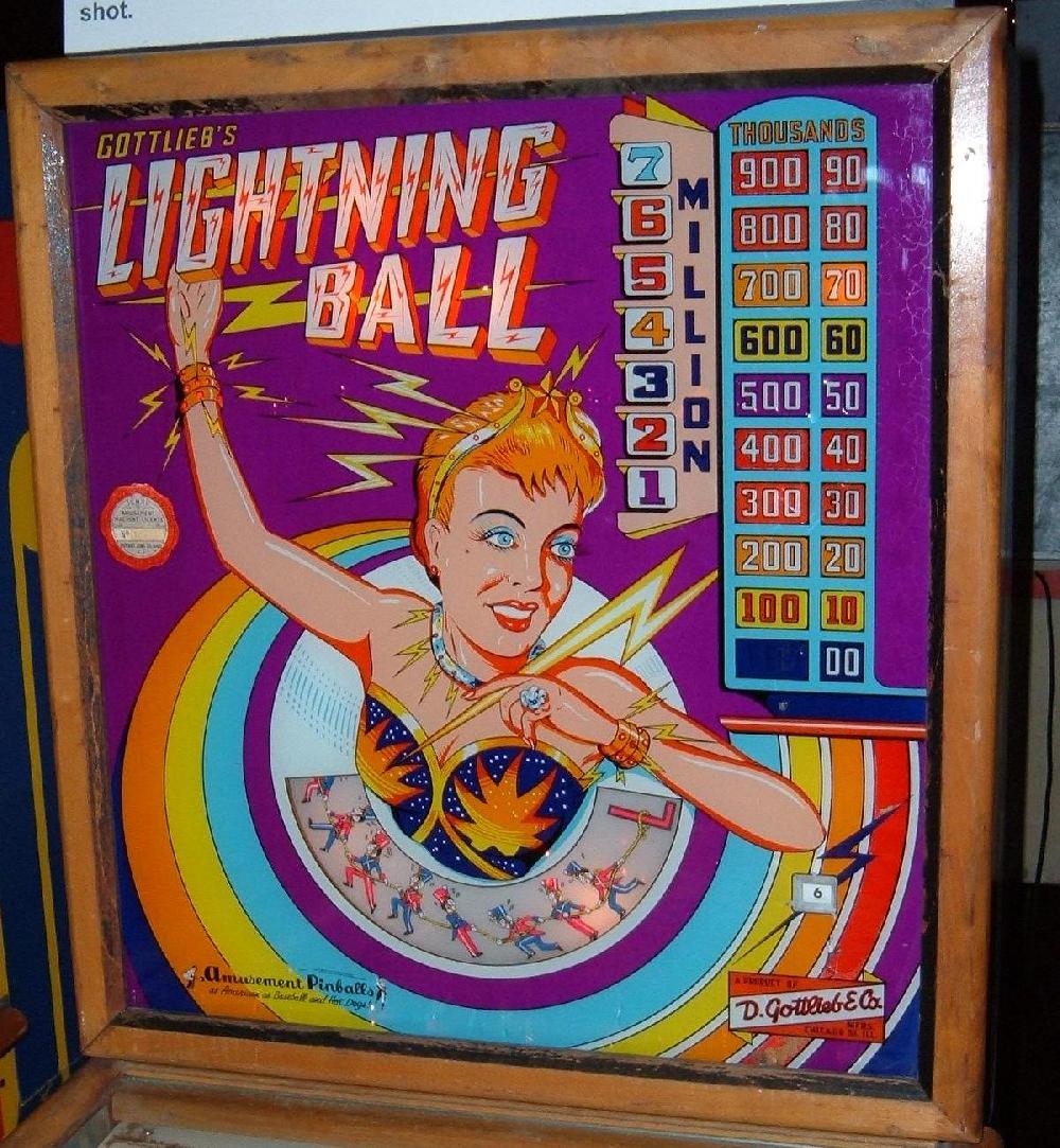 Description: Lightning Ball, 12/59, 950 produced, 1 player with light bulb scoring, 2 gobble holes, backbox mechanical animation (disc that spins). Roy Parker playfield and backglass woodrail pinball artwork. If you have this game for sale please contact me at cfh@provide.net