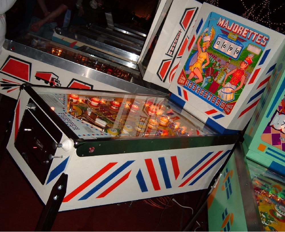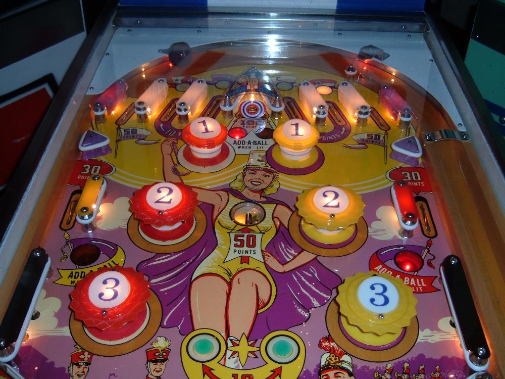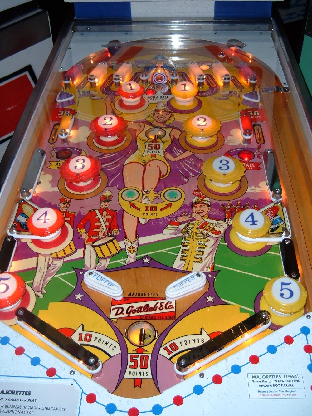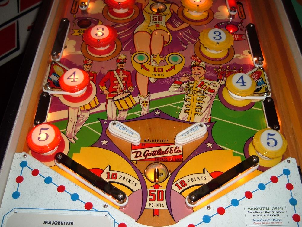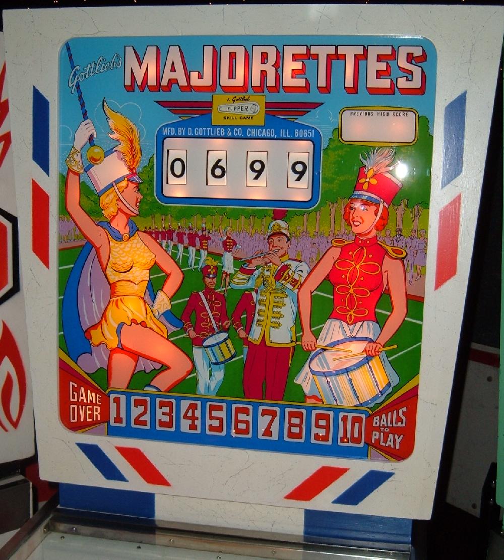 Description: Majorettes, 8/64, 425 produced, Add-a-Ball, 1 kick-out hole between flippers, 10 bumpers (4 pop bumpers, 6 static bumpers), official announcement of "jeweled" playfield posts with full production having them. BG, PF. Both. If you have a Gottlieb Majorettes pinball for sale please contact me at cfh@provide.net