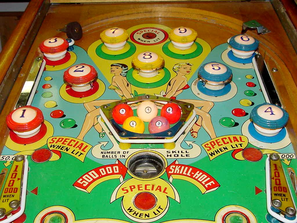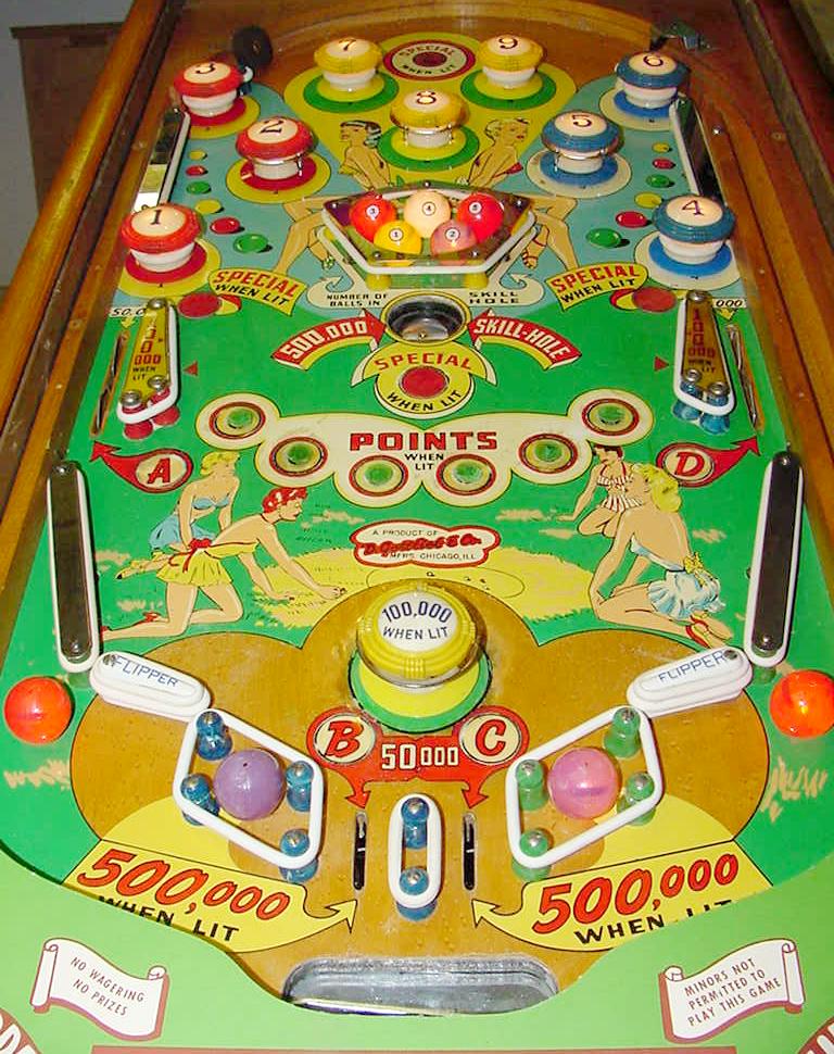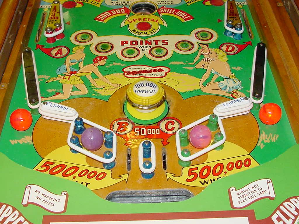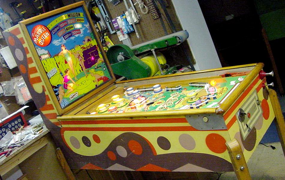 Description: Marble Queen, Gottlieb, 6/53, 1000 produced, 1 gobble hole, playfield marbles that light up. woodrail pinball marbel queen. Art work by Roy Parker. Hitting the lit numbered bumpers 1-2-3 in order will light the left side lane bumper for 100,000 points. Hitting the lit numbered bumpers 4-5-6 in order will light the right side lane bumper for 100,000 points. Hitting the remaining lit numbered bumpers 7-9 in order will light the center gobble hole and top rollover button for a replay, and light the lower pop bumper for 100,000 points. Putting all five balls in the gobble hole will light each of the five center marbles and award a replay. Also the more balls in the gobble hole, more of the six lower rollover buttons are lit (un-lit lower rollover buttons score no points). Getting the A-B-C-D rollovers will light the two side lanes for a replay. If you have this game for sale please contact me at cfh@provide.net