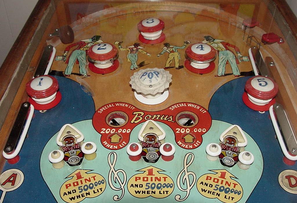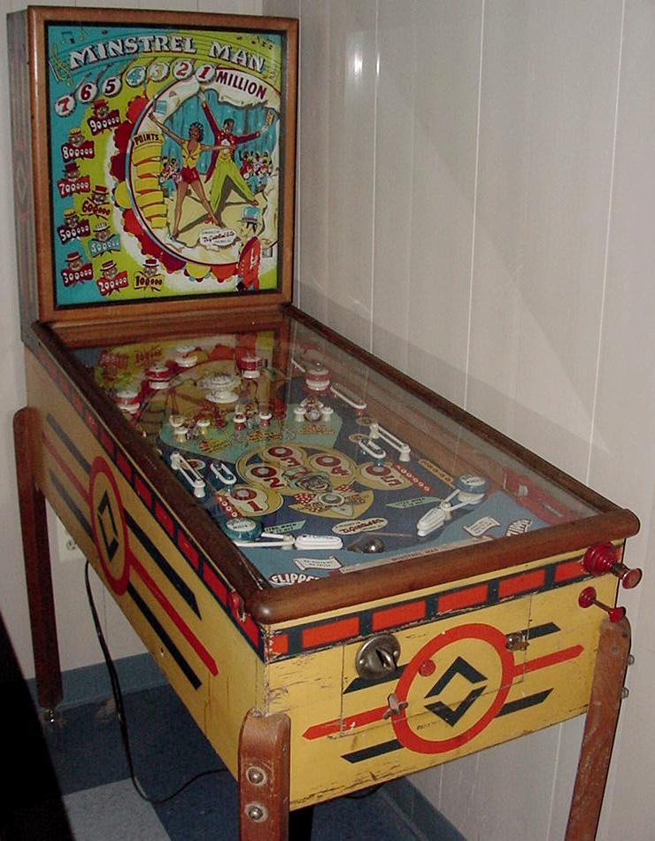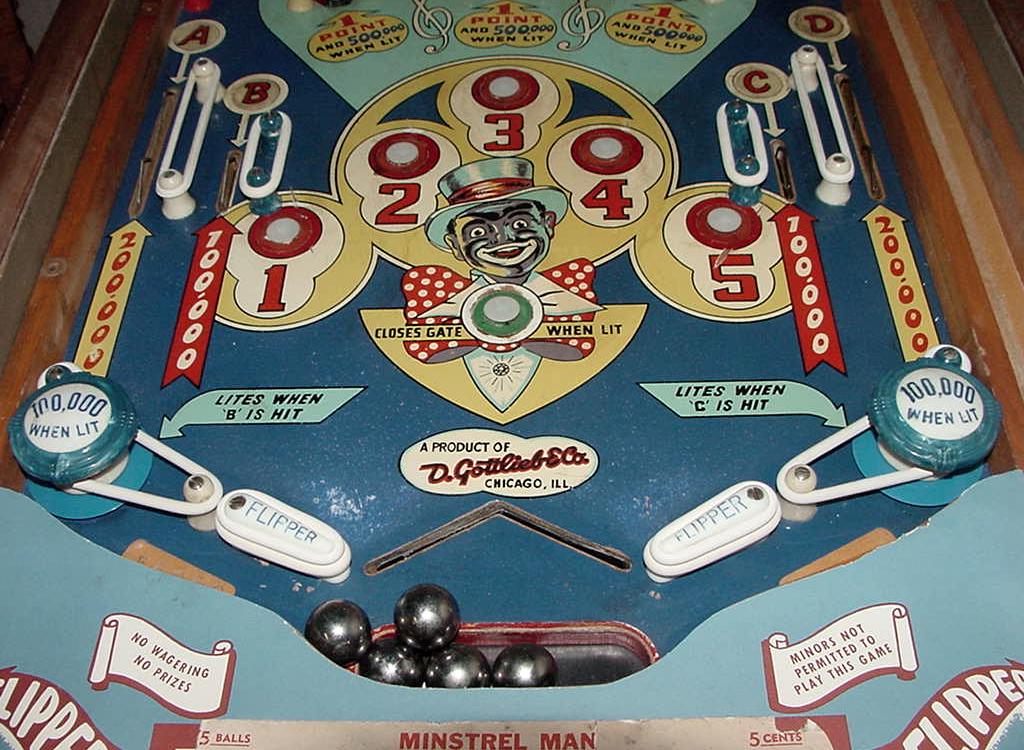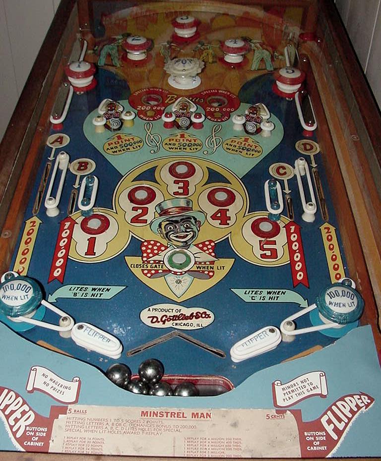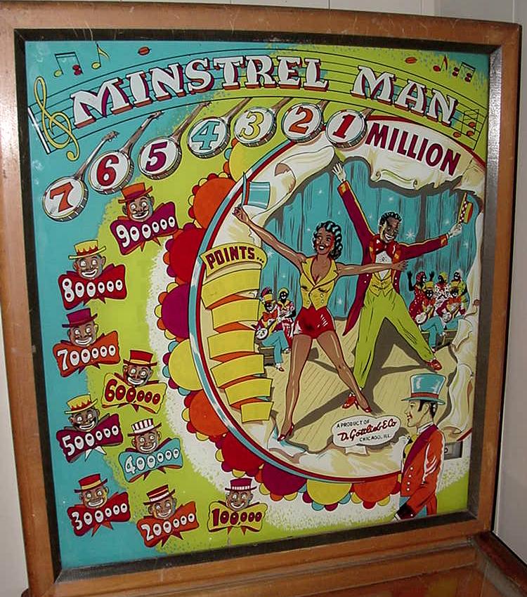 Description: Minstrel Man, Gottlieb, 2/51, 1800 produced, first Gottlieb with drop targets, safety game between flippers, 3 single drop targets that fall when a bullseye target in front is hit, Unlighting the four A-B-C-D rollover lanes sets up the two kickout holes for a special. Unlighting B and C rollover lanes turns on the two lower static bumpers for 100,000 points. Completing the 1-2-3-4-5 bumpers lights the bottom rollover to raise the safety gate. woodrail pinball. Artwork by Roy Parker with some unusual African-American Negro artwork. Times have really changed! Please contact me if you have a Gottlieb Minstrel Man woodrail pinball for sale at cfh@provide.net