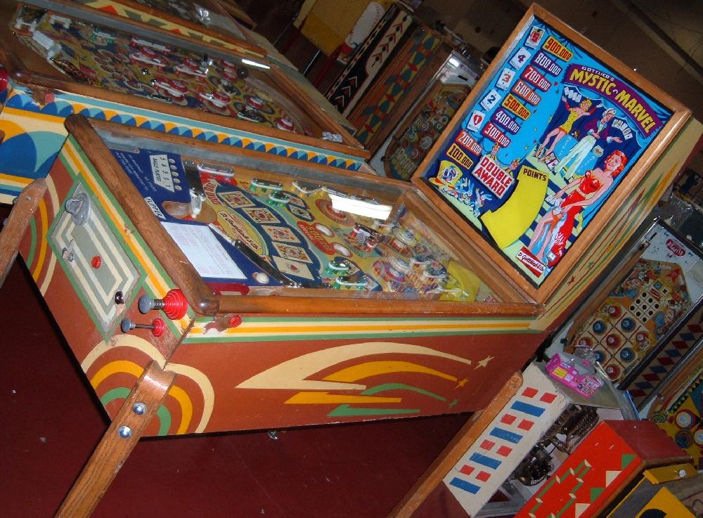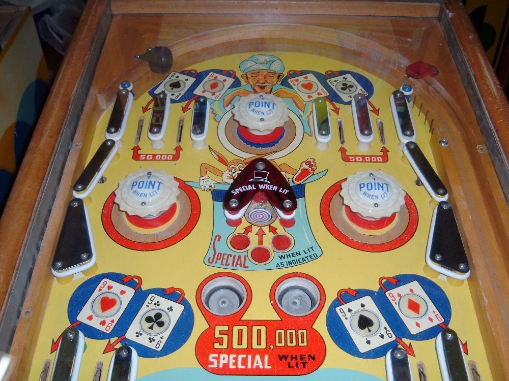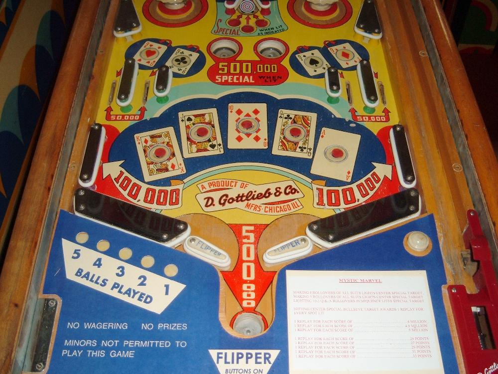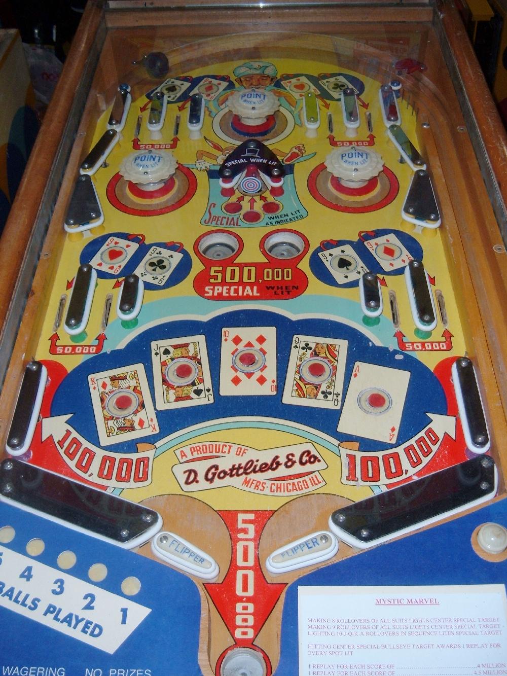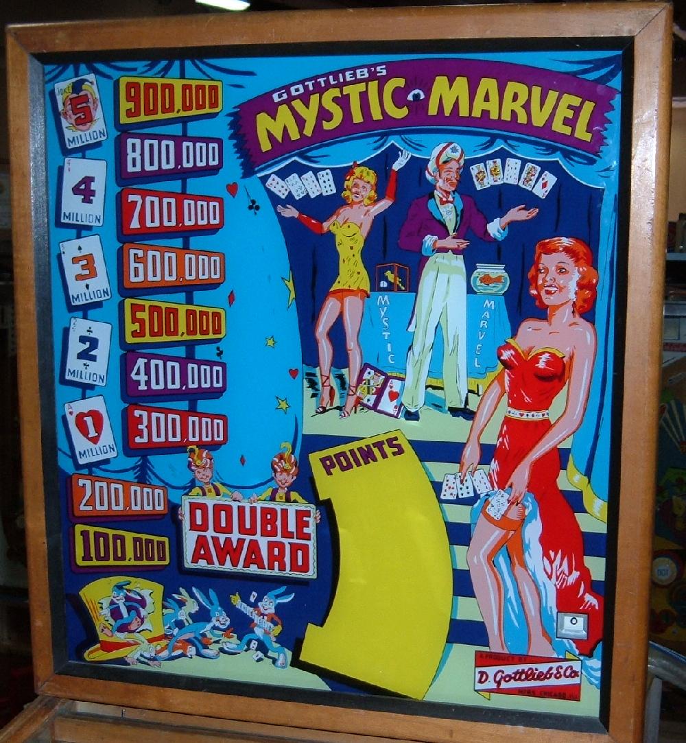 Description: Mystic Marvel, Gottlieb, 3/54, 1050 produced, 2 gobble holes, double-award, first game with "balls played" ball arch lights. woodrail pinball. Artwork by Roy Parker. If you have a Gottlieb Mystic Marvel pinball for sale please contact me at cfh@provide.net
