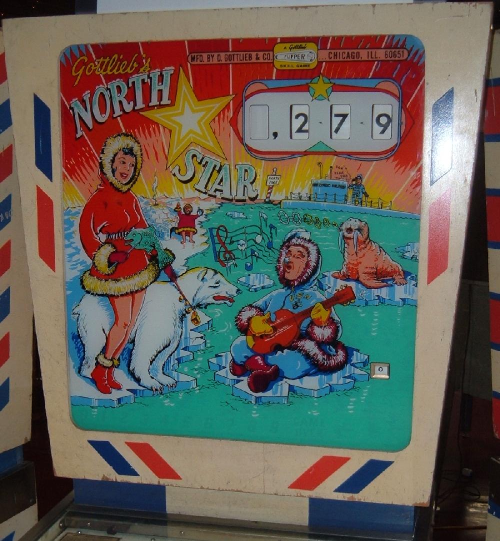 Description: North Star, 10/64, 2525 produced, 2 kick-out holes, rollover game, Art Stenholm artwork. If you have a Gottlieb NorthStar pinball for sale, please contact me at cfh@provide.net.