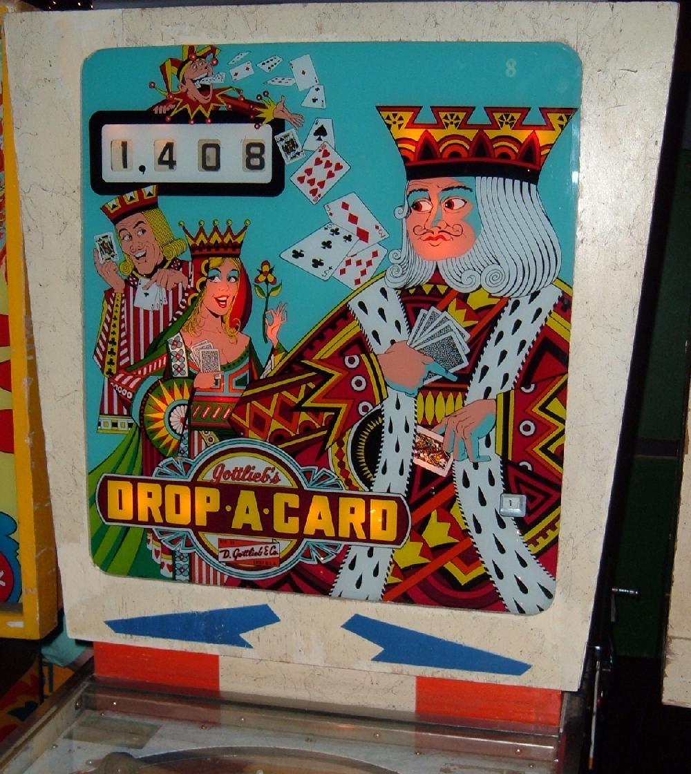 Description: Gottlieb Pop-a-Card pinball. Same game as Gottlieb Drop-a-Card pinball. Lots of drop targets, small 2" flippers. Pop-a-Card was the last Gottlieb game to use the smaller 2" flippers. Single player wedgehead cabinet design. They made 2600 Gottlieb Drop a Card pinballs in the replay version, and 825 Gottlieb Pop a Card add-a-ball pinballs. There was also an Italian version of this game called Gottlieb Card King (2340 made). If you have a Gottlieb PopaCard pinball for sale, please contact me at cfh@provide.net
