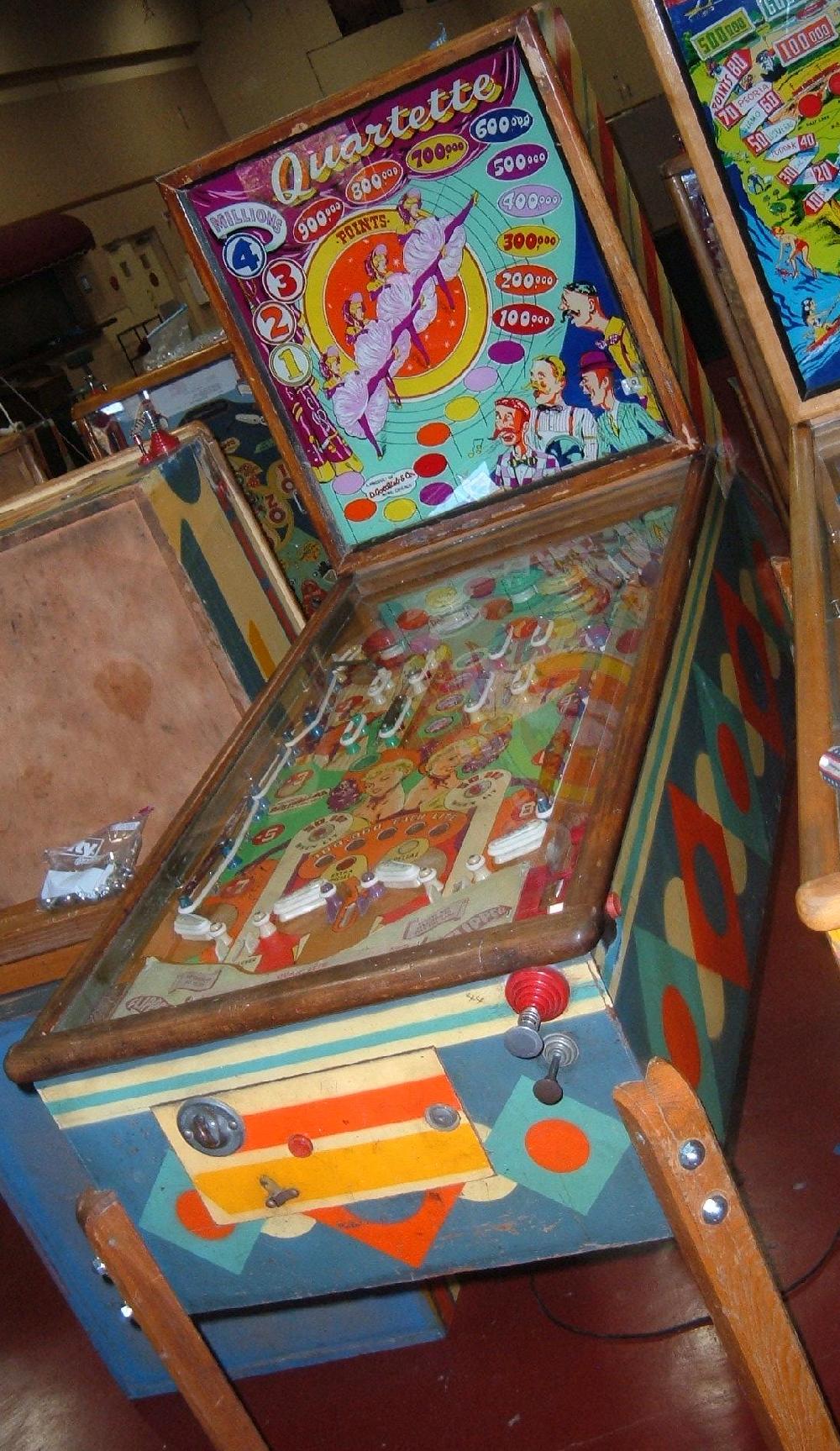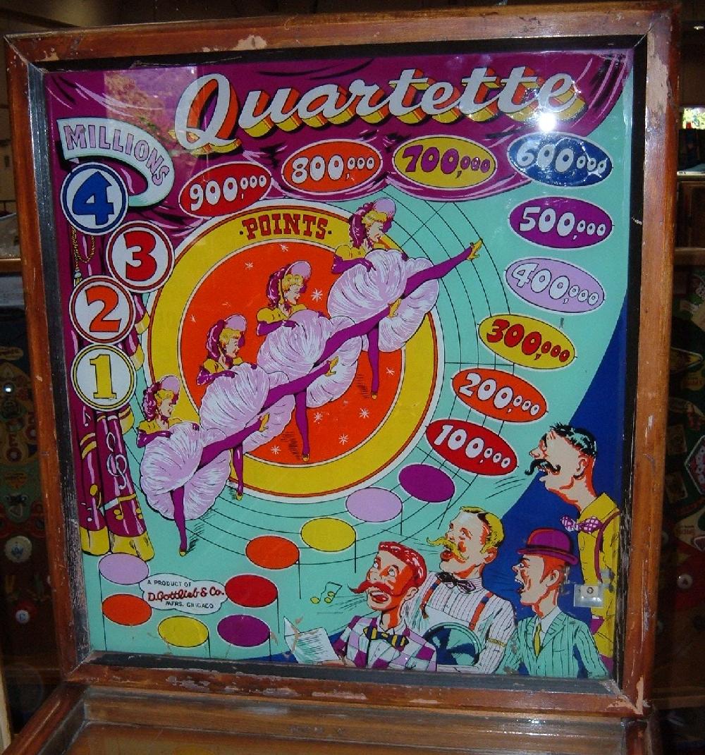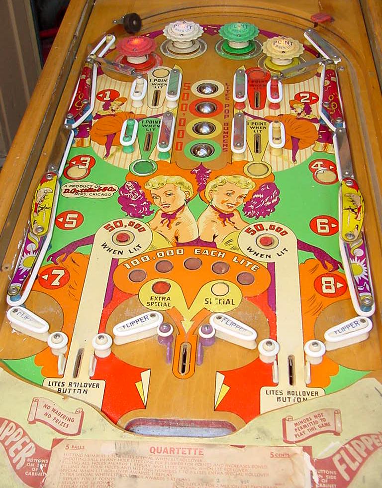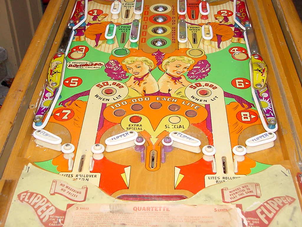 Description: Quartette, 2/52, 1450 produced, 4 flippers and 4 trap holes. Very similar to Four Stars. Woodrail pinball, artwork by Roy Parker. The right flipper button controls the two right side flippers together. Putting a ball into a trap hole lites the accompanying pop bumper for 1 point scoring. Getting a ball in each of the four trap holes awards one replay. Scoring the 1 to 8 side bumpers (not in order) lites the bottom center rollover for one replay. If there are 4 balls in the trap holes and all 1-8 side bumpers are hit, "super special" is lit on the bottom center rollover (awards 5 replays). The bottom right and left rollover lites the accompanying red button rollovers. If you have a Gottlieb Quaretette pinball for sale please contact me at cfh@provide.net