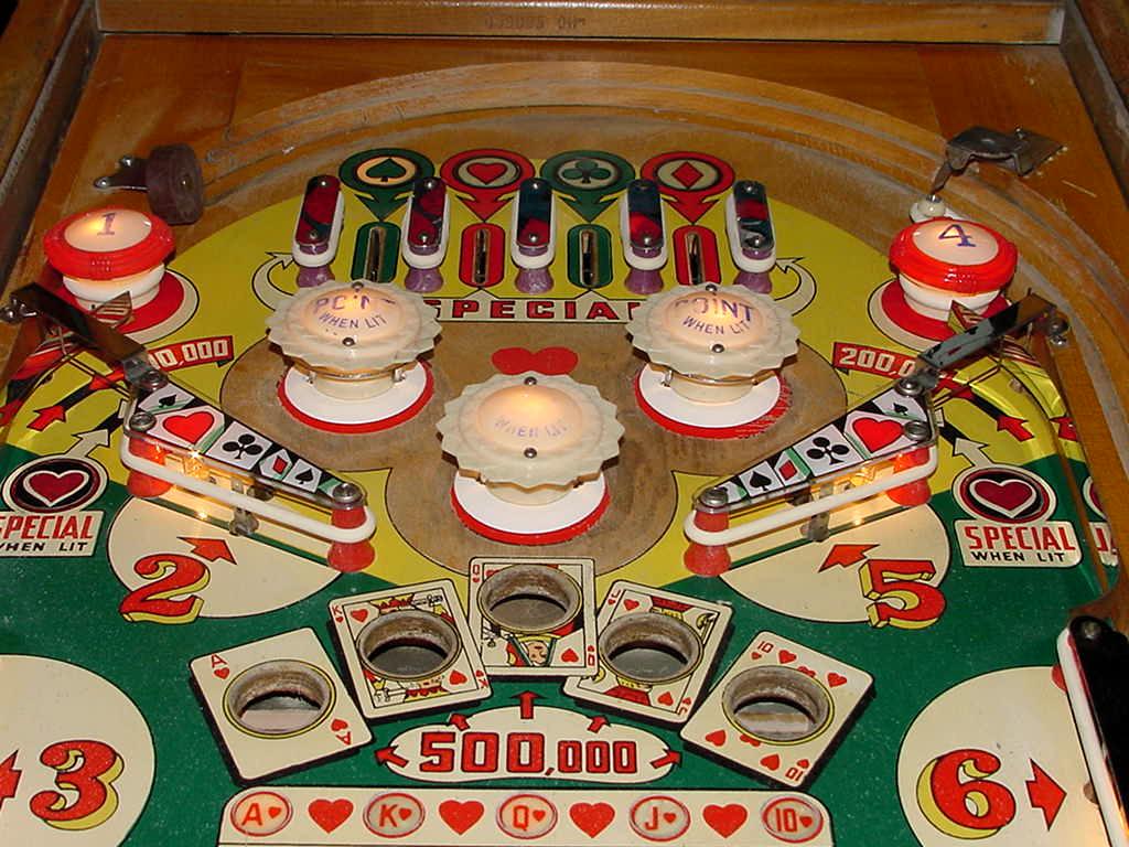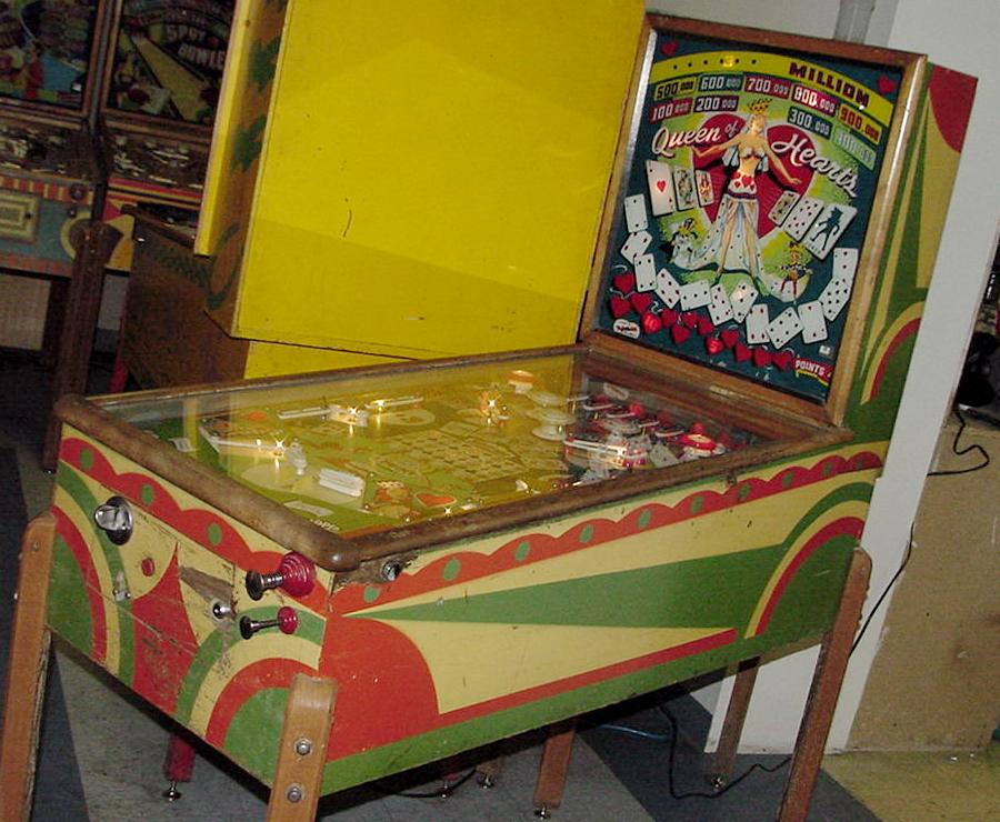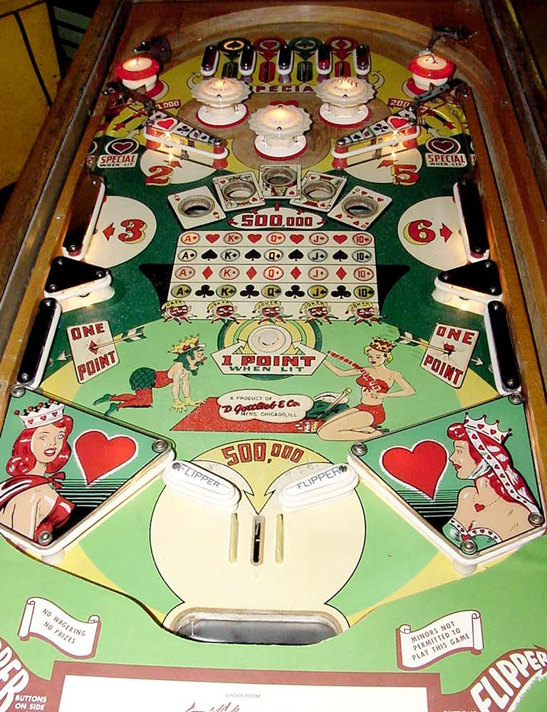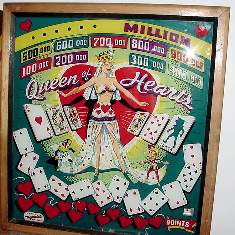 Description: Queen of Hearts, 12/52, 2200 produced, 5 gobble holes. woodrail pinball. Artwork by Roy Parker. Top rollver lanes start out lit. If all four are unlit (scored), one lane will light for a replay (lane moves with the 10,000 point unit). Two side bumpers give one point each. If 20 or more points (operator selectible) earned, a replay is awarded. Total points also reward a replay if above 5 million (operator selectible). If 1 to 6 bumpers hit (in order), two Special lights go on under the two rollunder gates. Gobble holes award multiple replays. Four of a kind, straight flush, full house all award 3 replays. If five of a kind is earned (four cards plus Joker), 5 more replays are awarded for a total of 8 replays (3+5). Backglass lights cards where there is at least one ball put in the respective gobble hole. Joker lights if game is tilted. Please contact me if you have a Gottlieb Queen of Hearts woodrail pinball for sale at cfh@provide.net