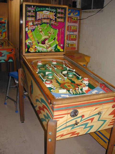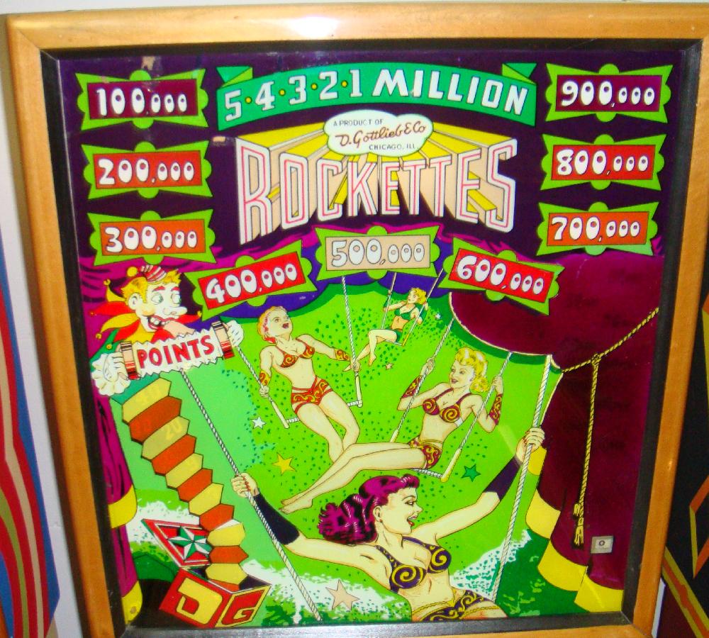 Description: Rockettes, 8/50, 1000 produced, 4 non-reverse flippers (two at mid-playfield), 4 kick-out holes. A roll-over button changes the direction of the kickout holes from north to south! (A very innovative playing feature.) Roy Parker playfield and backglass woodrail pinball artwork. Please contact me if you have a Gottlieb Rockettes pinball machine for sale at cfh@provide.net