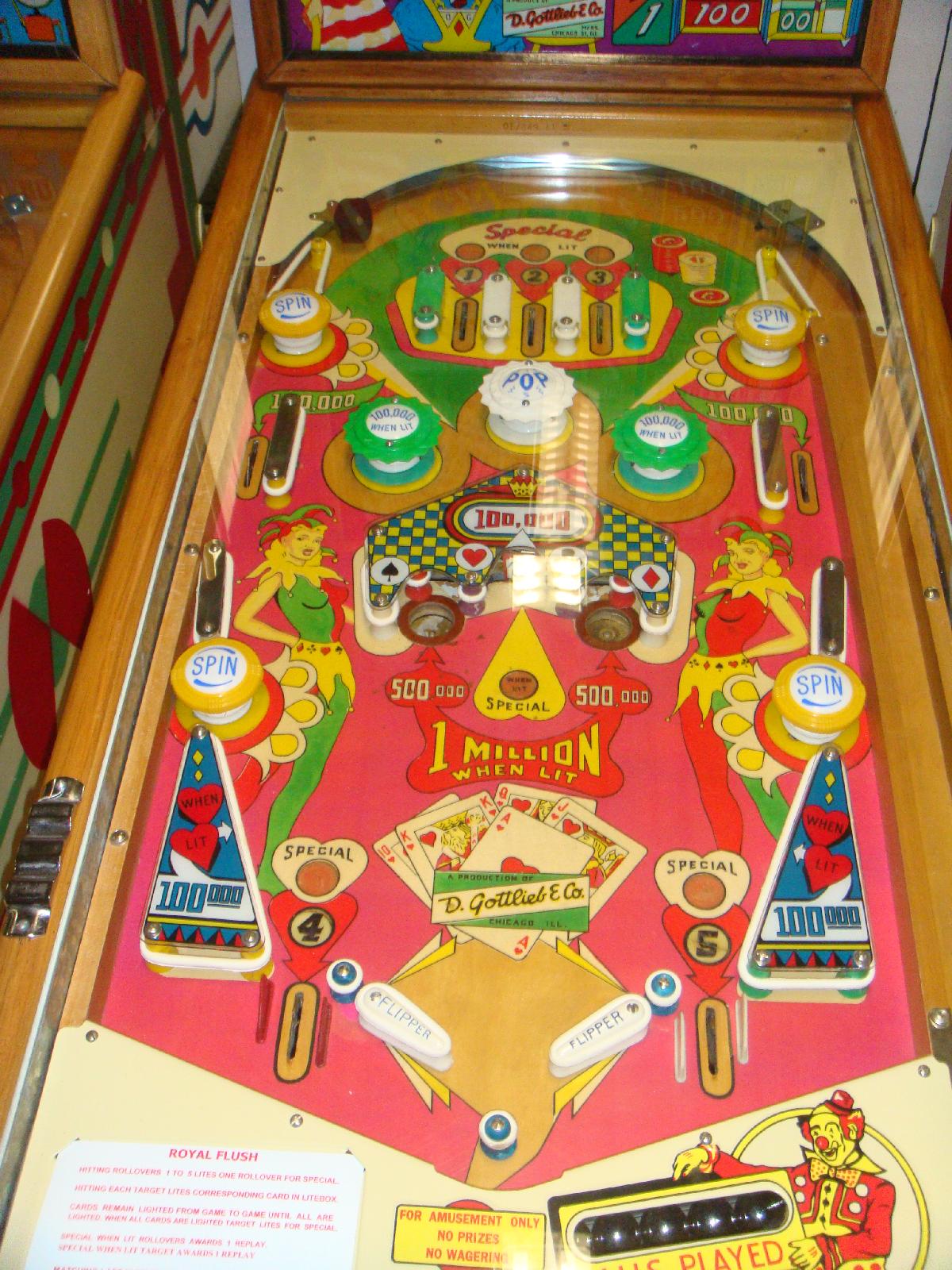 Description: Royal Flush, 5/57, 3400 produced, 2 gobble holes, roto-target, Gottlieb's first 1 player game with a Match feature. Also came factory equipped with two coin chutes, and the first Gottlieb to discount plays at three plays for 25 cents, one play for 10 cents. The last full production Gottlieb game with a wooden coin door. Woodrail pinball, artwork by Roy Parker. This game is not to be confused with the 1976 Gottlieb Royal Flush (4 player.) If you have this game for sale please contact me at cfh@provide.net