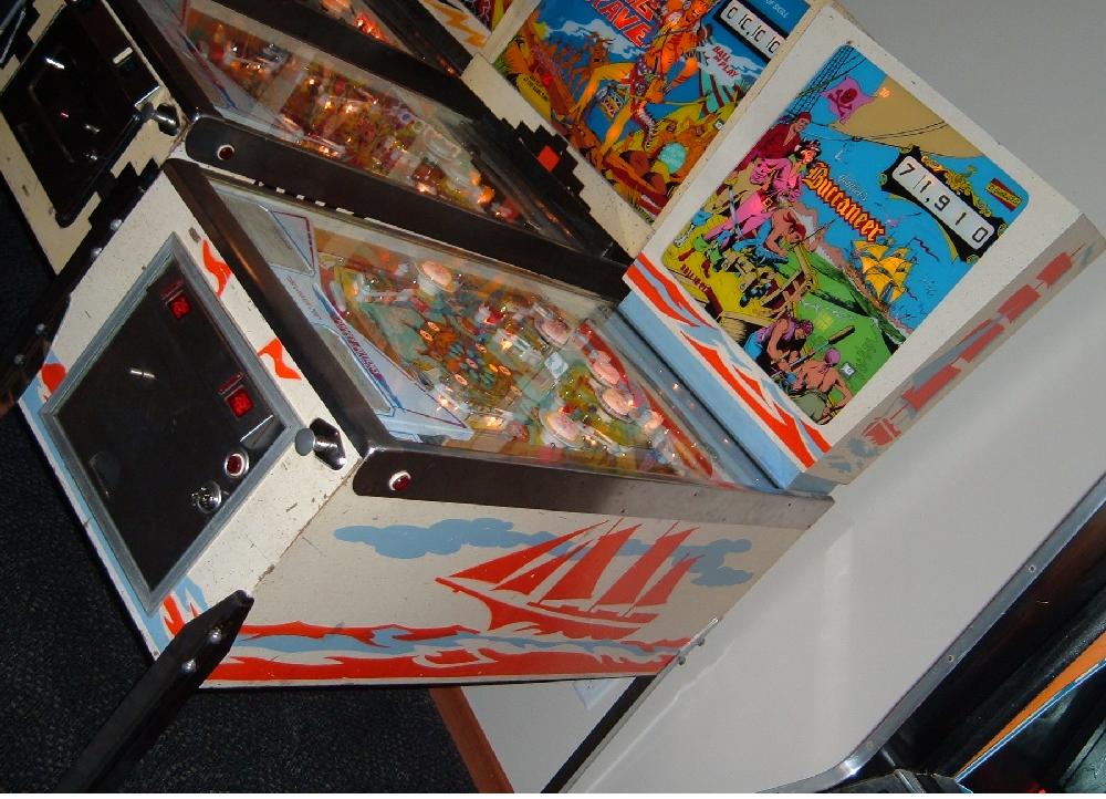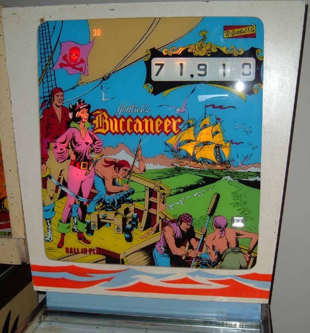 1976 Gottlieb Ship Ahoy (1 player add-a-ball) Description: Gottlieb Buccaneer pinball, Gottlieb Ship Ahoy pinball. Lots of pop bumpers. Single player wedgehead cabinet design. They made 3650 Gottlieb Buccaneer pinballs in the replay version, and 1150 Gottlieb Ship Ahoy add-a-ball pinballs. If you have a Gottlieb Buccaneer or Gottlieb Ship Ahoy for sale, please contact me at cfh@provide.net
