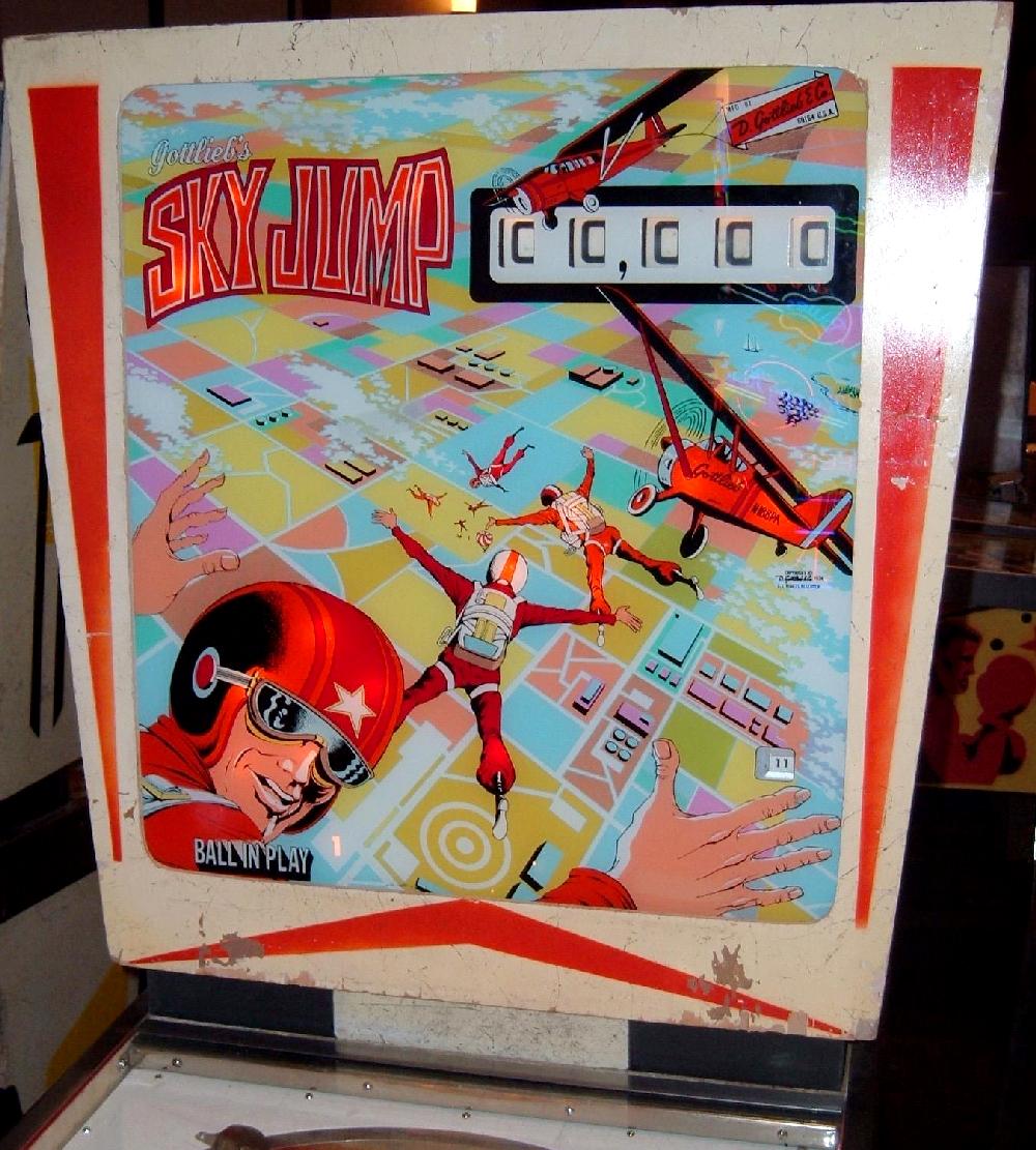 Description: Gottlieb Sky Jump pinball. Same game as Gottlieb Free Fall pinball. Bank of 7 drop targets, 3 pop bumpers, 2 slingshots, two 3" flippers. Single player wedgehead cabinet design. They made 4200 Gottlieb Sky Jump pinballs in the replay version, and 3450 Gottlieb Free Fall add-a-ball pinballs. If you have a Gottlieb Sky Jump pinball for sale, please contact me at cfh@provide.net