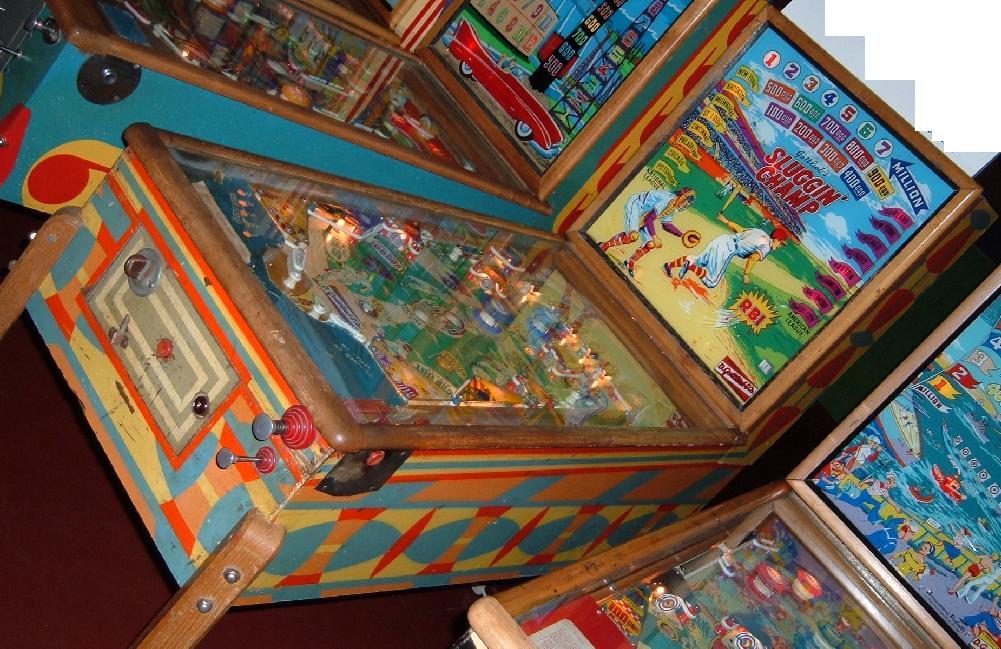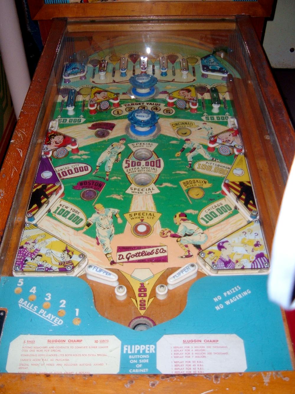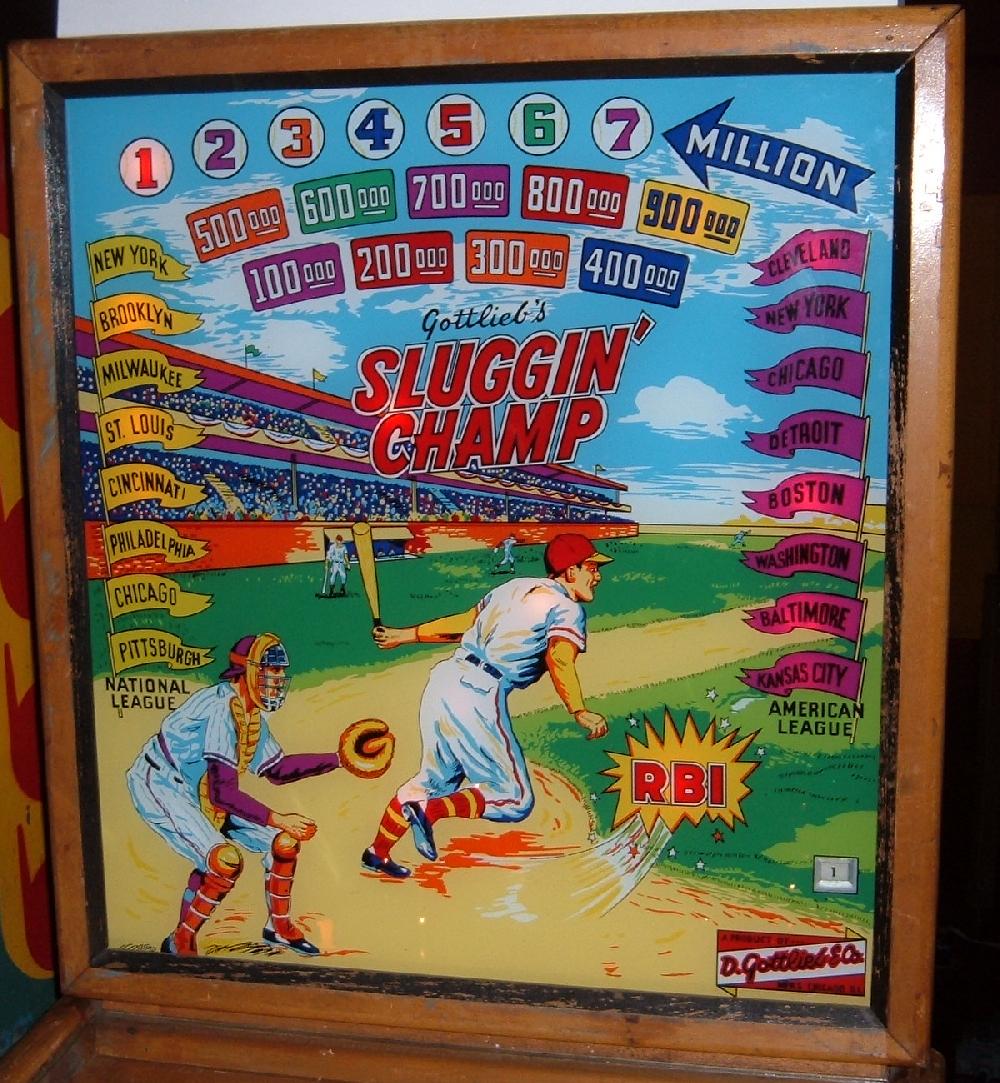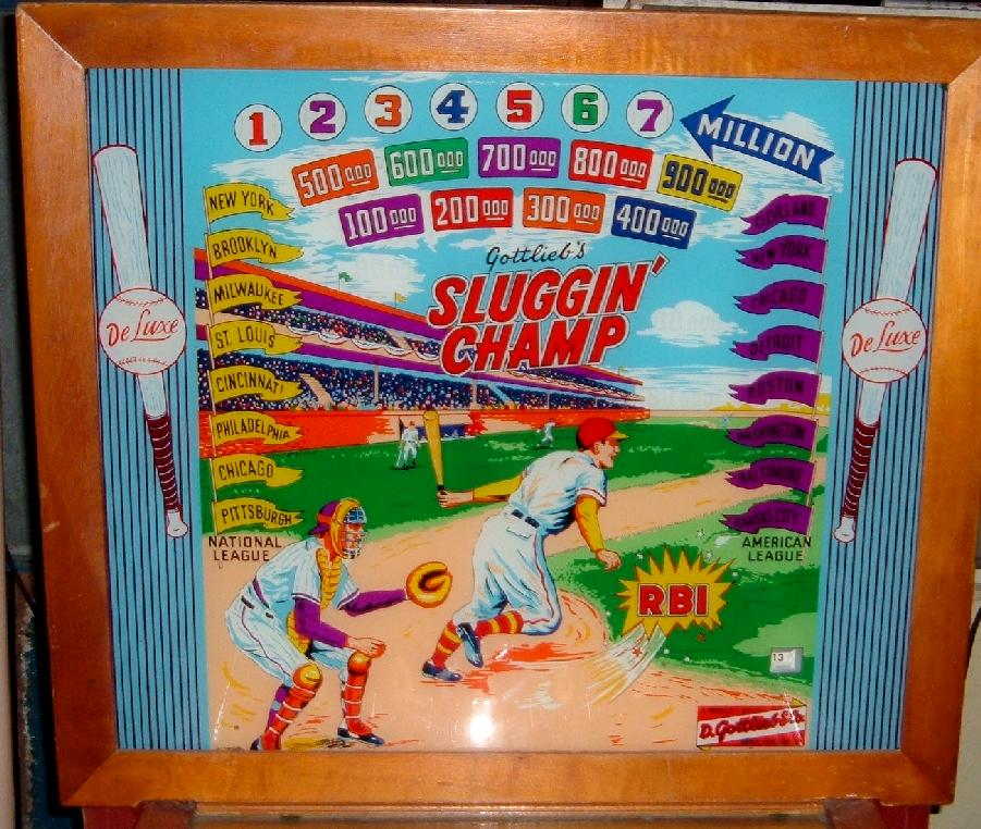 Description: Sluggin' Champ, Slugging Champ Deluxe, 4/55, came in a regular single player cabinet or a "deluxe" cabinet (larger 2 player cabinet, not as desirable), "balls played" ball arch lights. Note the backglass is different for the two different cabinet styles. The larger 2 player cabinet is not as desirable due to a larger footprint, and also that the game is not as much fun to play (the larger cabinet can not be easily "shook" to influence the ball movement). Woodrail pinball. Artwork by Roy Parker. If you have a Gottlieb Sluggin Champ pinball for sale please contact me at cfh@provide.net