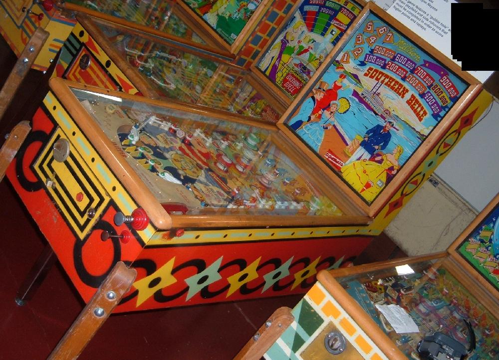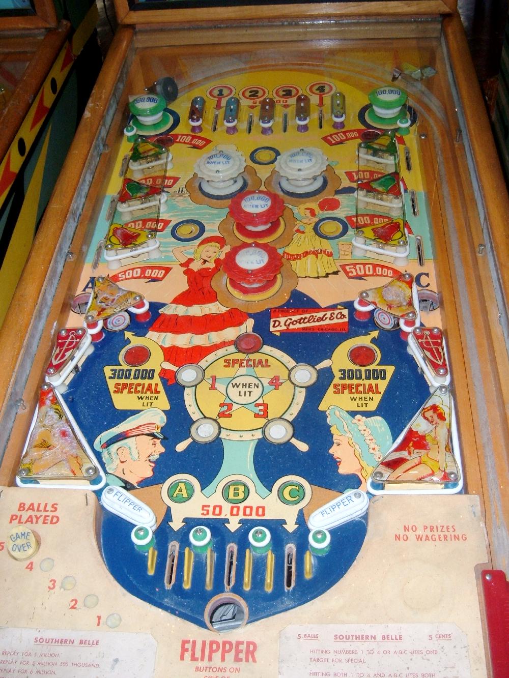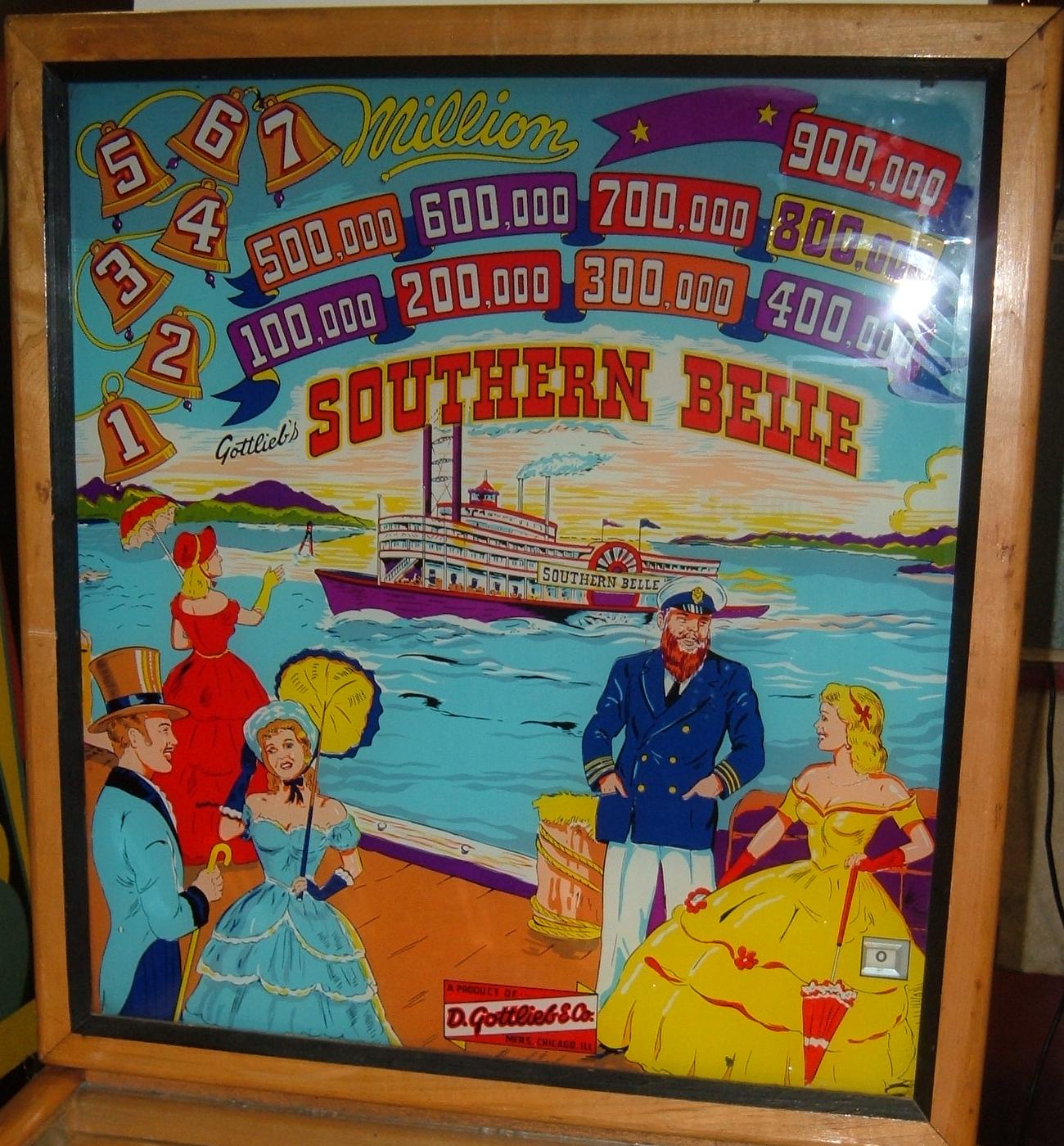Description: Southern Belle, Gottlieb, 6/55, 1000 produced, 2 gobble holes, "balls played" ball arch lights. Woodrail pinball artwork by Roy Parker. If you have a Gottlieb Southern Bell pinball for sale please contact me at cfh@provide.net